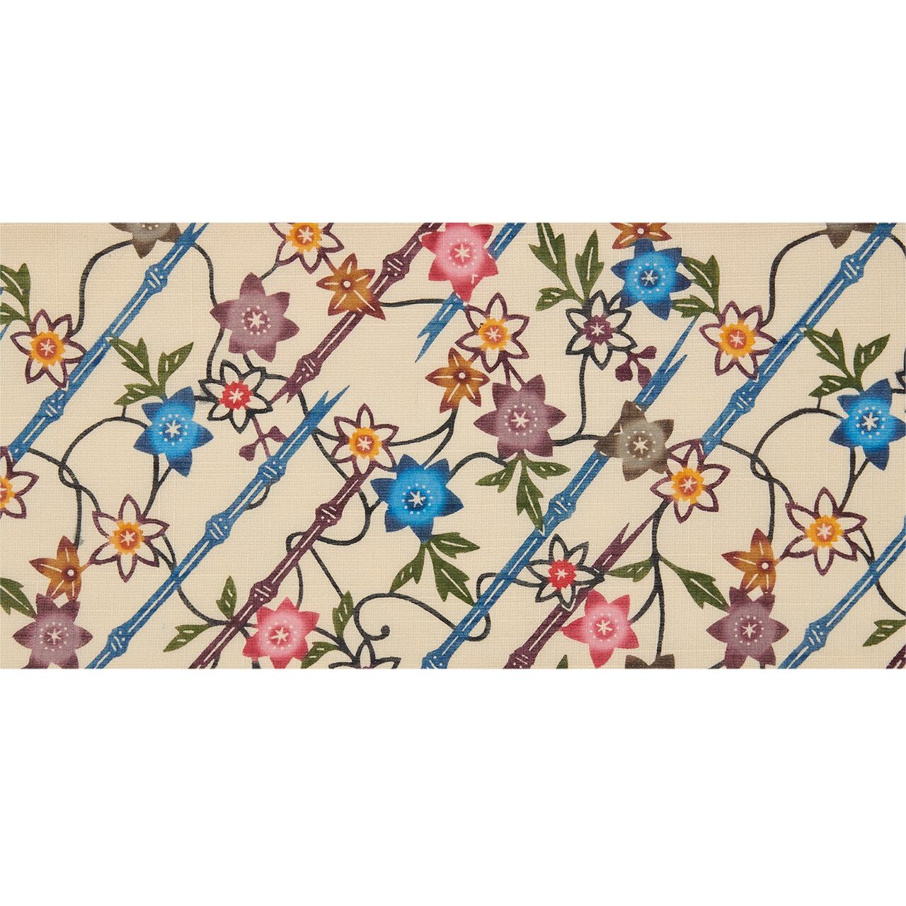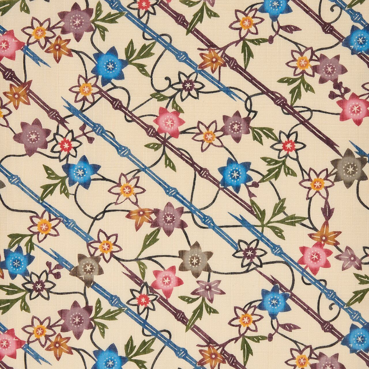 こちらは紅梅織のように、小さな格子の模様が少し太い糸で織り込まれたさらりとした夏紬のような生地に、シャープな印象の竹垣が斜めの線で取られ、それに絡みつくように蔓を伸ばして咲くテッセンのお花が色とりどりに染められた、素敵な紅型染の九寸名古屋帯です。