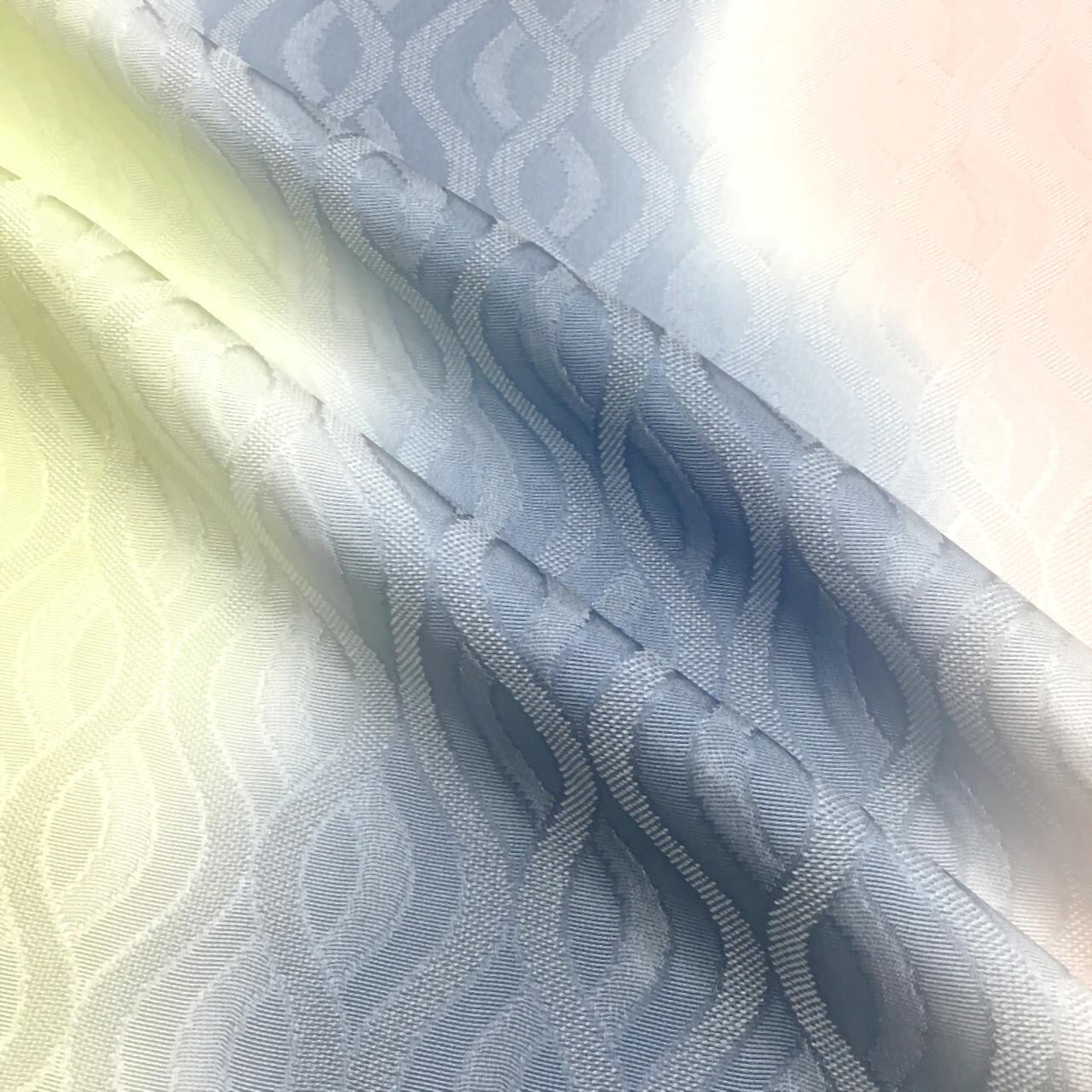 立涌地紋に明るい水柿色と舛花色と若菜色の三色がよろけ縞に暈しで染め出されています。
