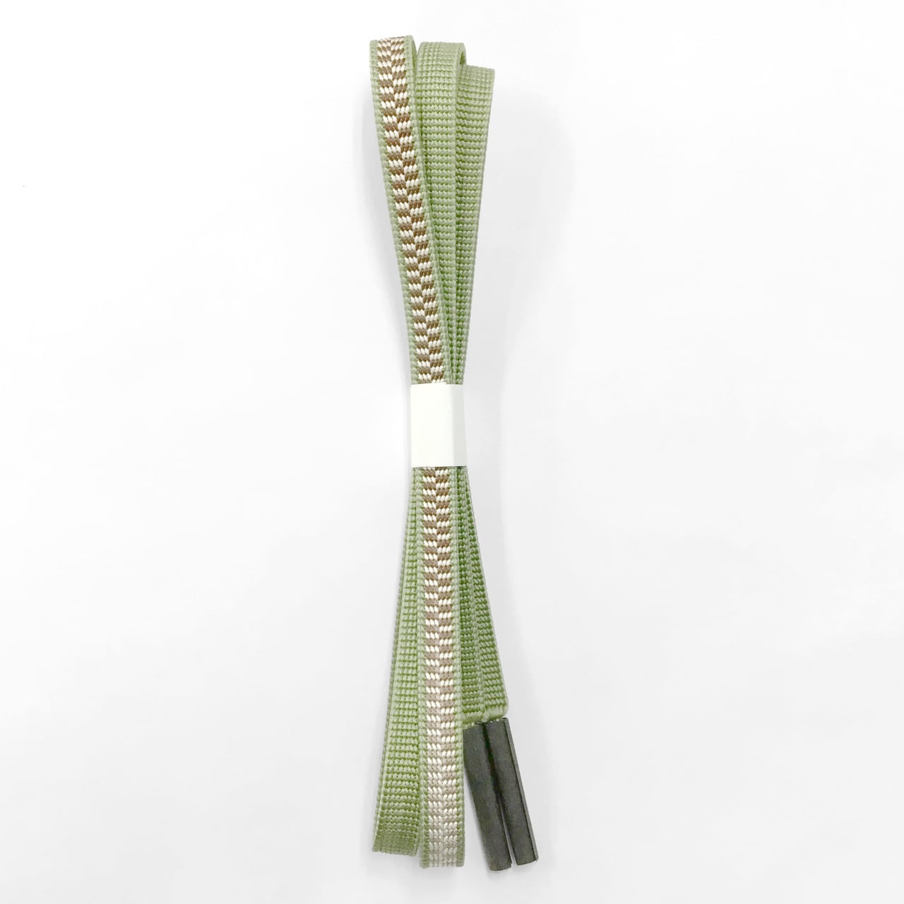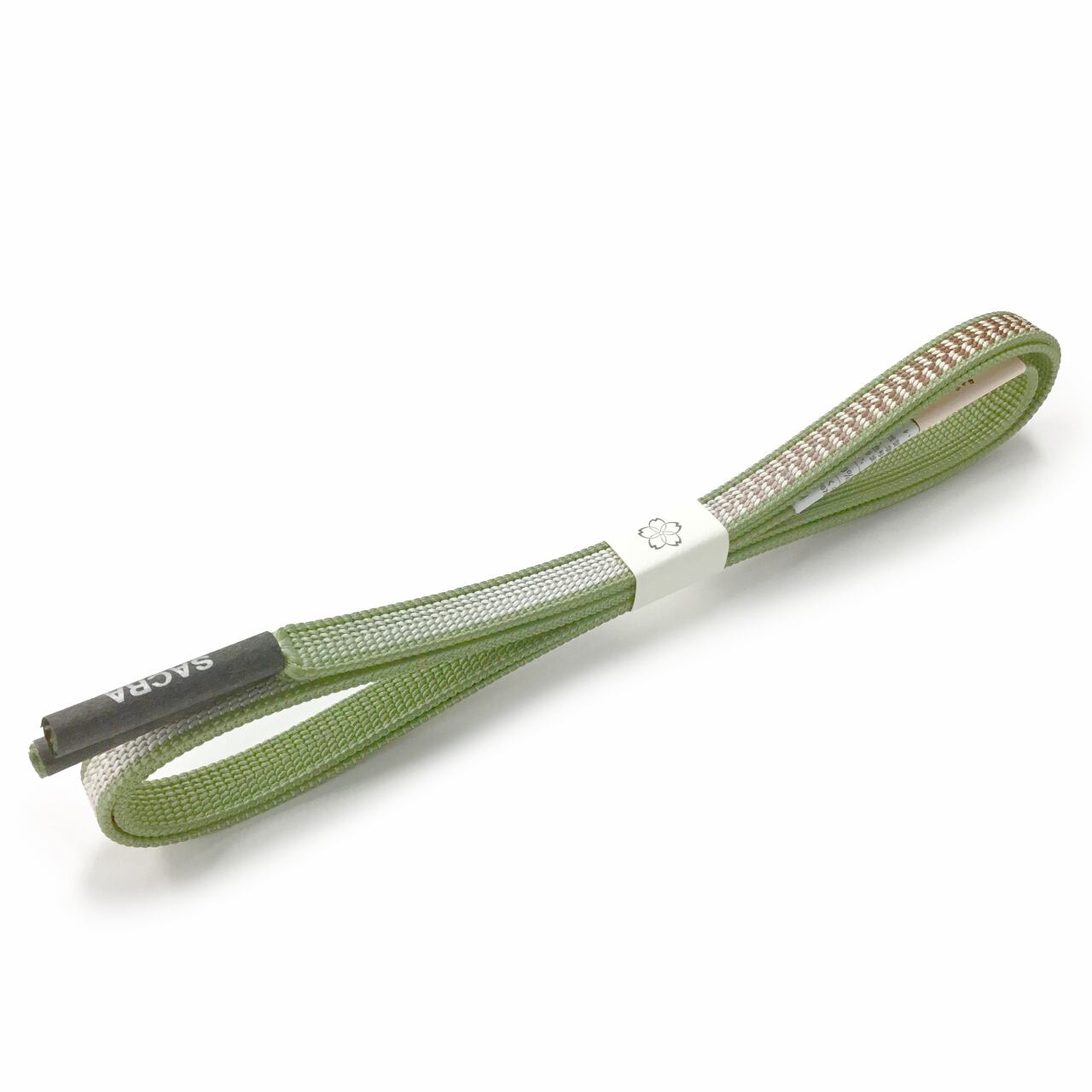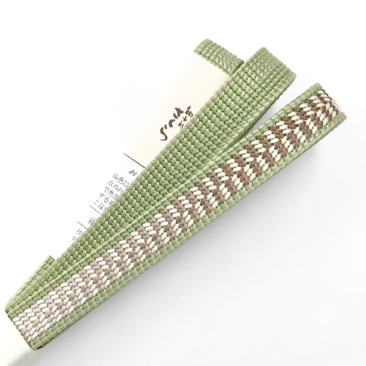 「平源氏組」で山葵色地に象牙色と茶褐色がぼかし市松柄に組まれています。