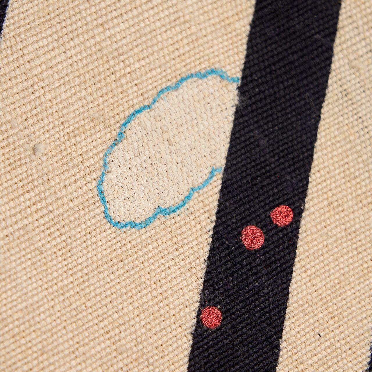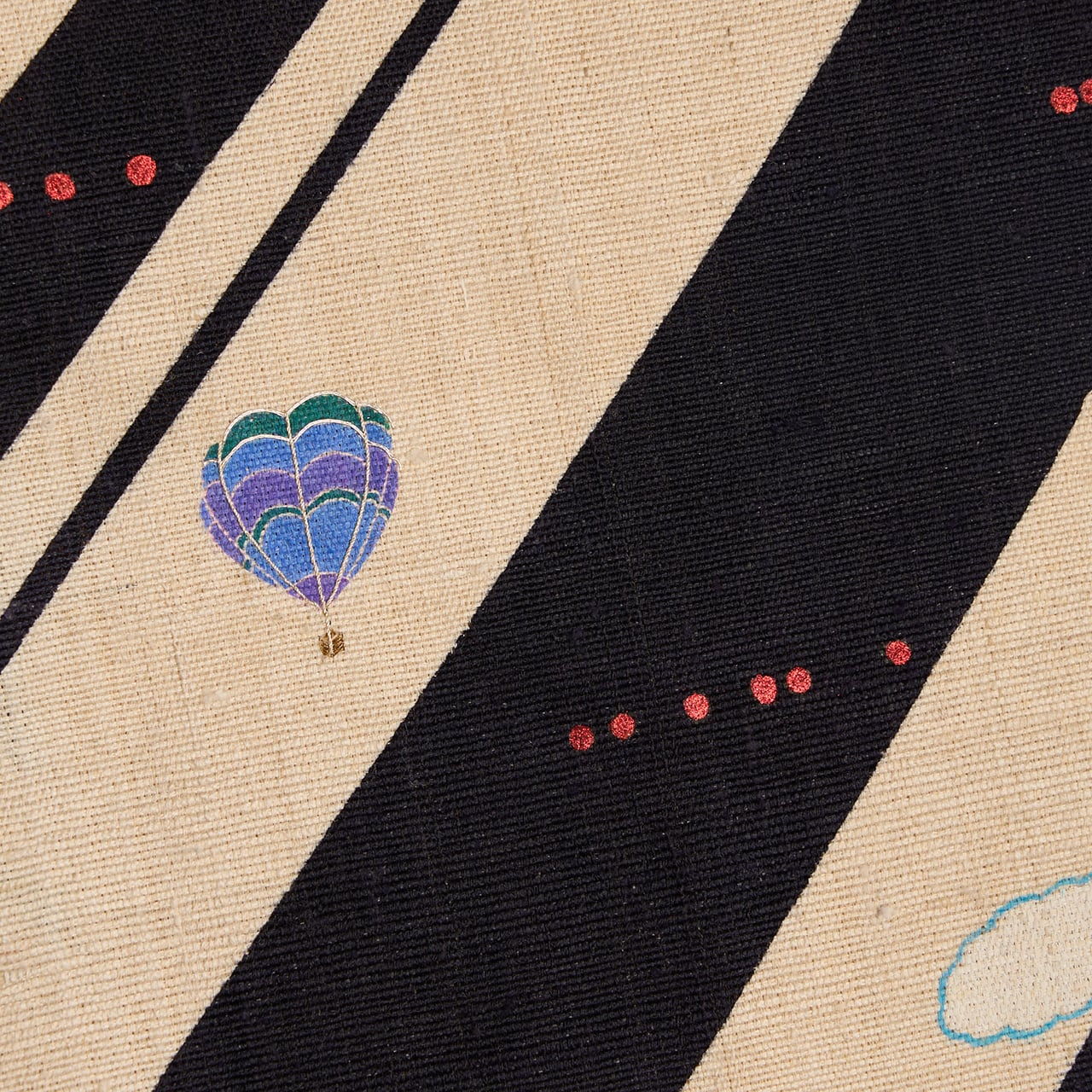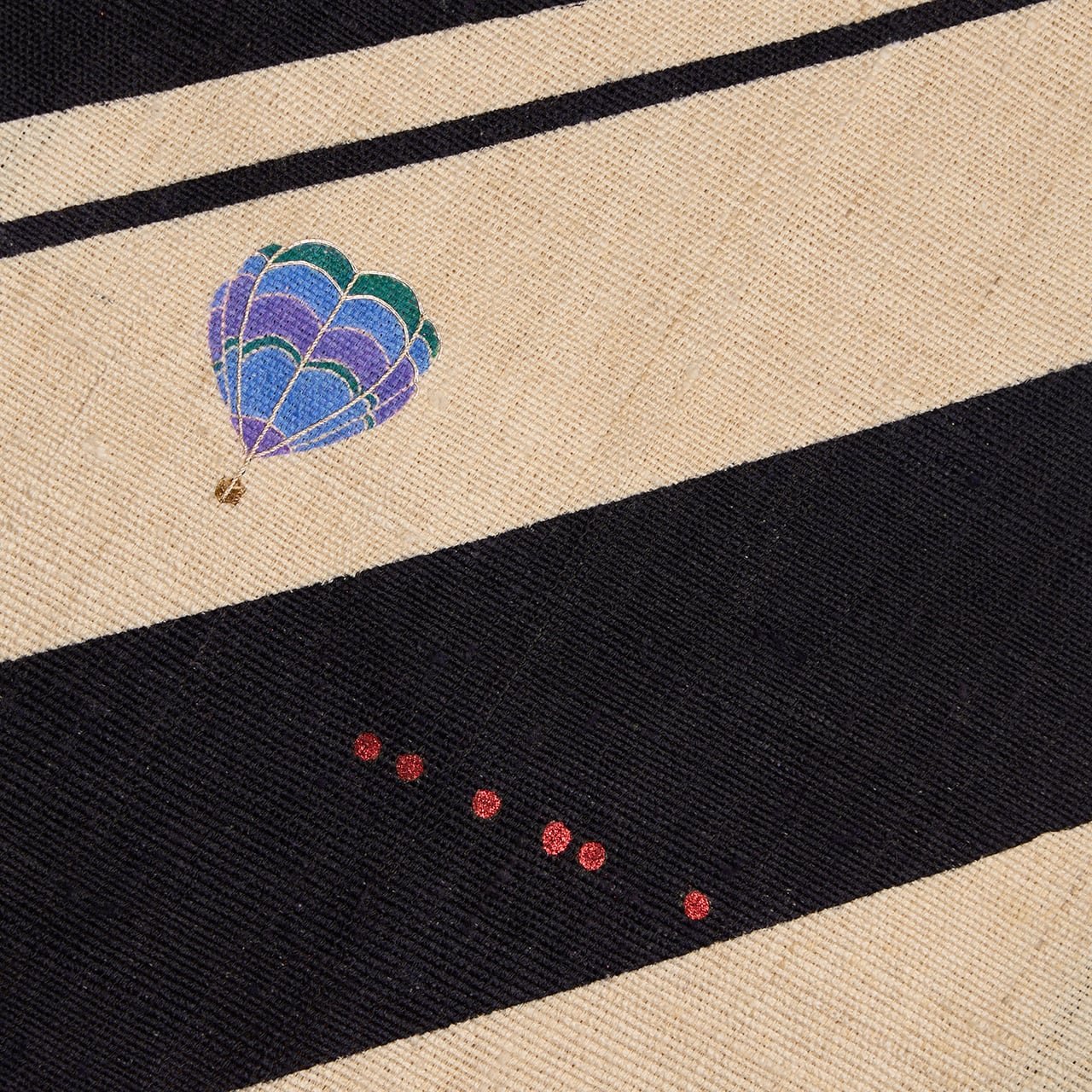 経緯とも少しざっくりとした太めの麻の糸で織られた象牙色の生地に、お太鼓に大きく斜めの線が黒で引かれ、その合間に綺麗な色の気球と白い雲がのぞく様子が細やかな友禅で描かれた、少しメルヘンティックな雰囲気の夏の九寸名古屋帯です。