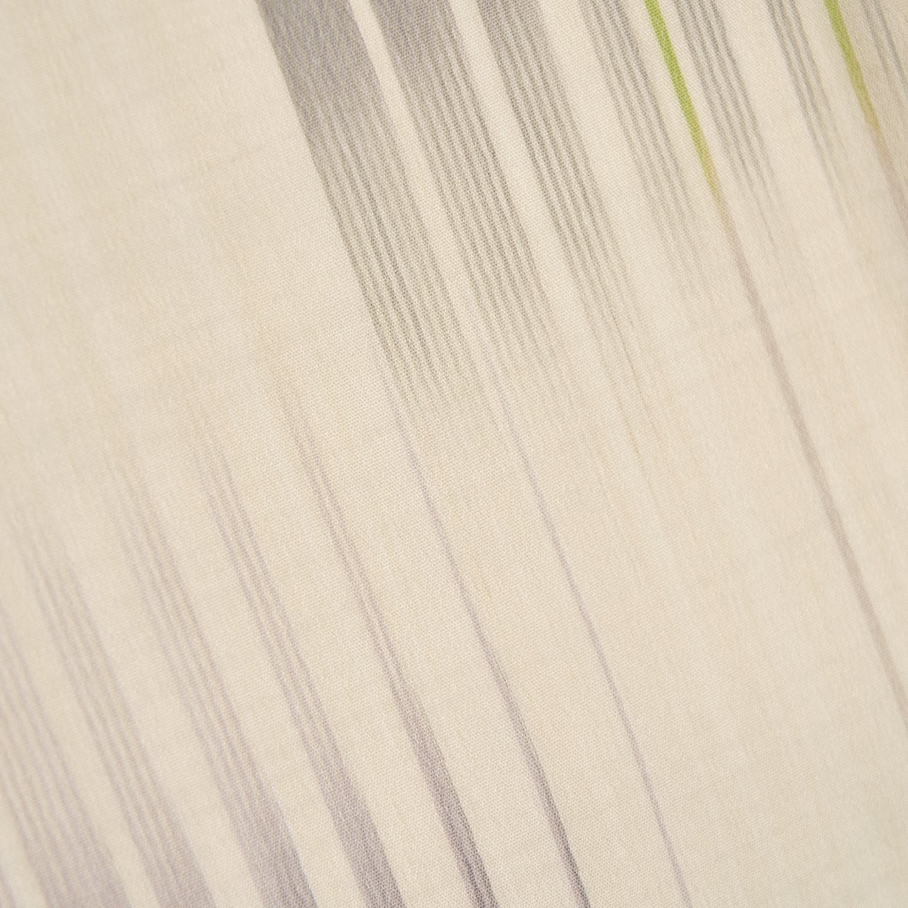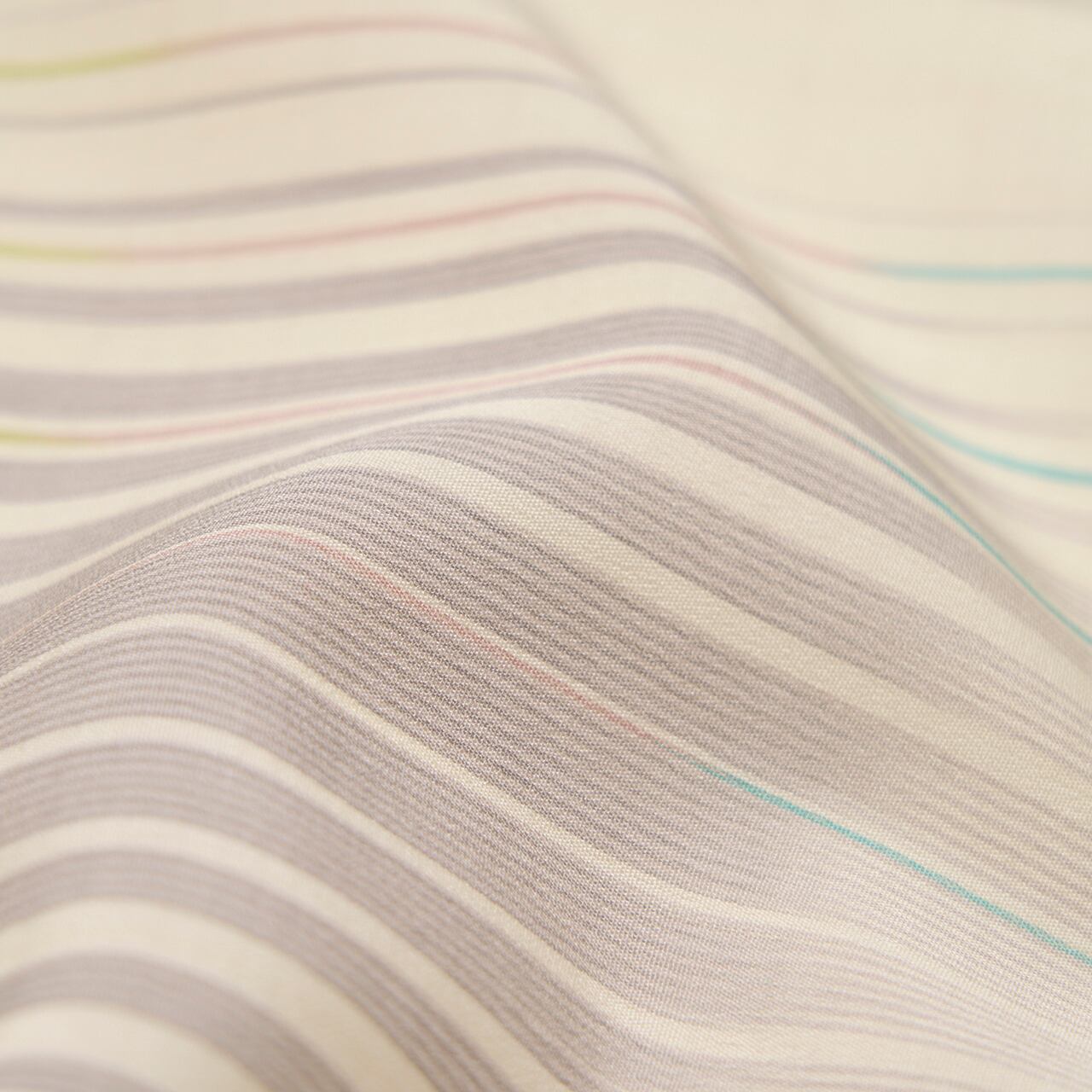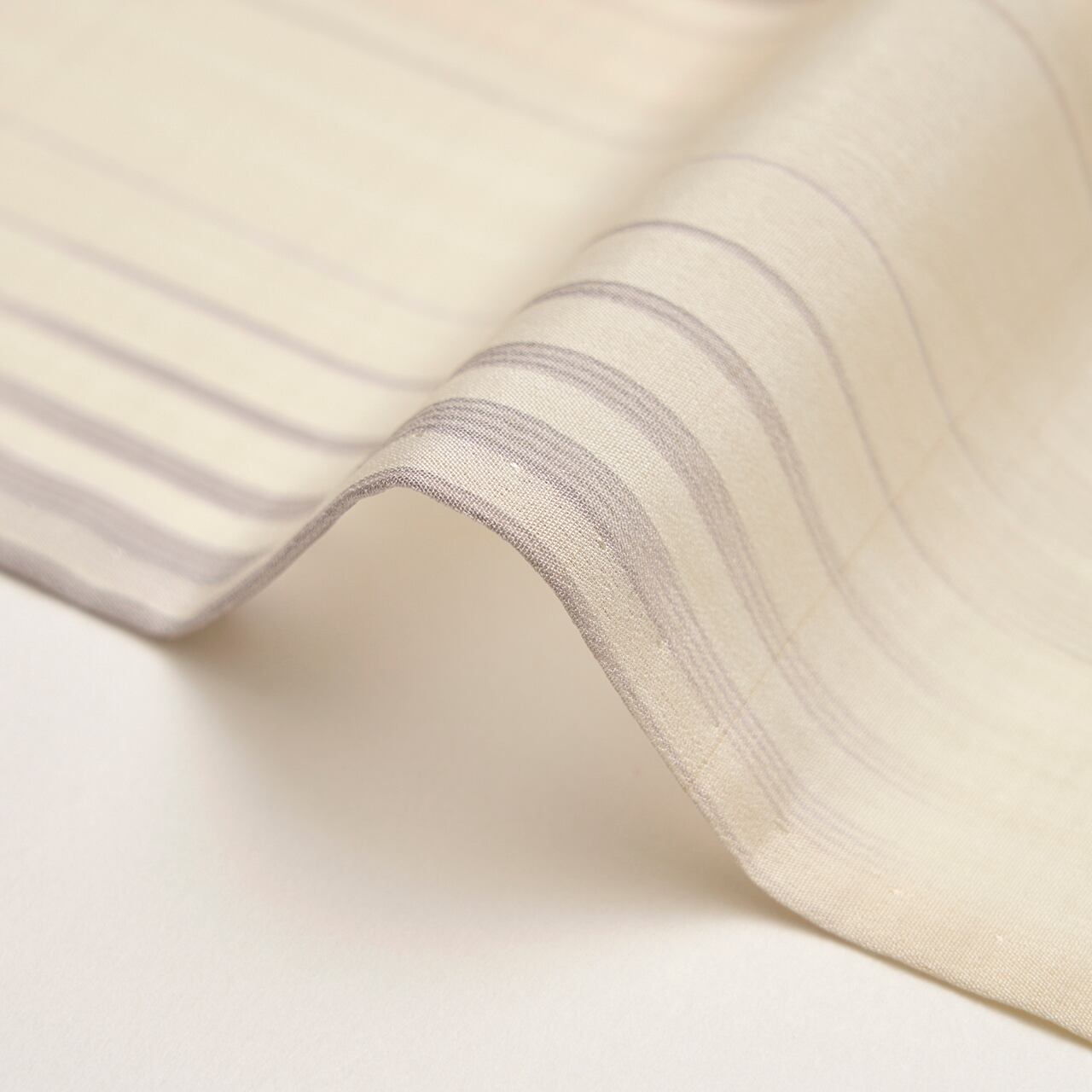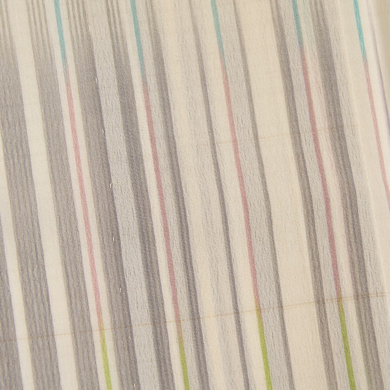 こちらはさらりとした象牙色の地に、シックな淡いグレー・薄墨色と、少し赤味のあるグレー・源氏鼠色の絣縞が変わり市松の配置で織られ、それを突き抜けるように、鮮やかな蘇芳香色と天色、鶸萌黄色に変化する縞が織り込まれています。