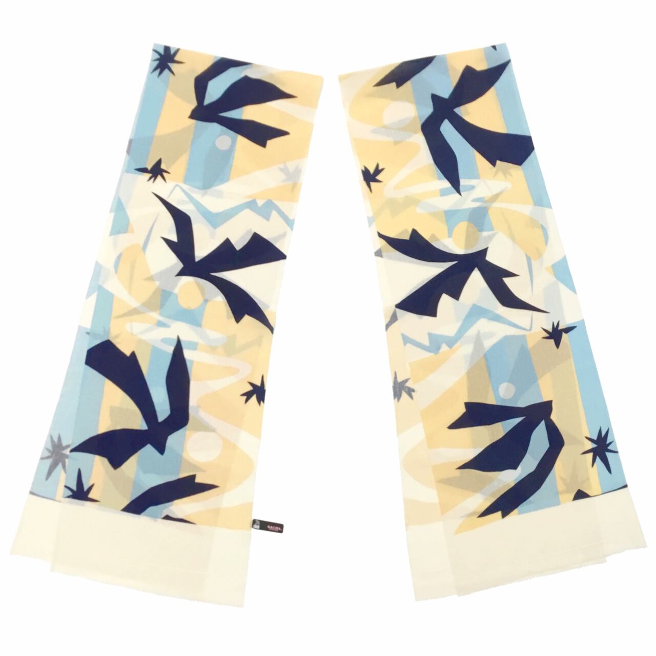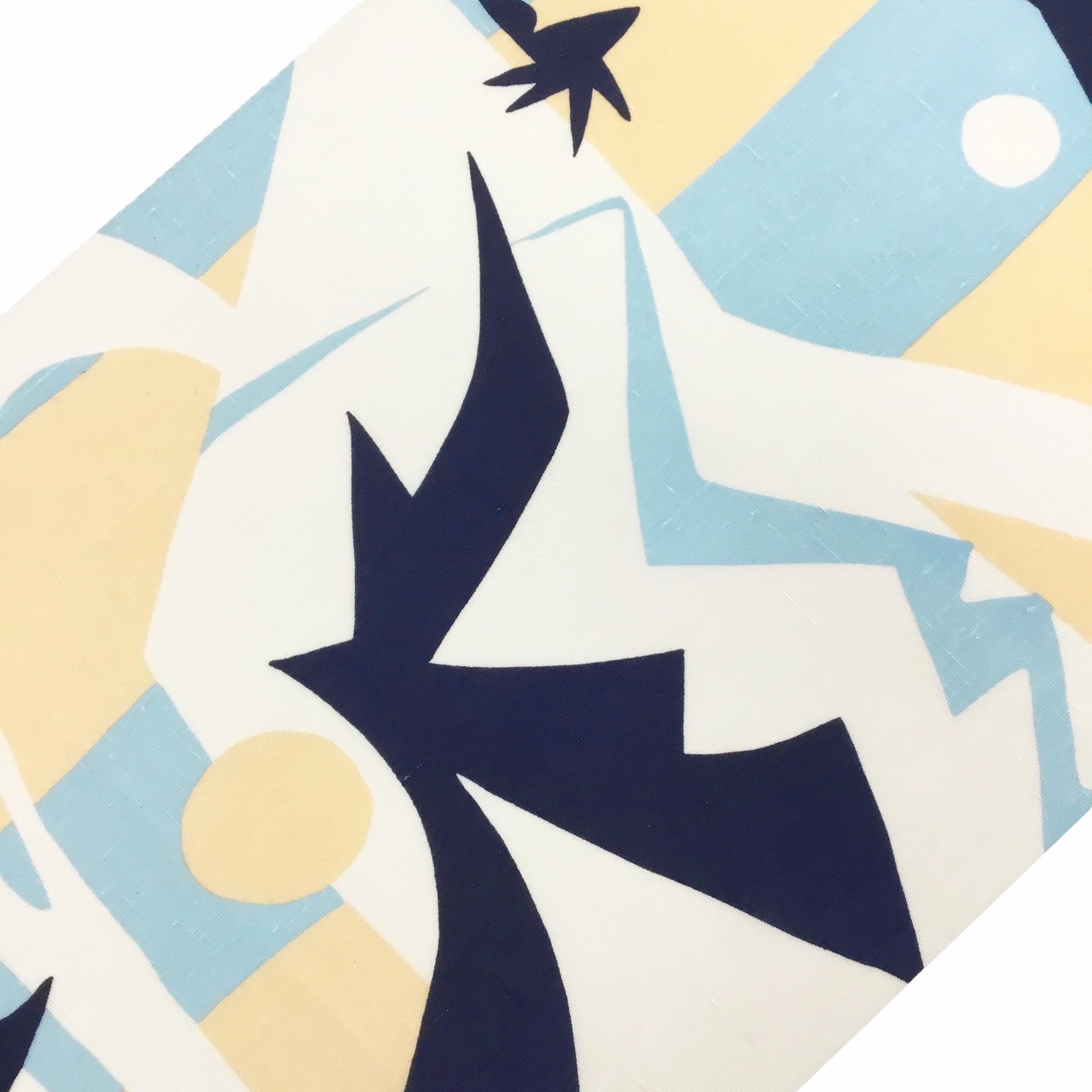 生成り色地に空色と蜂蜜色と濃い鉄紺色で、アンリ・マティスの絵画をオマージュした鳥や動きのある記号などの模様が友禅で染められた、モダンな帯揚げです。