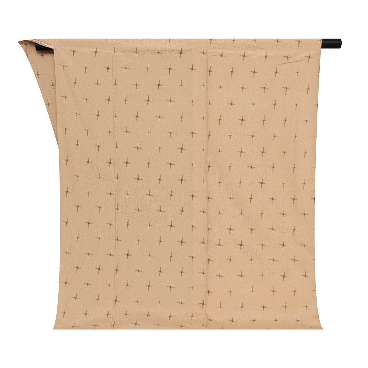 少しだけオレンジ味のあるベージュ・枯色のお召織の生地に、変り井桁のような、十字の絣が黒と海老茶色の糸で全体に織り出された、とてもお洒落な単衣のお着物です。