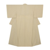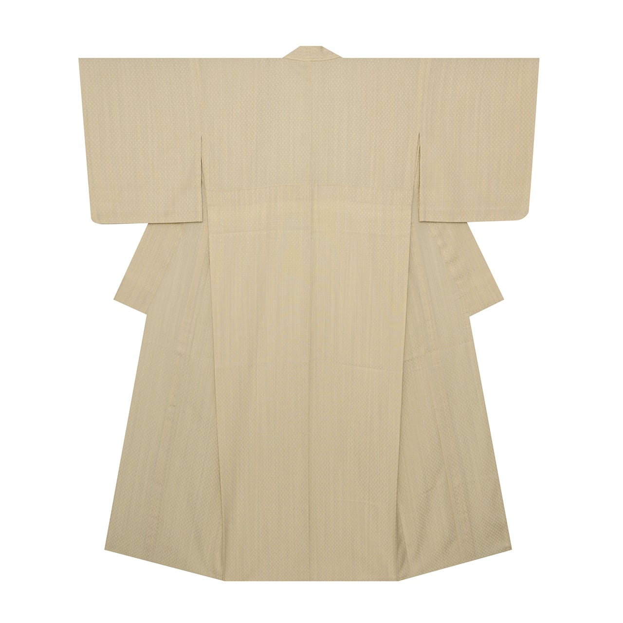 一見無地に見えるような淡い色使いで織り出された縞模様をベースにして、細かい花織のような模様の浮き織が織り込まれた、輝くような光沢のある、少し珍しいタイプのとても素敵な塩沢お召の単衣のお着物です。