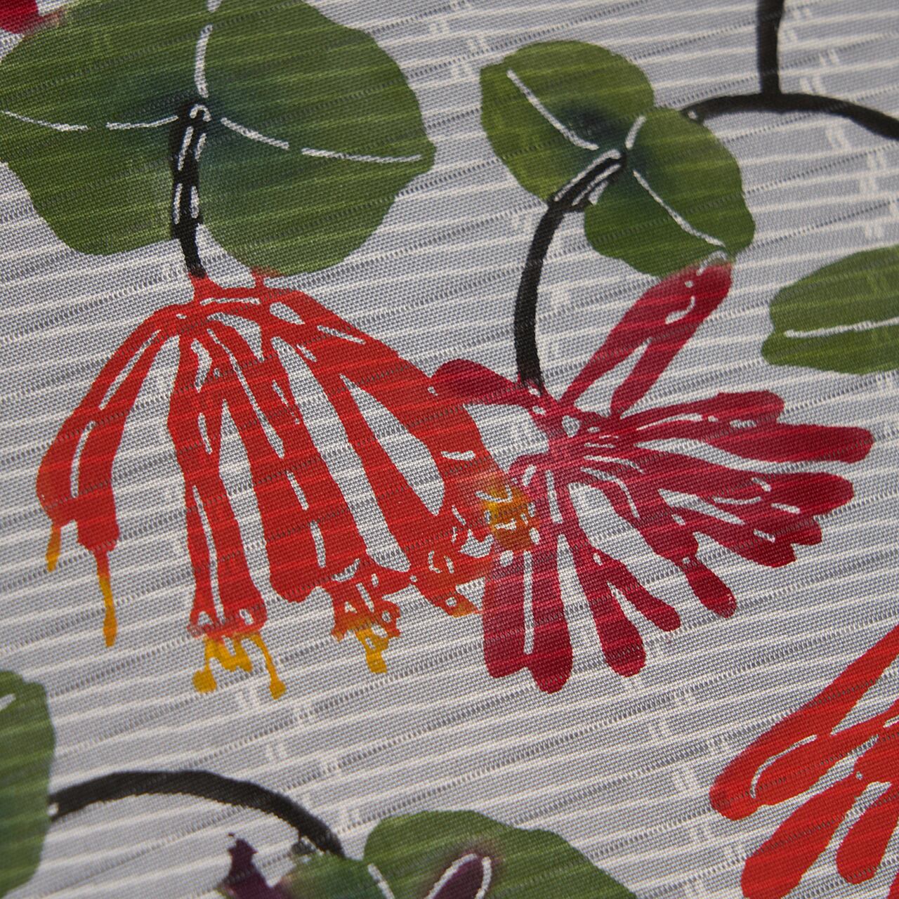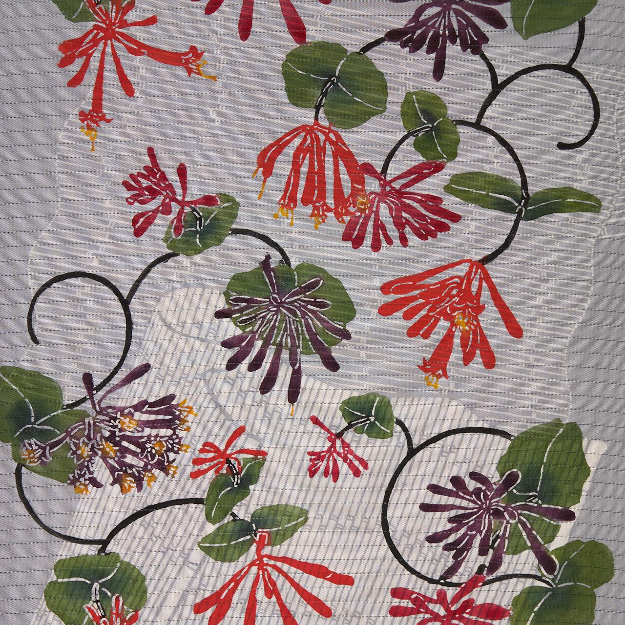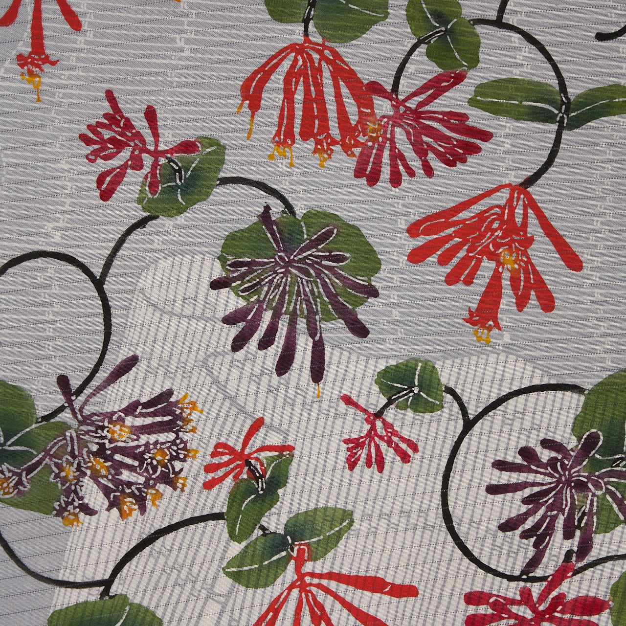 五泉のしなやかな絽塩瀬の生地が、ノーマルの綺麗なグレー・錫色に染められ、夏の暑さをよけるために立てかけられた葦簀(よしず)を背景に、元気よく蔓を伸ばしてたわわに咲く忍冬(すいかずら)のお花が型絵染で描かれた、素敵な夏の九寸名古屋帯です。