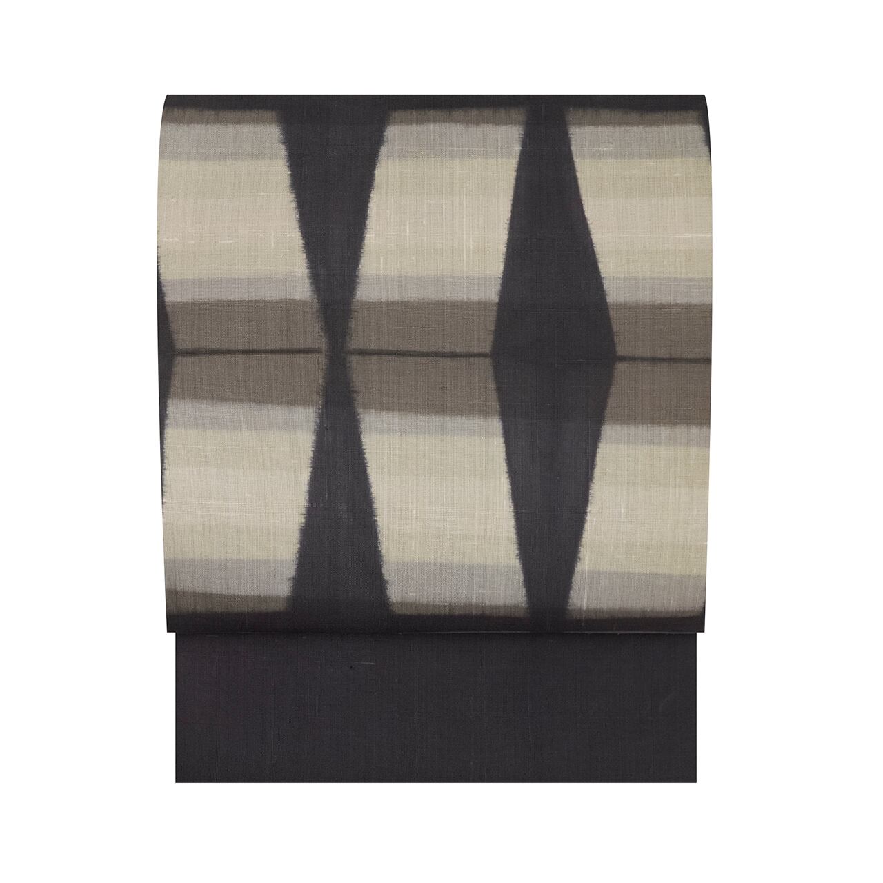 非常に細い糸で織られたシャリっとした生紬の生地が、藍味のある濃い鼠色・藍墨茶色をベースにして、平行四辺形の四角がジグザグのような形に並び、その中が煤色、銀鼠色、そして絹鼠色といったグレーの濃淡が染められた、とてもお洒落な雰囲気の板締絞りの九寸名古屋帯です。