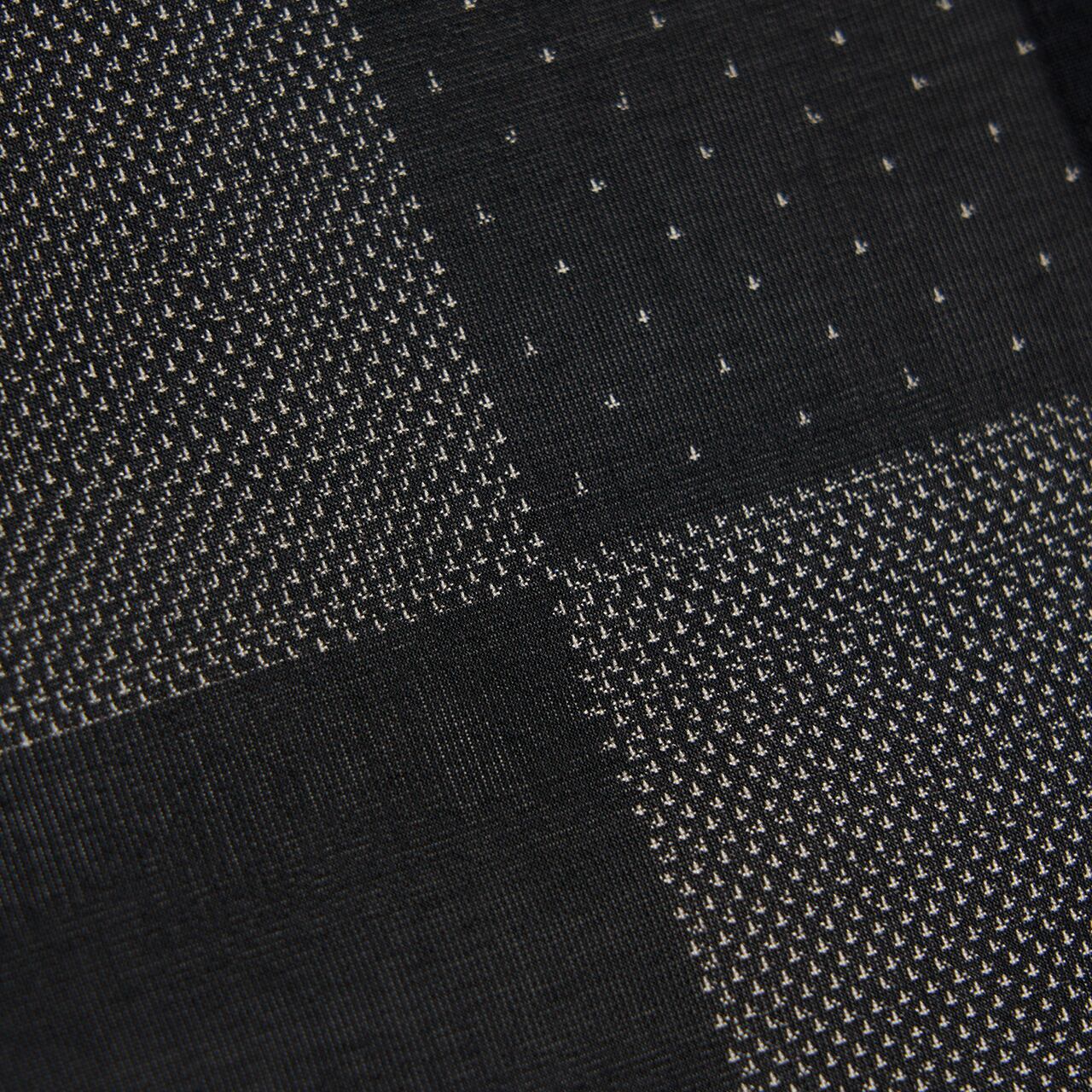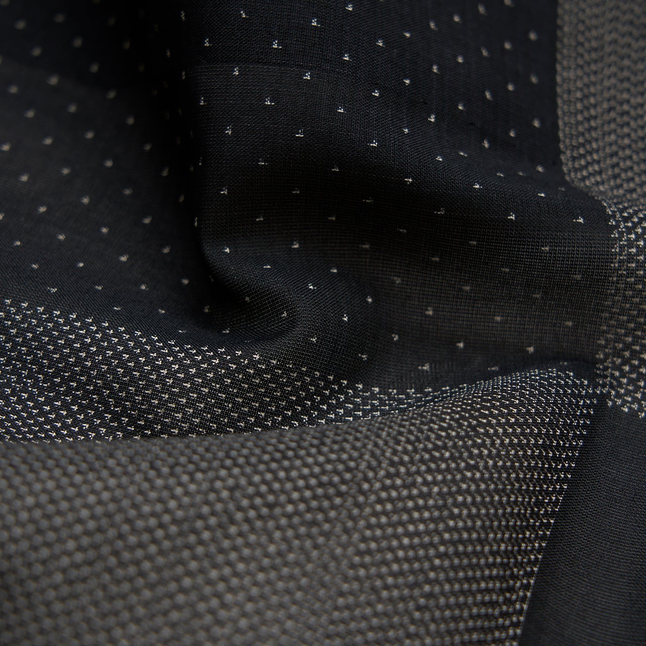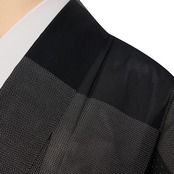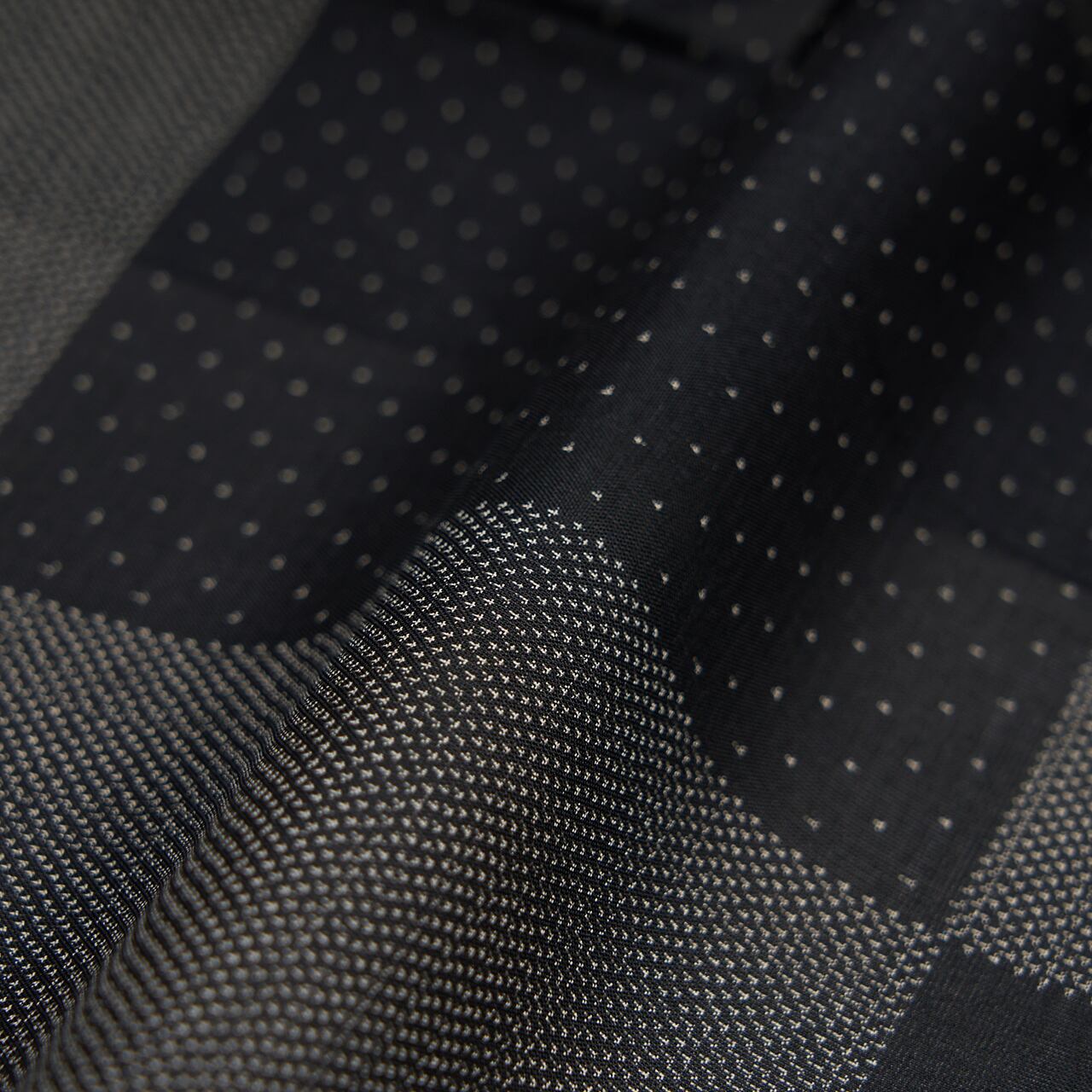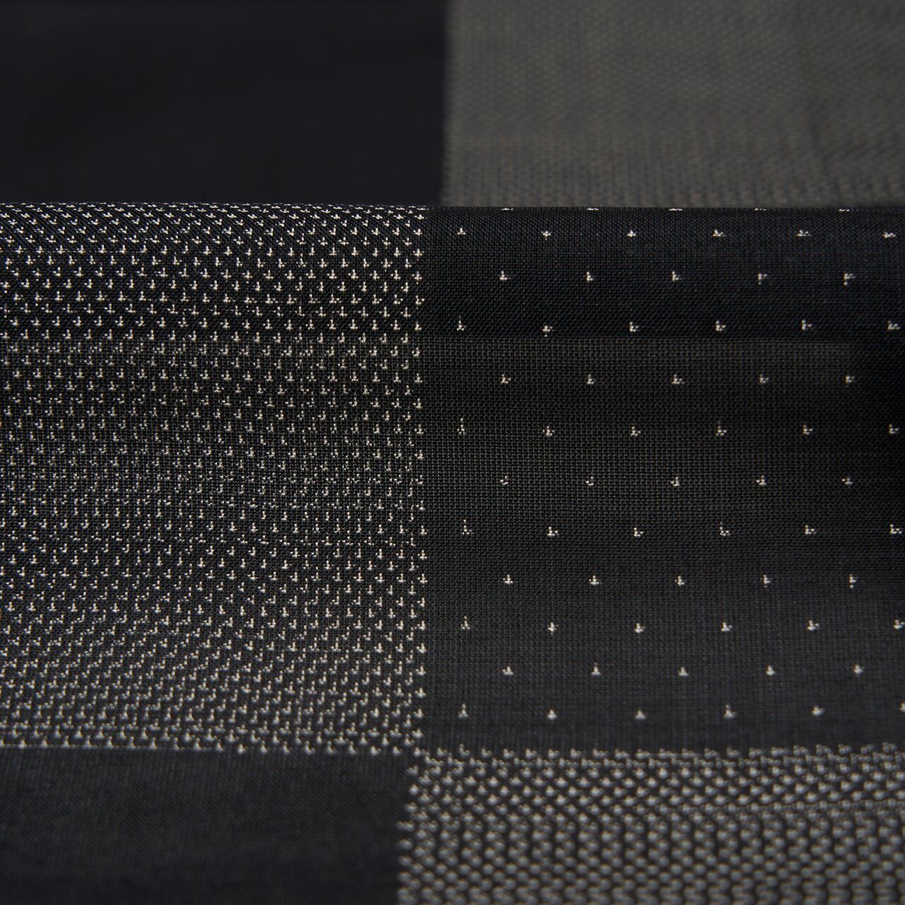 黒地に、無地の四角と密度を変えて織り分けられたカ絣の四角で、大きな市松の模様が織り出された、さらりとした手触りの良い質感のお洒落な夏大島紬のお着物です。