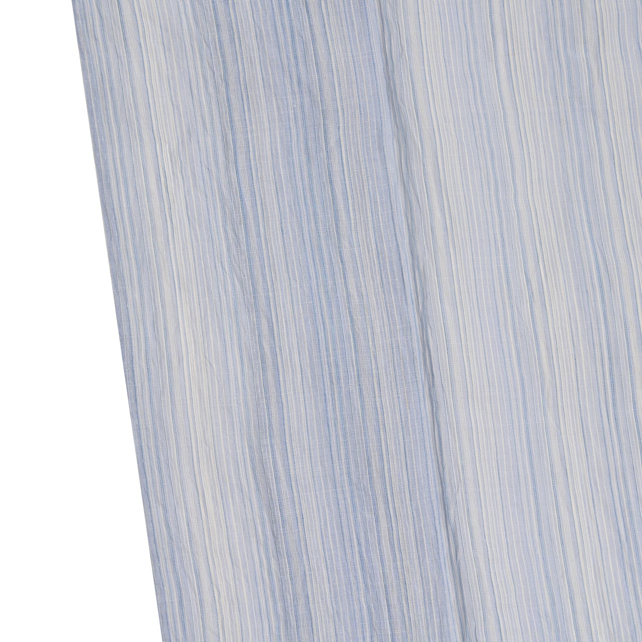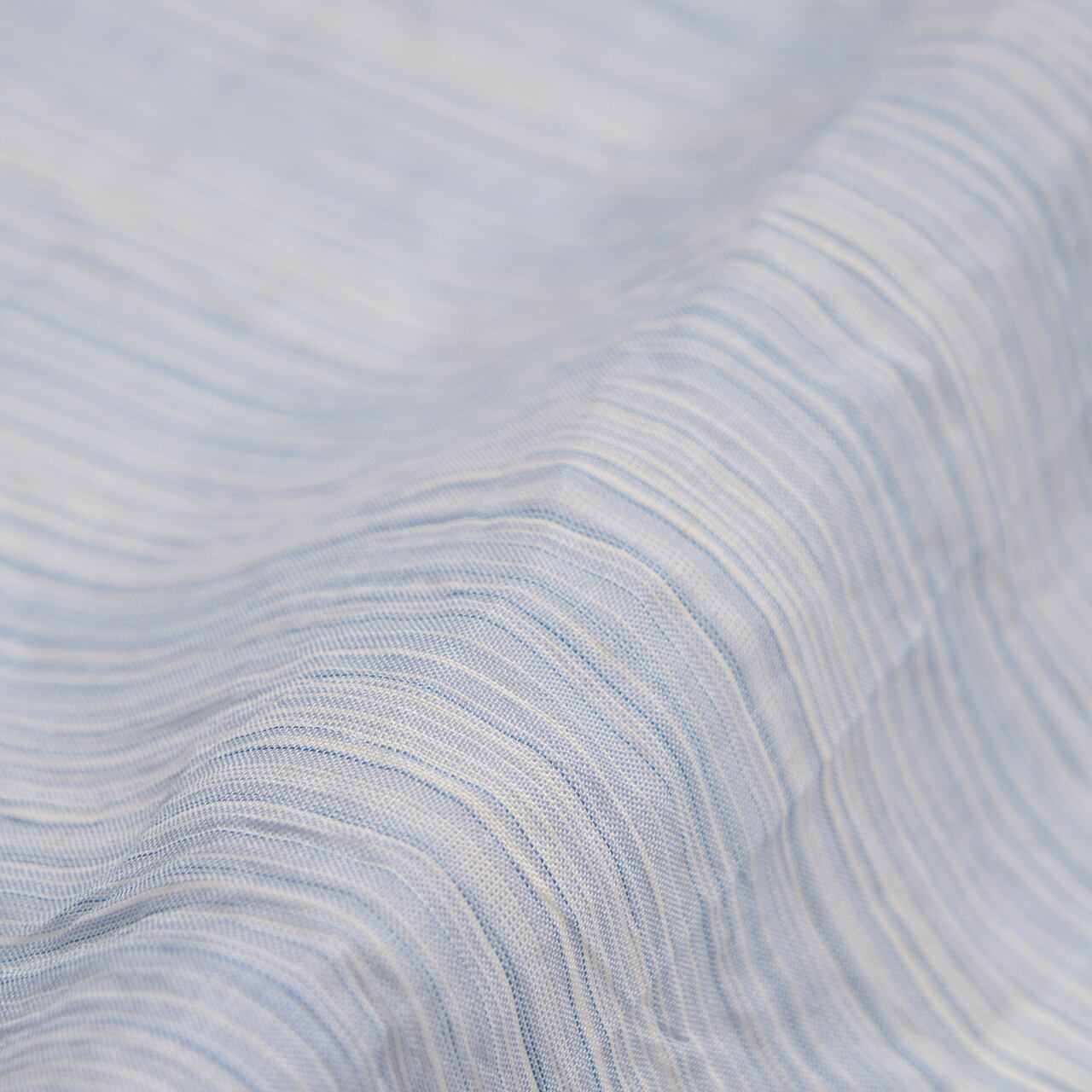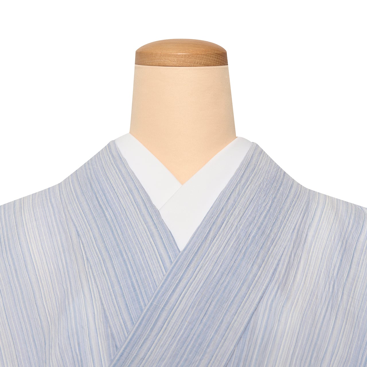 藍をずっと薄くしていったような水色・薄花色から、生成りの糸が細く太くランダムに並んでグラデーションの縞模様が織り出された、涼感溢れる清々しい印象の小千谷ちぢみの単衣のお着物です。