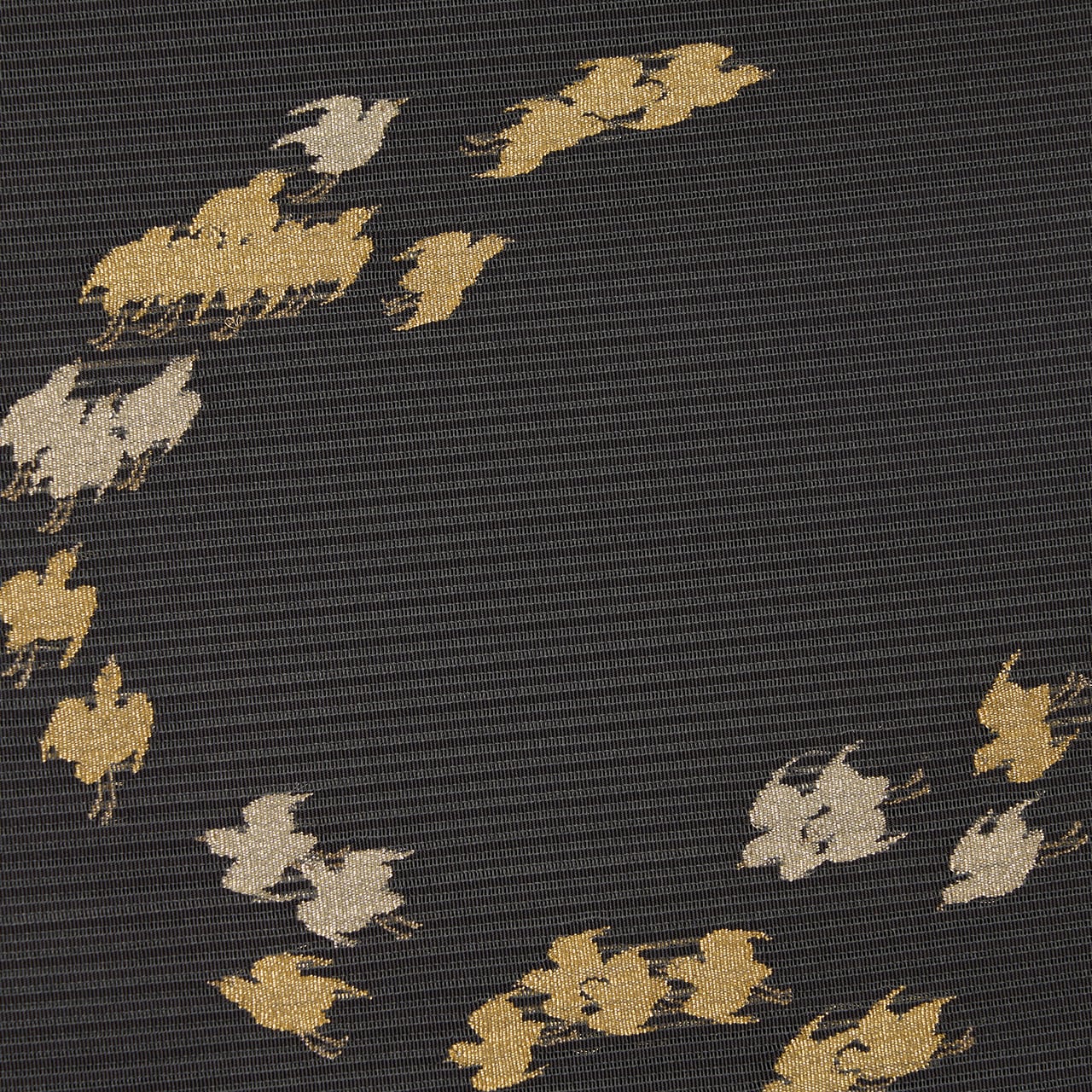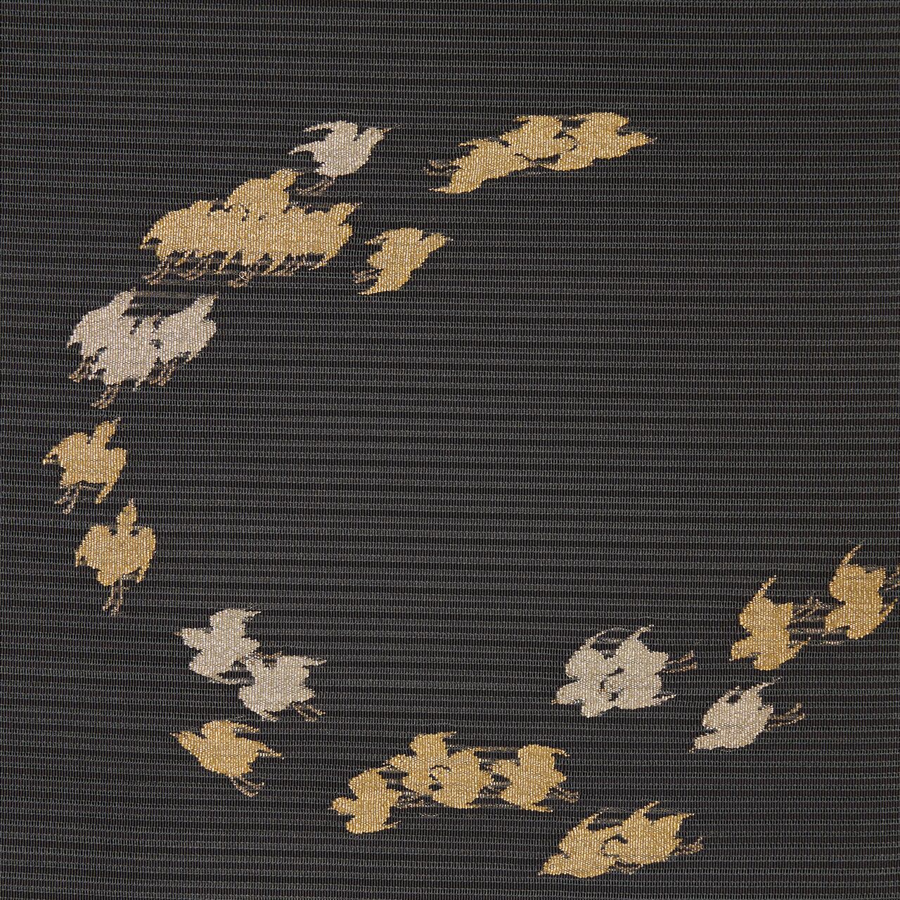 深いこっくりとしたグレー・藍墨茶色の絽綴れの地に、お太鼓に弧を描いて旋回するように飛ぶ、姿の良い千鳥の群れが細かい金糸・銀糸の糸を使って綴れ織で美しく表された、とても素敵な夏の二部式の八寸名古屋帯です。