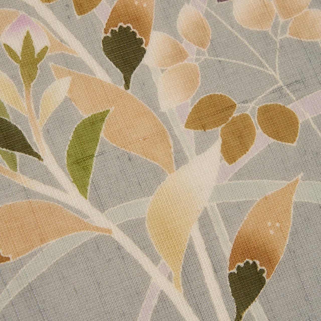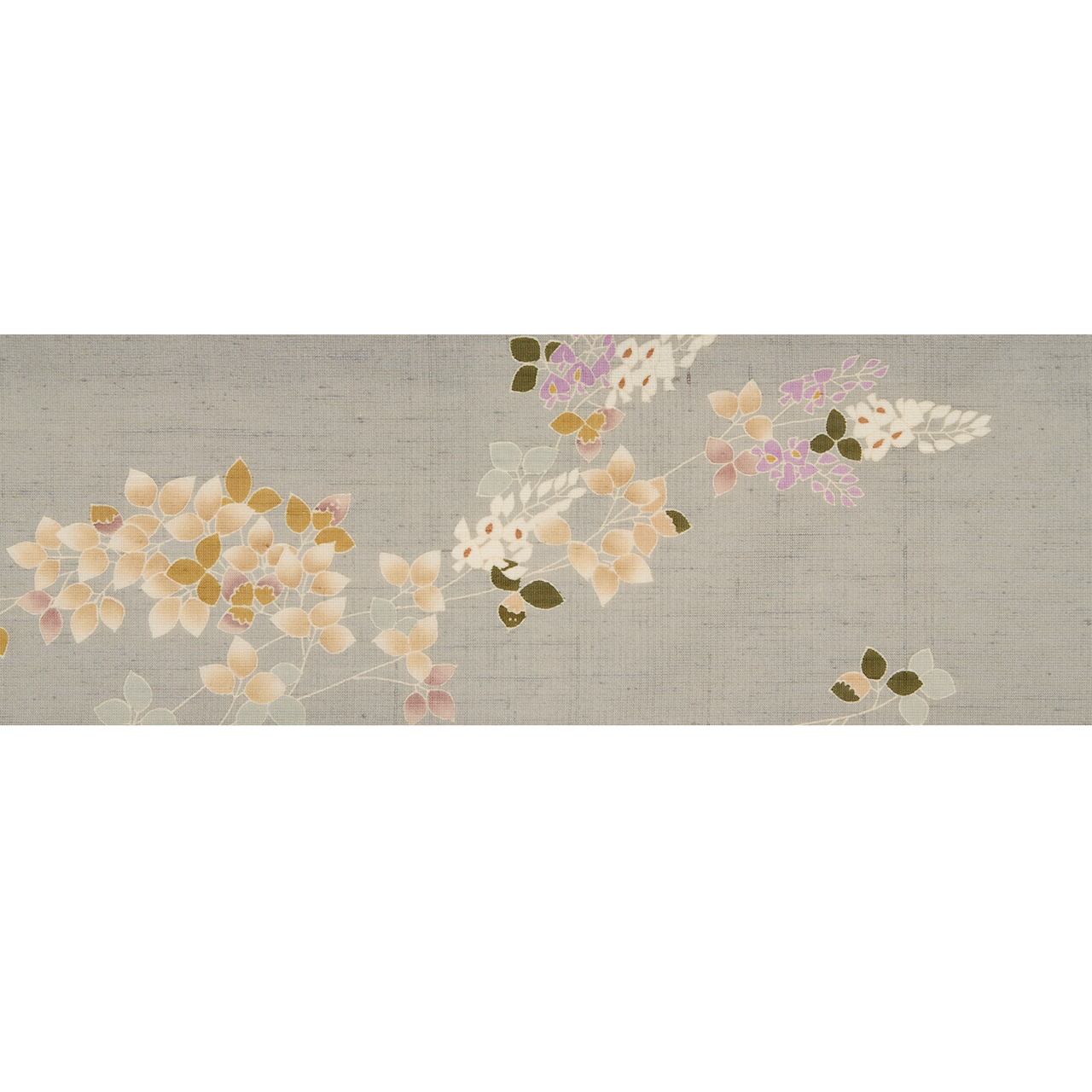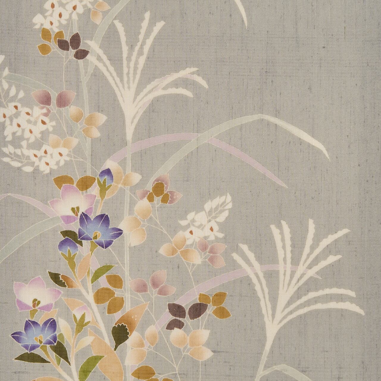横に縞のような線と少しだけ節のある座繰りのような紬紗の生地が、淡く澄んだグレー・薄鈍色に染められ、ススキや桔梗、虎の尾のような草花が左寄りに描かれ、そのかたわらを飛ぶカゲロウの姿が手描きの友禅で描かれた、夏の九寸名古屋帯です。