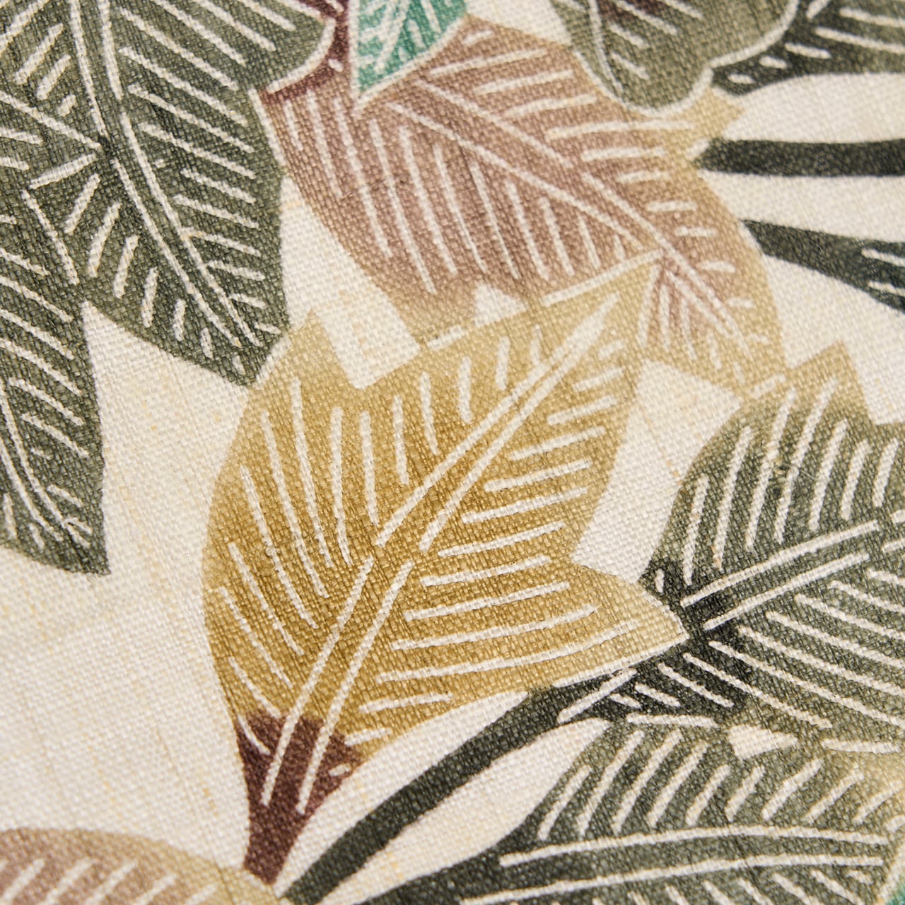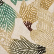 経緯に少し節のある大麻の麻の生成り色の地に、お太鼓には大きな牡丹のお花と、その周りをぐるりと取り囲むような葉が微妙に違った色々な色を使って紅型の技法で染められた、とてもお洒落な雰囲気の夏の九寸名古屋帯です。