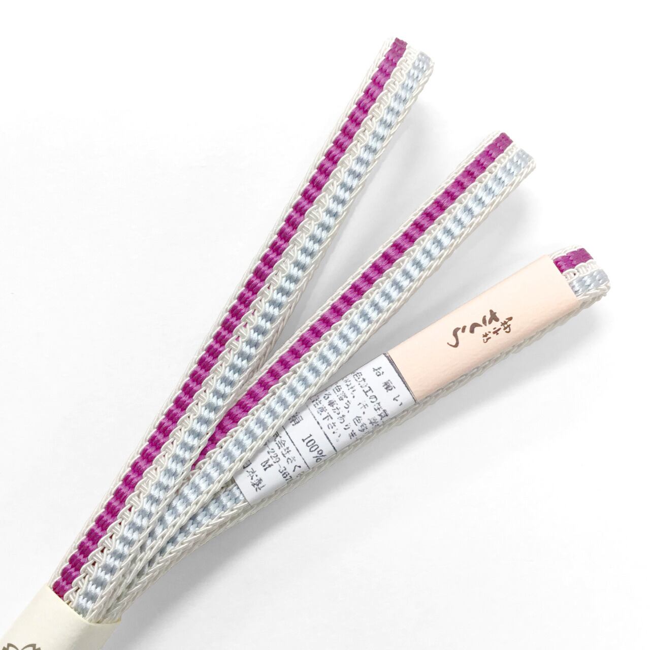 「帯締め 源氏立別レース 胡粉色に茜色と白緑色」