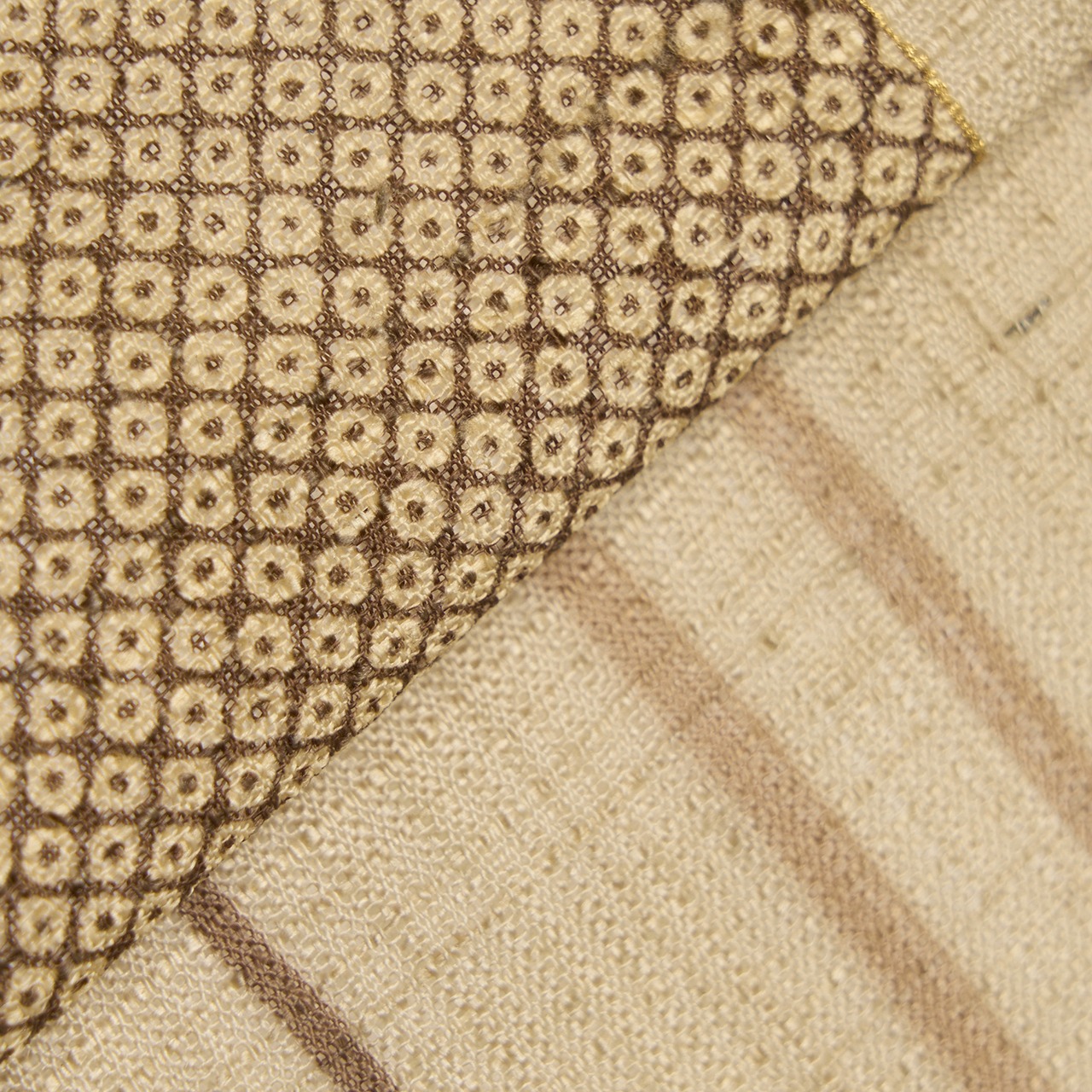 少し節のある、絹紅梅織のような格子の地模様の紬紗の練色の生地に、赤白橡色と憲法色の縞が引かれ、お太鼓には市松の配置で大きな四角が取られ、その中に細かな疋田模様が染められた、お洒落な雰囲気の二部式の夏の九寸名古屋帯です。