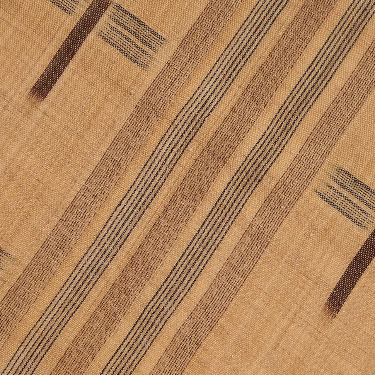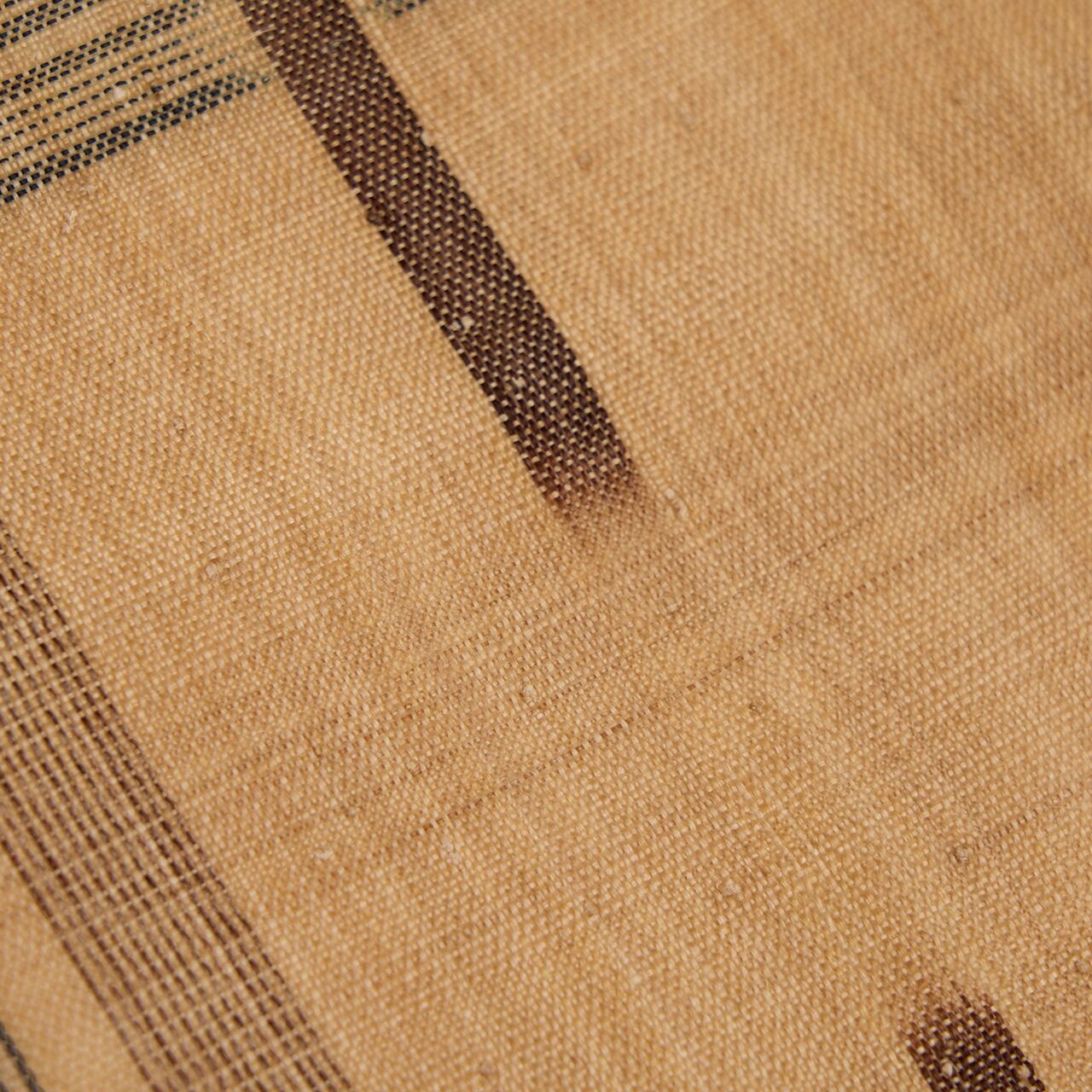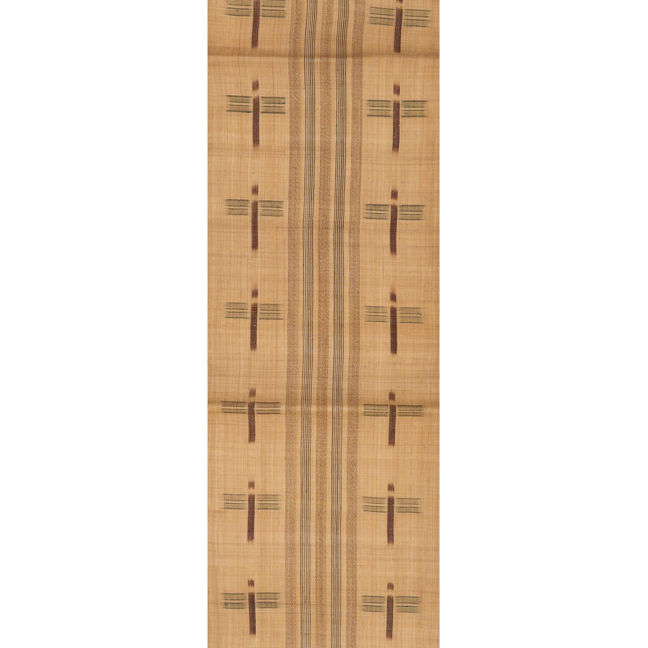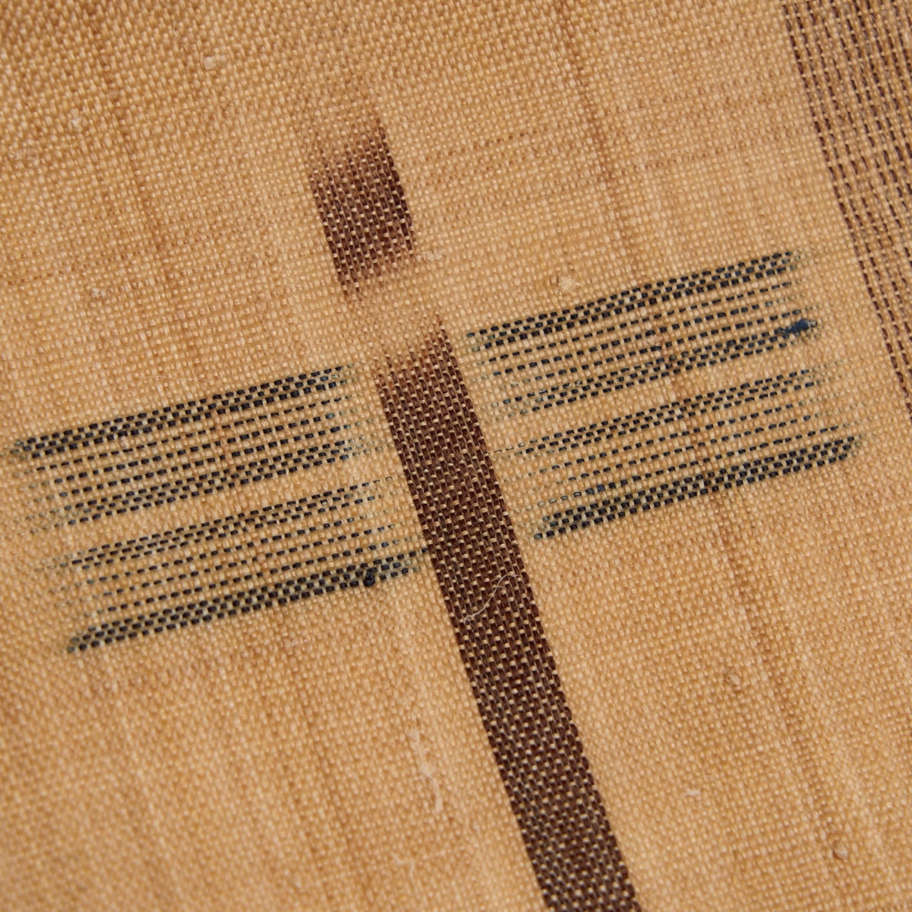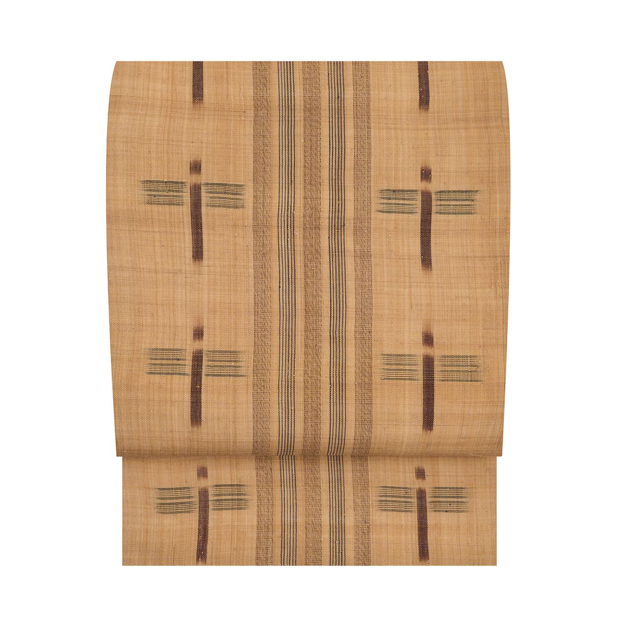 こちらの帯は芭蕉布ならではの少し飴色がかった素敵な薄茶色の地に、琉球藍の藍と車輪梅の焦げ茶で、中心に縞の模様と、その傍にトンボの絣が織り出された、素敵な九寸名古屋帯です。