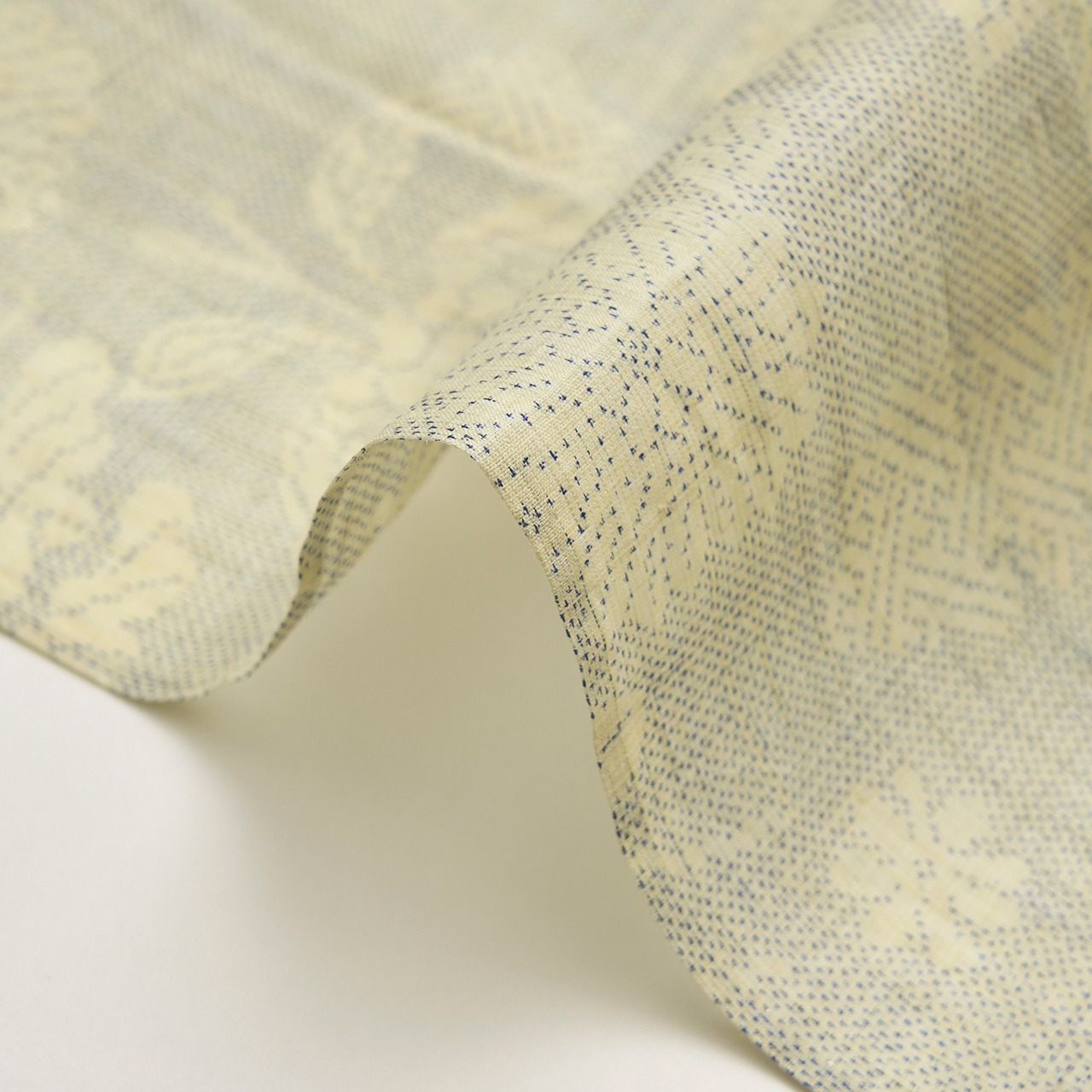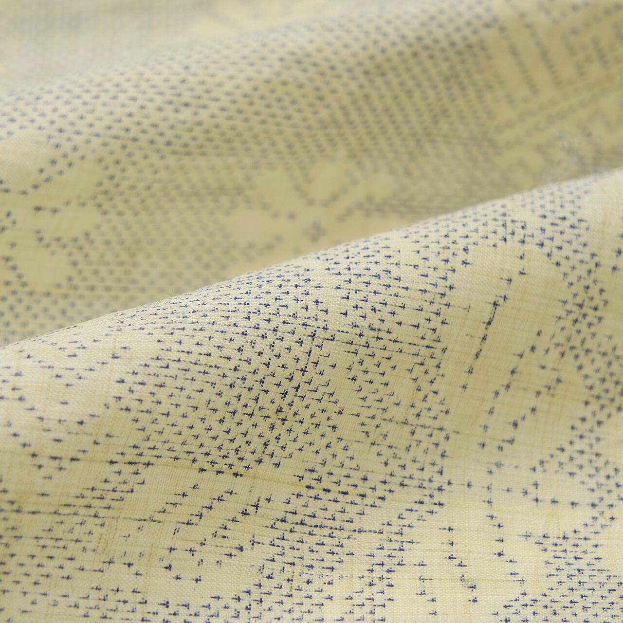 端正に並んだとても小さなカ絣で、蝶々にも見える松、笹、菊のようなお花、雲取りに紗綾型といったたくさんのモチーフが盛り込まれて表されています。