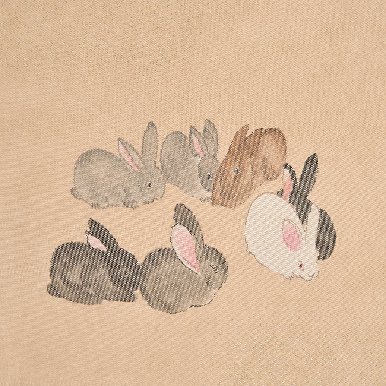 オレンジ味のある明るい薄茶・浅黄色に、砂子のような点々が散らされ、7羽のうさぎが集まってお話でもしているかのような可愛らしい図案が、近年では非常に珍しくなったといえる引き箔の技法で織られた、素敵な九寸名古屋帯です。
