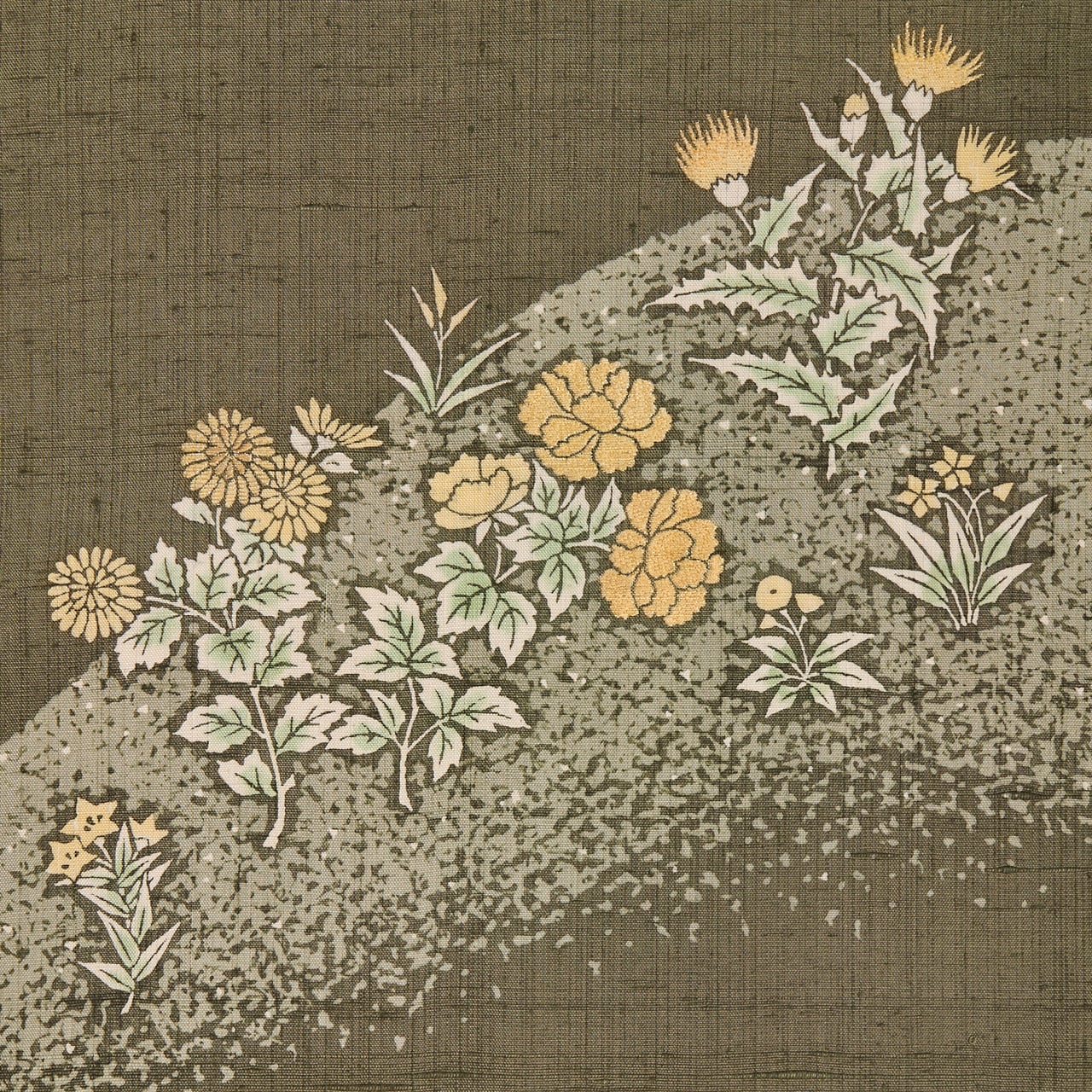 少し節のある座繰りの紬の生地が、グレー味のある鶯色・老竹色に染められ、お太鼓の部分には山形に撒き糊が施され、それを背景に菊や牡丹、アザミ、桔梗やスミレなど、春と秋のお花が混合されて細やかに描かれ、お花には非常に細かい金の糸で手刺繍も施された、とても手の込んだ、日本工芸会正会員である高橋寛さんの素晴らしい九寸名古屋帯の作品です。