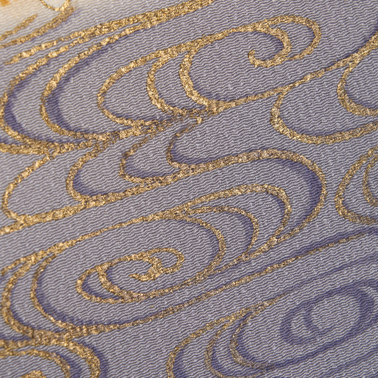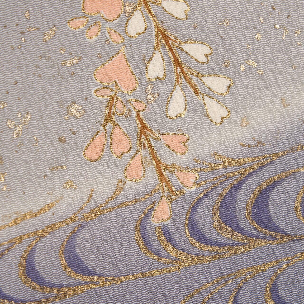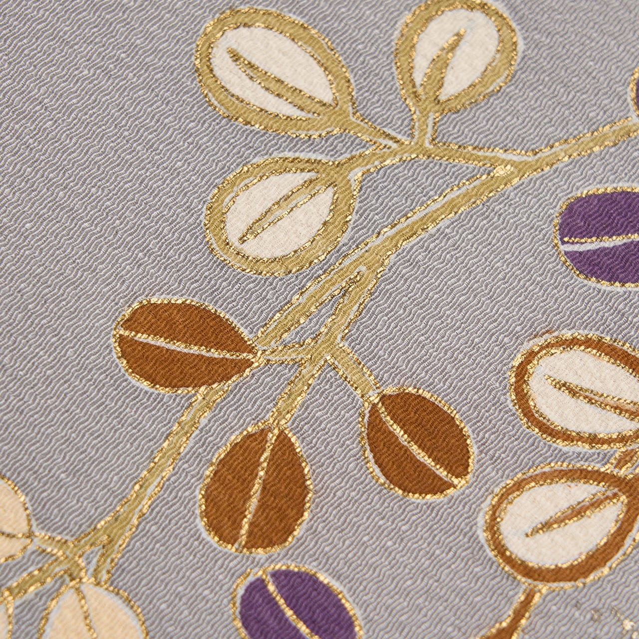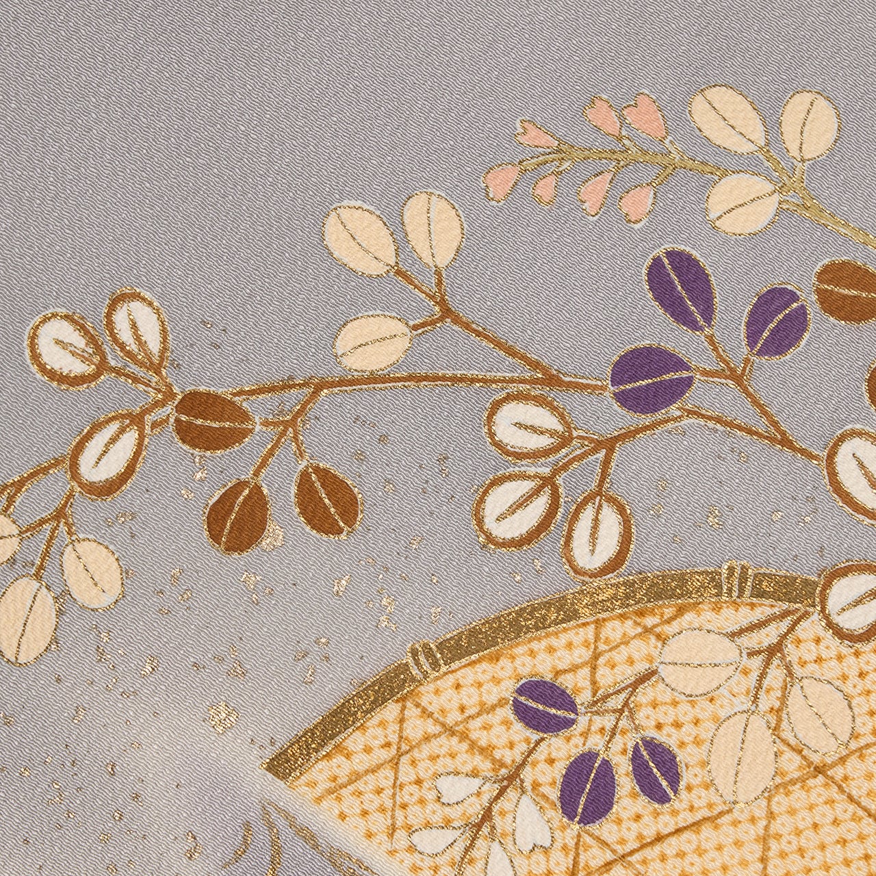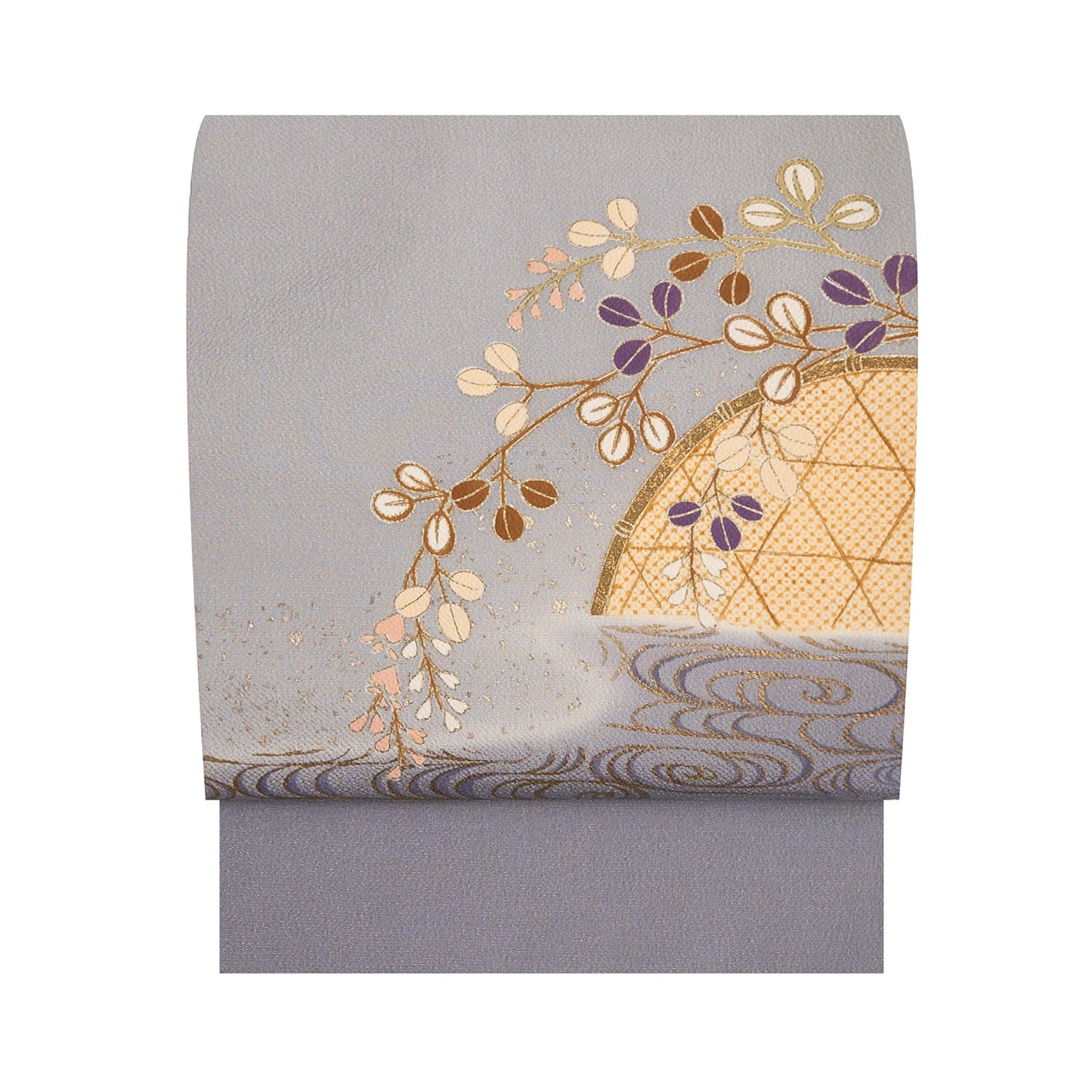 淡く澄んだグレー・絹鼠色のちりめんの地の、お太鼓の下の方が少し濃いグレー・鈍色で染め分けられて、水の輪の模様が渋い金彩で描かれ、その上には生垣と、そばから枝垂れるように枝を伸ばして小さなお花を咲かせた萩が、風情たっぷりに友禅で描かれた、とてもお洒落な九寸名古屋帯です。