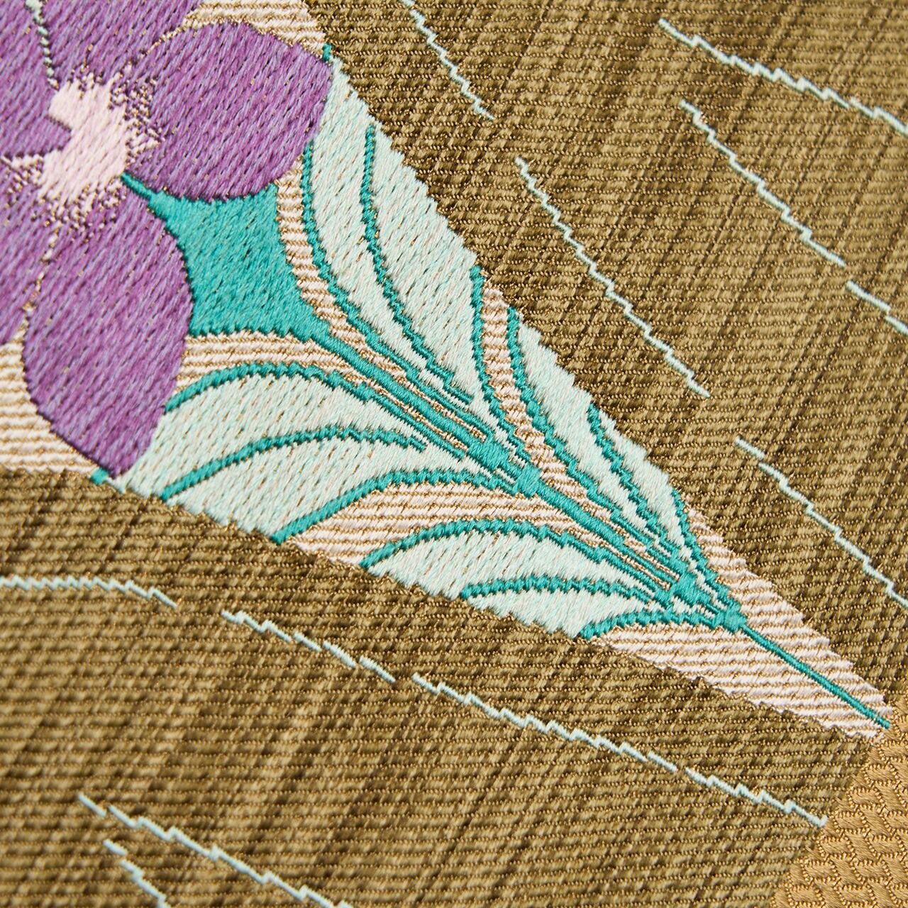 全体に網代のような模様が織り込まれた、黄色味のある薄茶・桑染色の地のお太鼓の部分に、練色と渋い草色・海松色の糸で山のような形が取られ、その谷間の部分に紫色の花びらをつけて咲くお花が織り込まれた、洛風林さんらしい斬新なデザインとお洒落な色使いが目を引く、品質の良さが溢れた素敵な袋帯です。