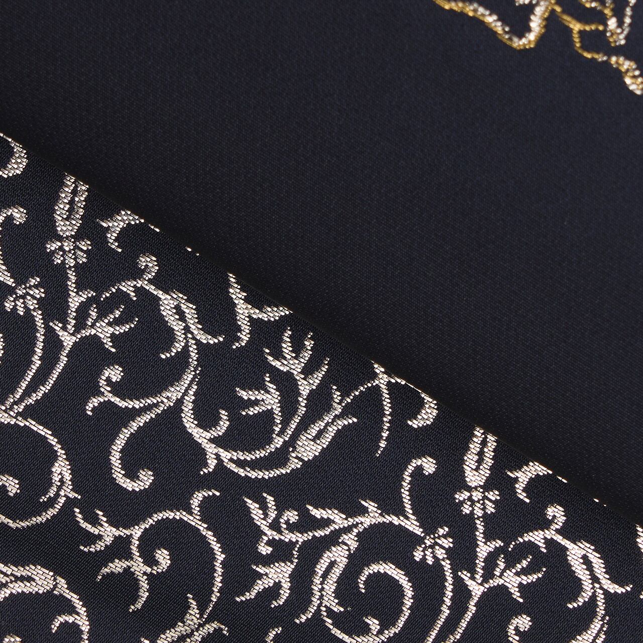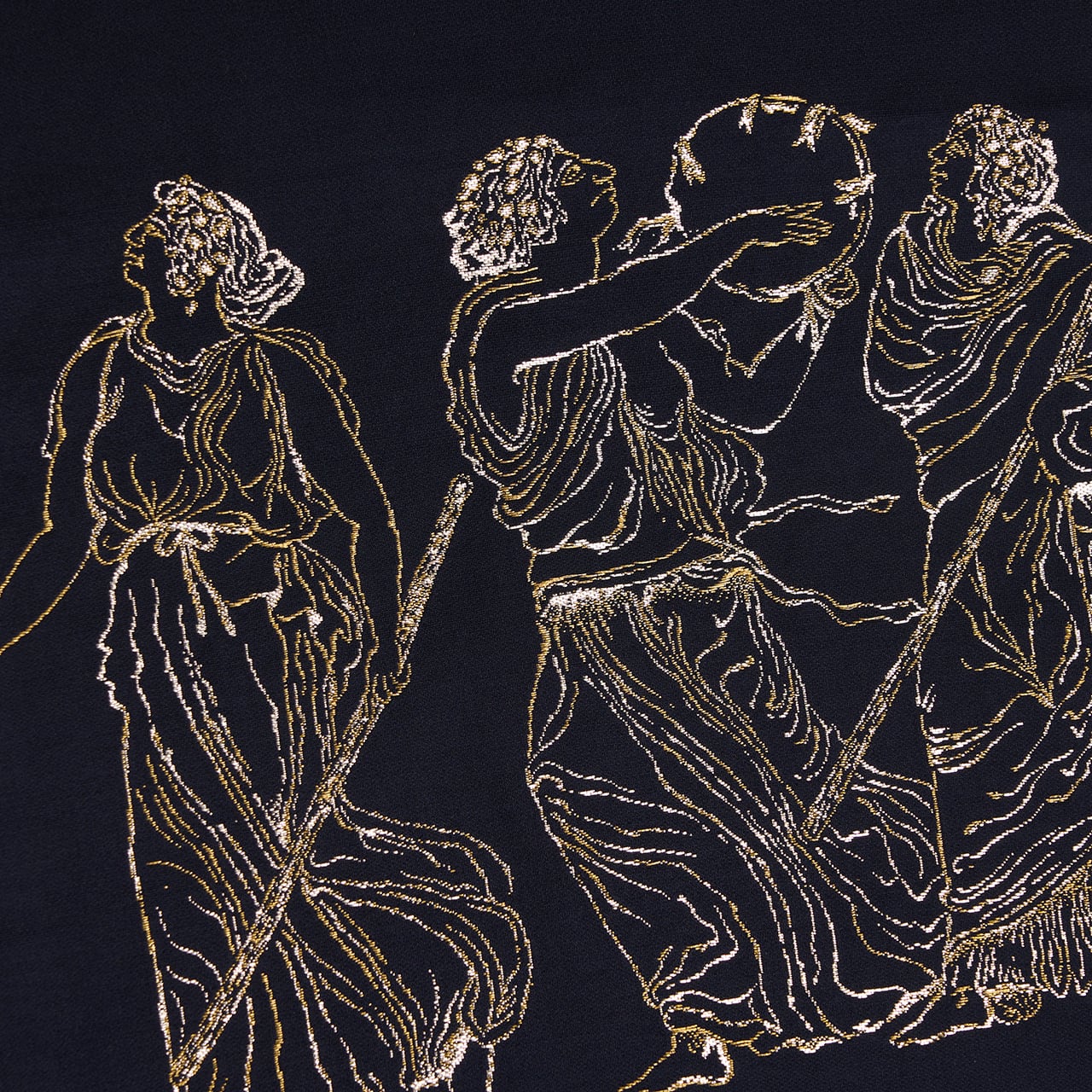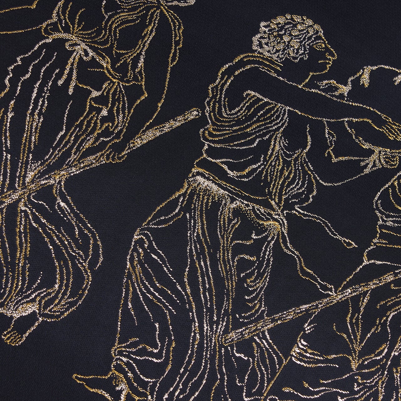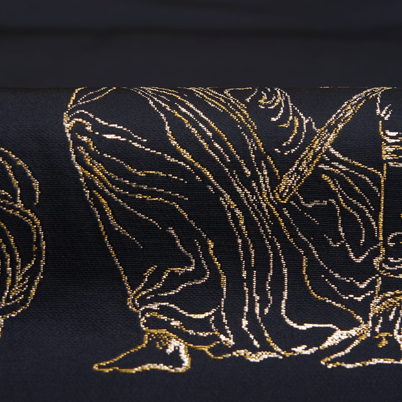 黒に近い濃い紺・鉄紺色の生地に、金と銀の箔の糸を巧みに使い分けて、ギリシャ神話の神々の宴の様子を表した、とても高い技術を感じさせられるような、たつむらさんならではのゴージャスな九寸名古屋帯です。