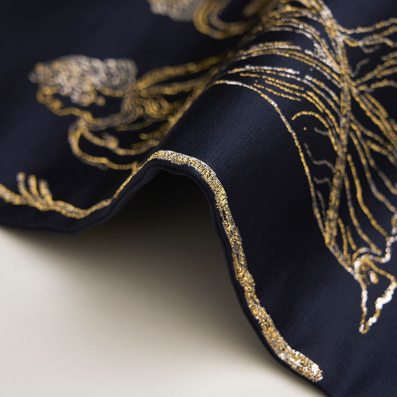 箔の糸を駆使して模様を織り出される事に優れていらっしゃるたつむらさんならではの作品といえますが、デッサン画のような細やかな線のタッチまで見事に織り出され、動きの感じられるものとされているのはさすがだと思います。