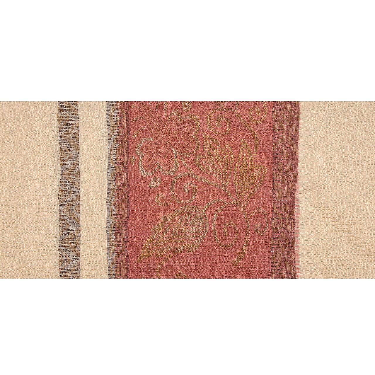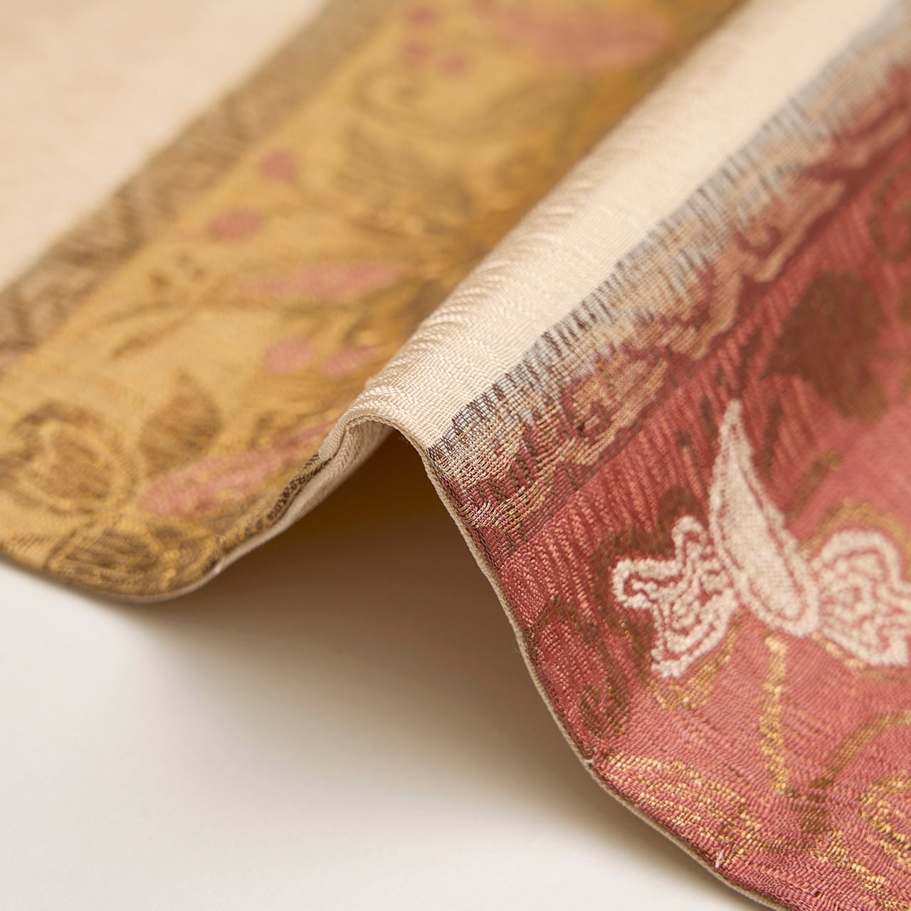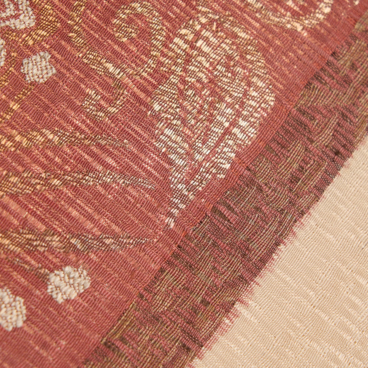 模様の部分に使われている金の箔の糸は真鍮色のものが使用され、全体の模様に重厚さが感じられたり、鳶色の段の花唐草には鳥の姿も描かれて、インドの古いサリーの生地などを彷彿させるようなオリエンタルな雰囲気がとてもお洒落で、帯として大変魅力的なものとなっています。