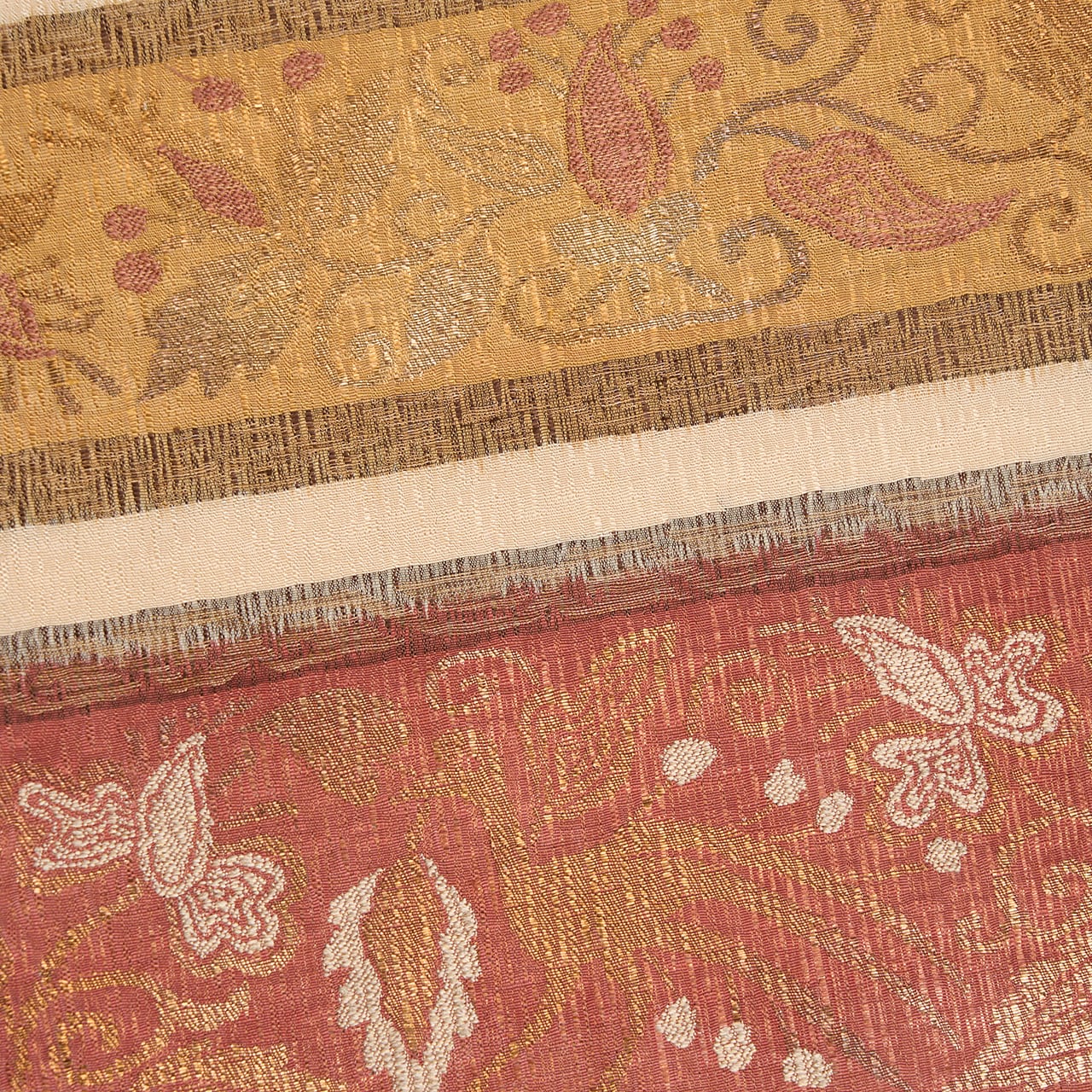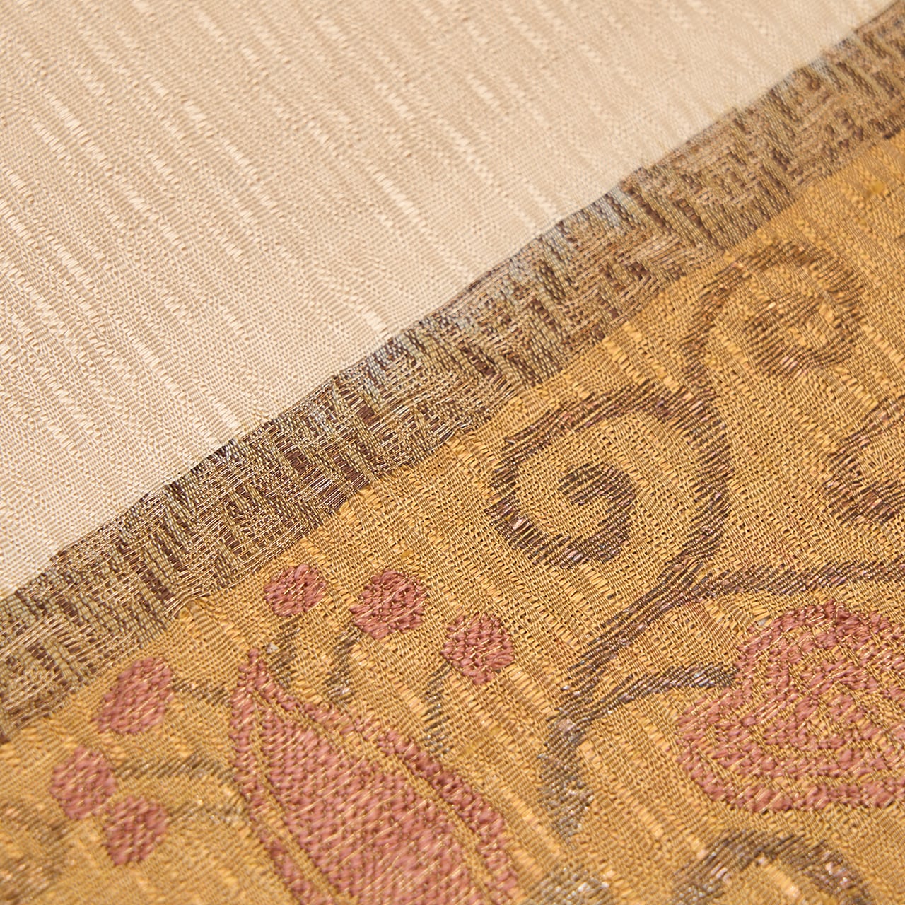 経糸は濡れ貫の櫛漉き織のような織りになった淡いクリーム・薄卵色の地に、お太鼓には黄土色と鳶色の段が取られ、その中に少しオリエンタルな雰囲気の花唐草の模様がそれぞれに織り出された、エスニックなテイストが感じられる、とてもお洒落な九寸名古屋帯です。