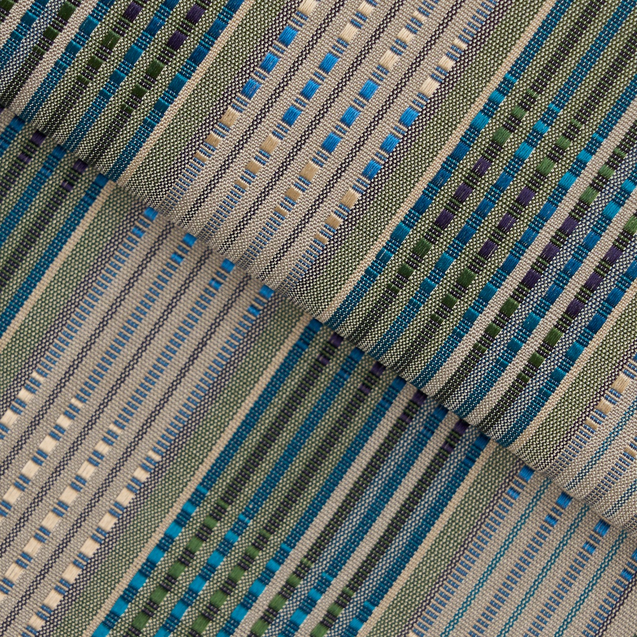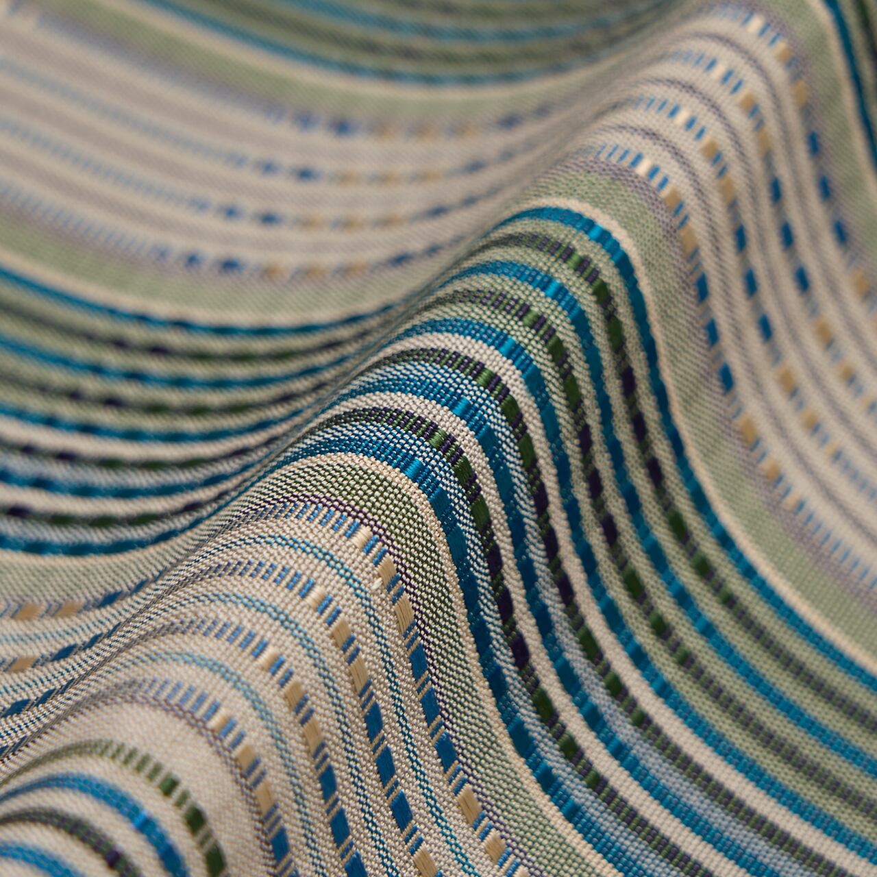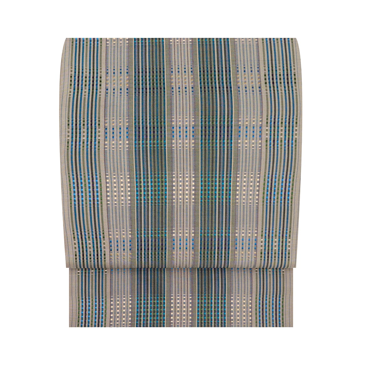 こちらはクリアな印象のグレー・薄鈍色の地に、青鈍色、深縹色、黒、明るい藍色などの絶妙な色合いで太く細く縞が構成され、それがロートン織で織り出され、本来の縞の色と、浮き織になった光沢のある部分との違いが美しいコントラストを生み出しているような、素晴らしい帯となっています。