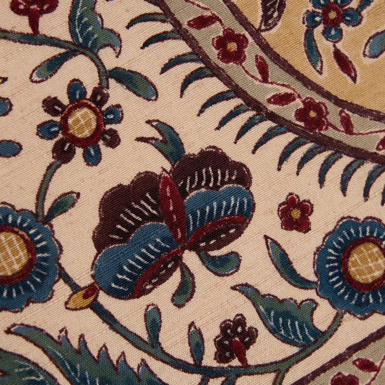 ジャワ更紗などに見られるソガ染料の薄茶色の地色も、鳥や蝶々、唐花の模様の描写や色使いも古色然とした魅力に溢れていて、外国の古い裂などにも造詣の深いむら田さんが扱われるものらしい、レベルの高さに改めてさすがだと思いました。