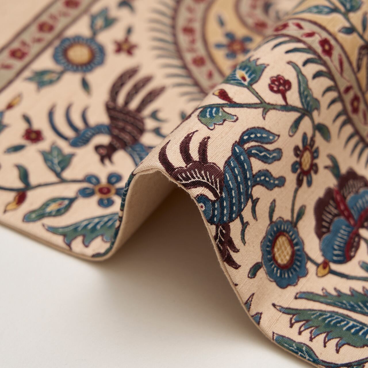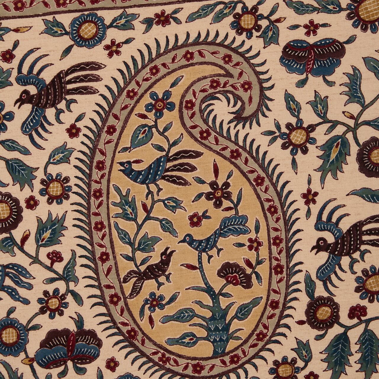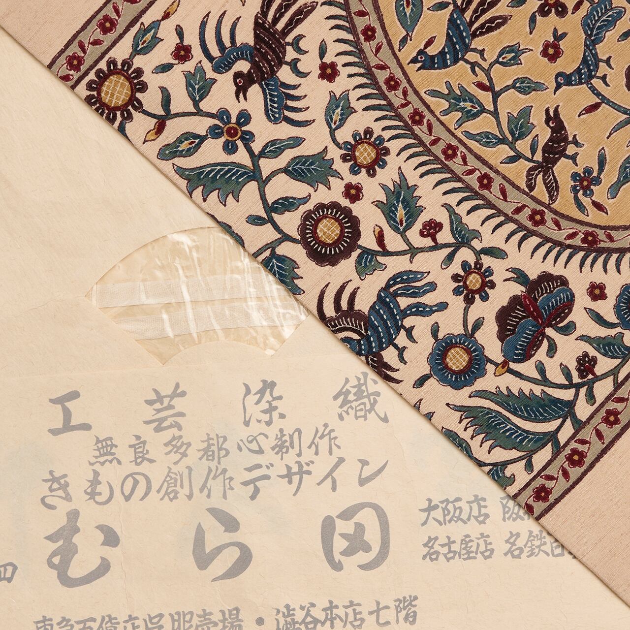 緯糸に少し真綿の手紡ぎの節がある結城機の紬の生地が、明るさの感じられる薄茶・白茶色に染められ、お太鼓に大きな段が取られ、ペイズリーの模様がドンと置かれ、唐花模様や鳥などが手描きの更紗で非常に細やかに描かれた、ちょっとエスニックな雰囲気のとても素敵な九寸の開名古屋帯です。