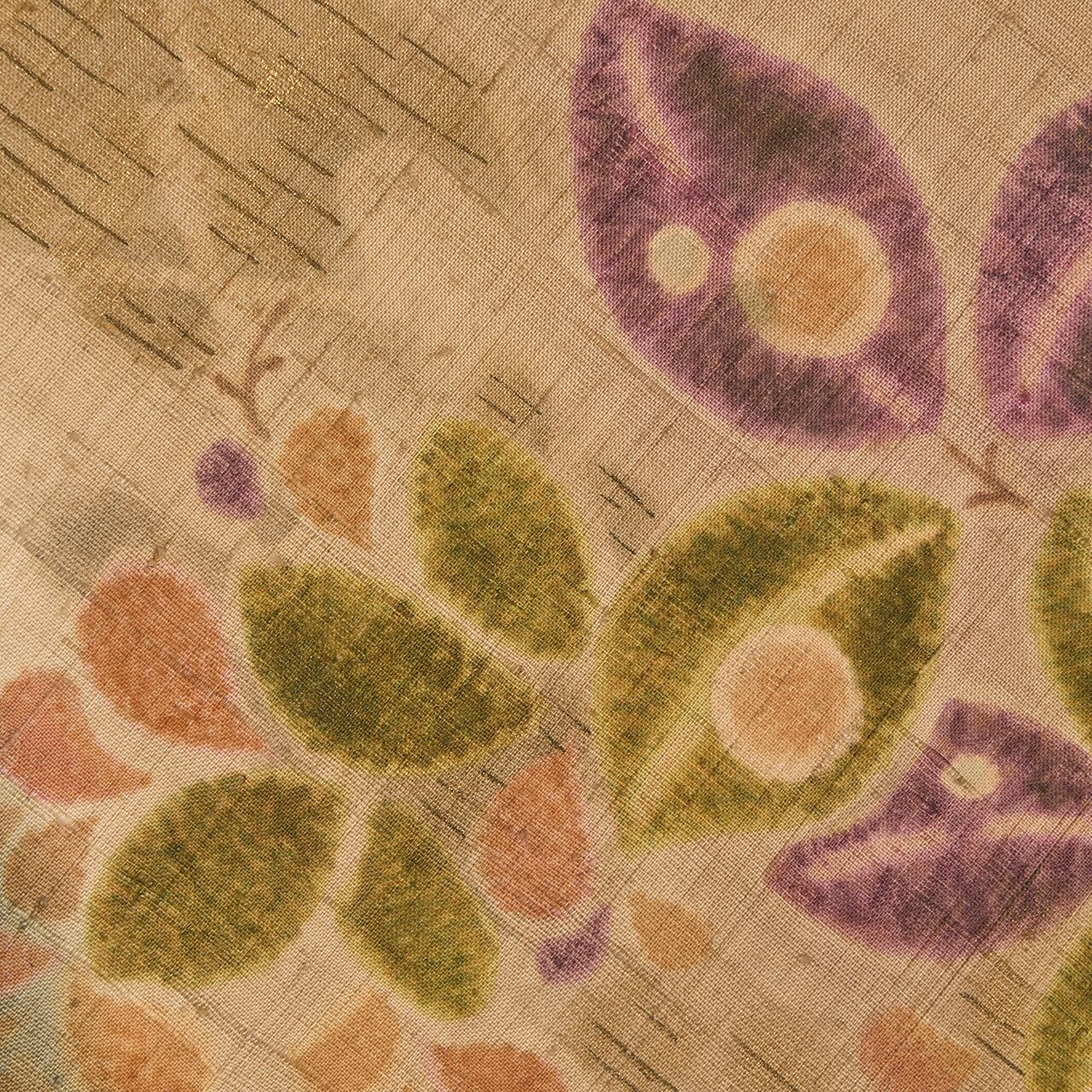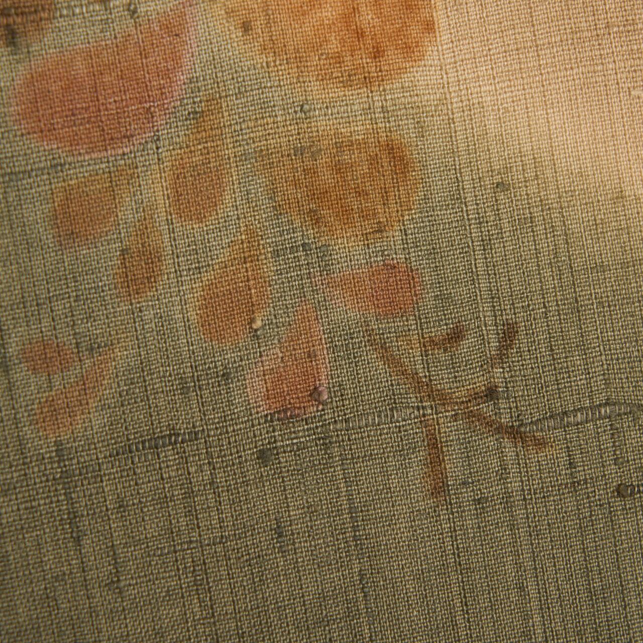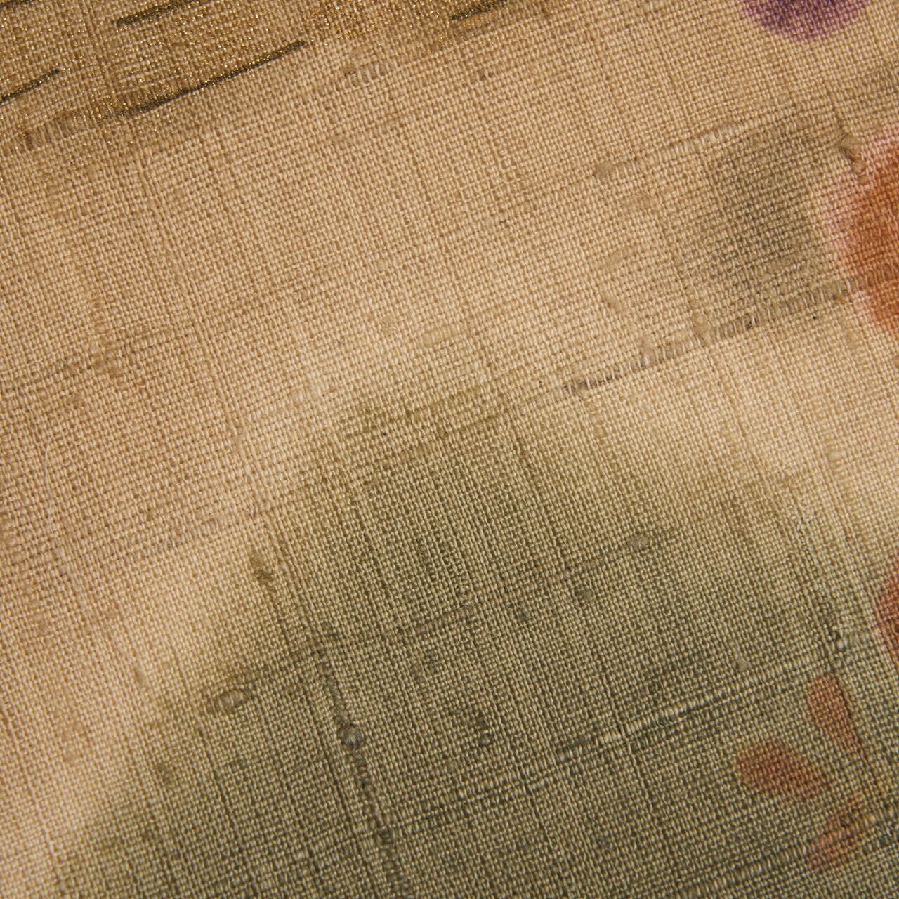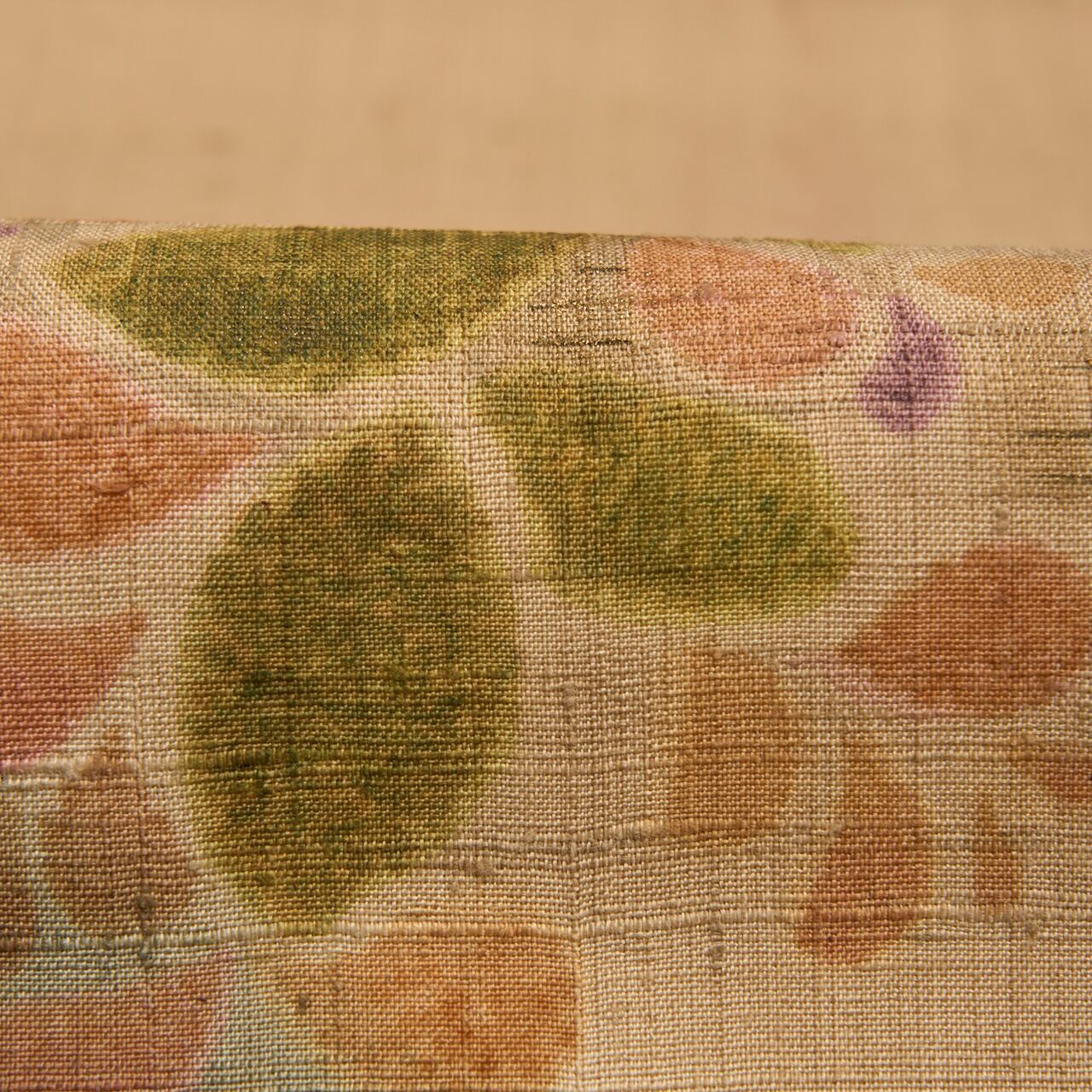 経緯に少し節がある座繰りの生紬の生地が白橡色に染められ、お太鼓の模様の下からタレまでは草色に染められ、お太鼓には辻が花調の模様が描かれた、シックな色使いの中にも格調高さと華やかさのある、とても素敵な九寸名古屋帯です。