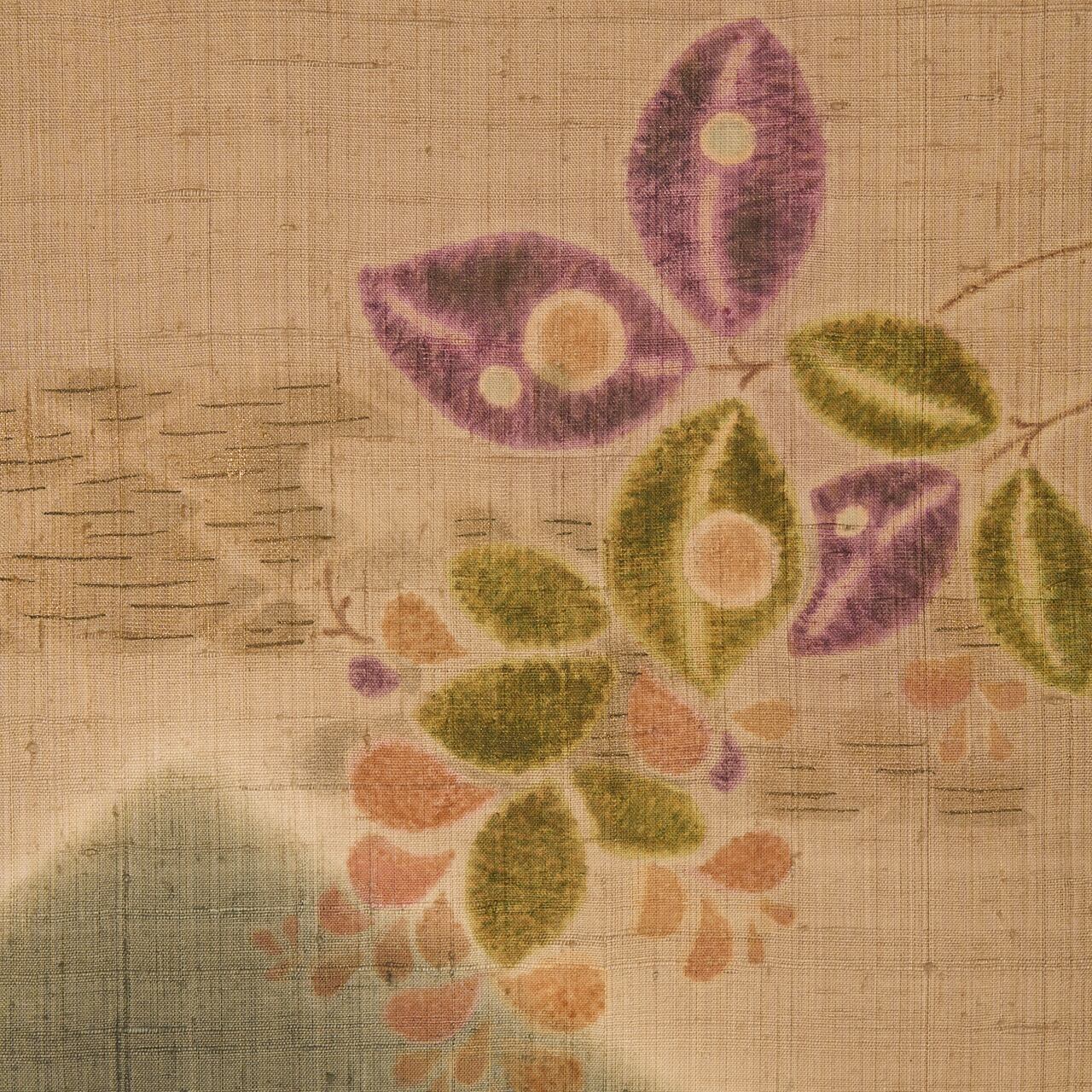背景には辻が花染特有の松皮菱の模様が利休茶色で描かれ、椿の葉と藤の花は一珍染のような少しゆらいだ調子で染められ、輪郭も絞り染めのように描かれています。