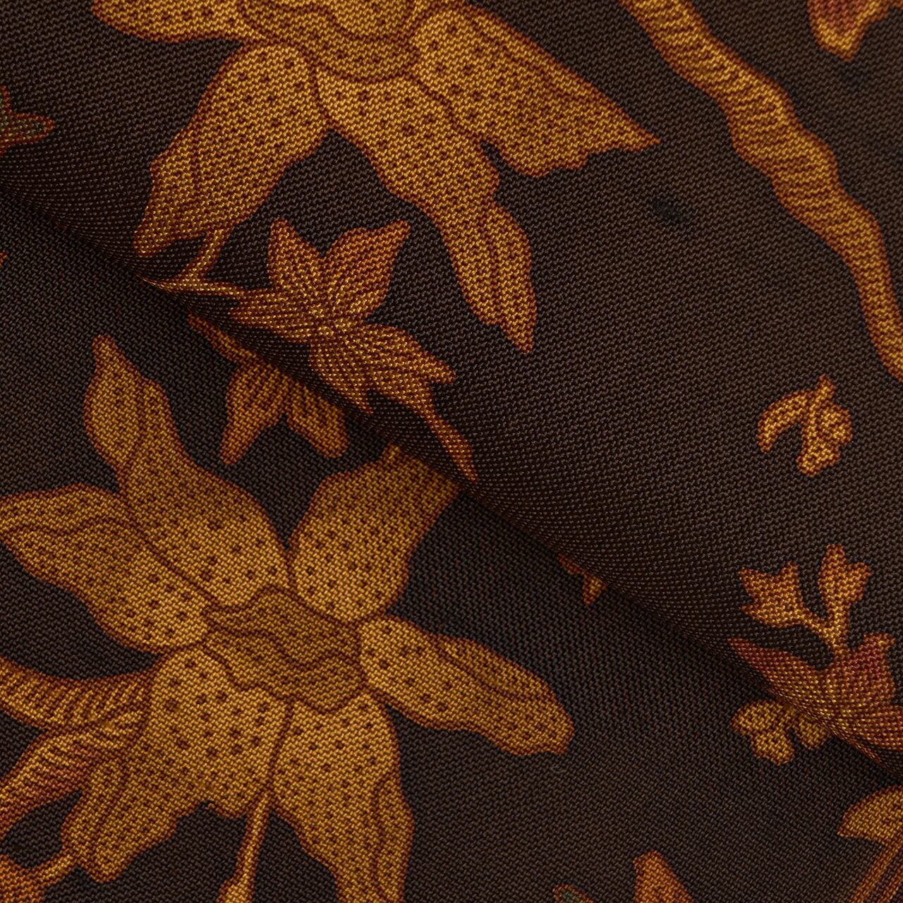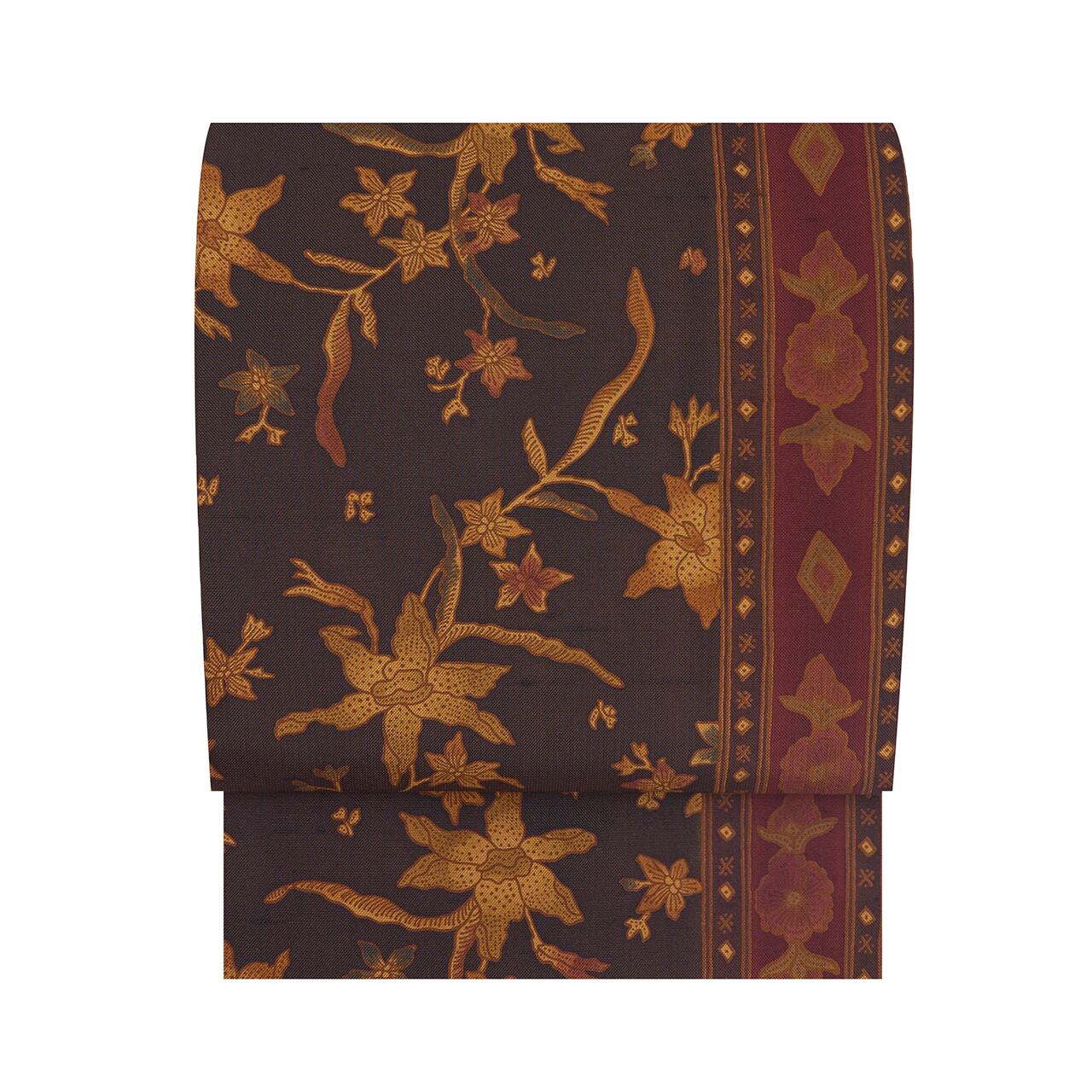 赤味のある焦げ茶・黒鳶色に染められた、打ち込みの良いサラッとした手触りの紬の生地の、お太鼓の右側には葡萄色のボーダーが取られ、菱形とお花の模様が描かれて、黒鳶色の方には蘭のようなお花の蔓草模様が染められた、インドネシアのバティックの模様が表された、とてもお洒落な雰囲気の九寸名古屋帯です。