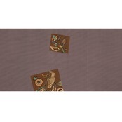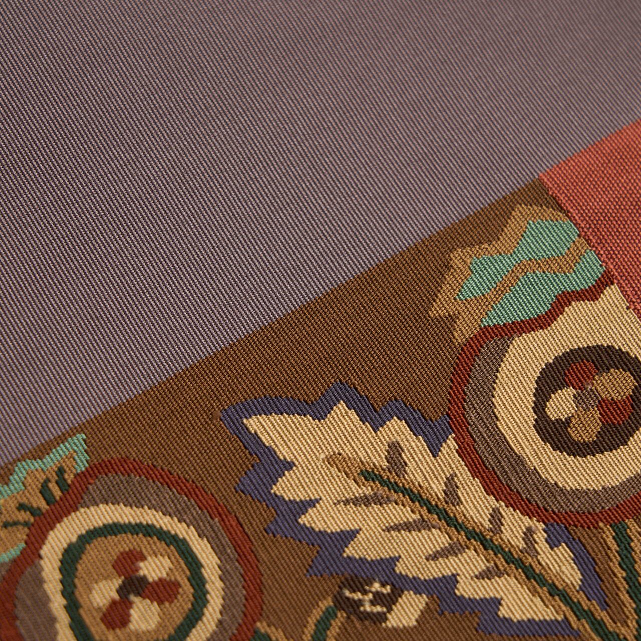 少しだけ紫味のあるグレー・紫鼠色の地に、お太鼓が8個の四角で区切られ、中心は蘇芳香色と虫襖色で市松が、両端には唐花とそこにとまる小鳥が、色々な色の糸を使ってディテールまで細やかに爪掻き綴れで織り出された、素晴らしい八寸名古屋帯です。