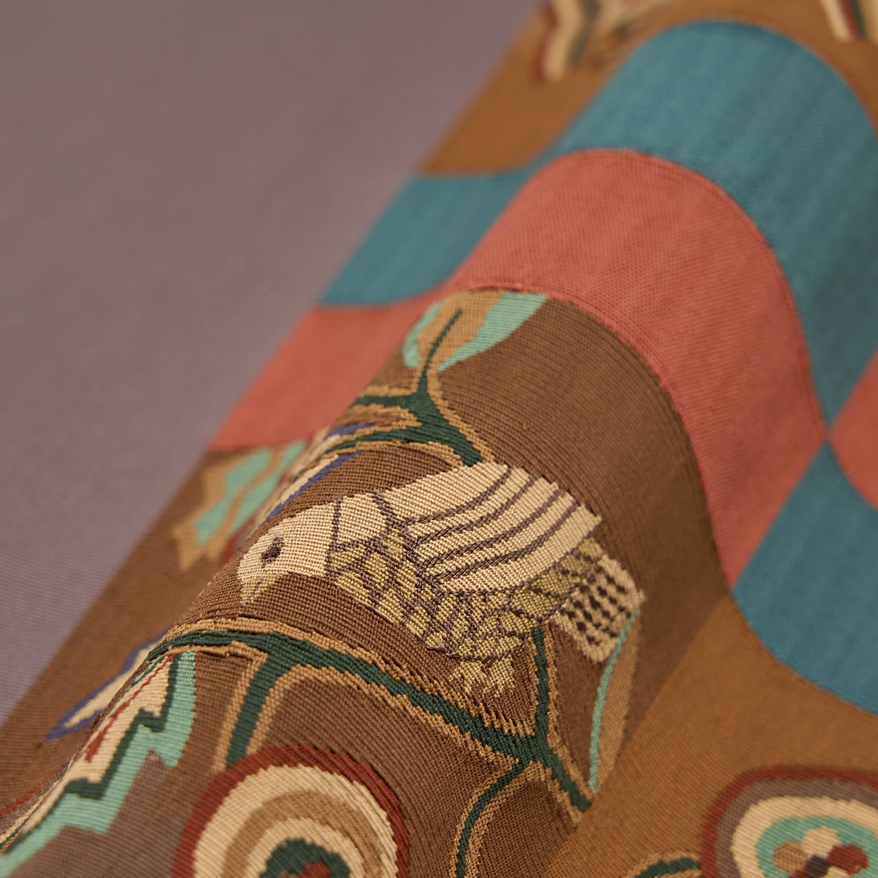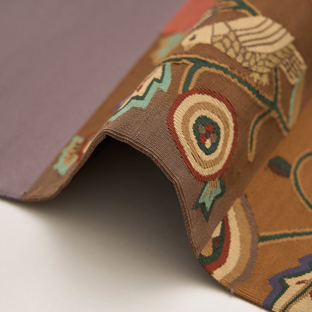 お花のデザインも様々で、とても複雑な形になっていますし、小鳥の細かな羽もすべて爪掻き綴れで織られている事が信じられないくらい、高度な技術で完成されています。