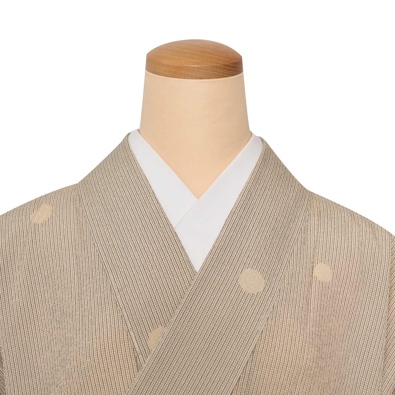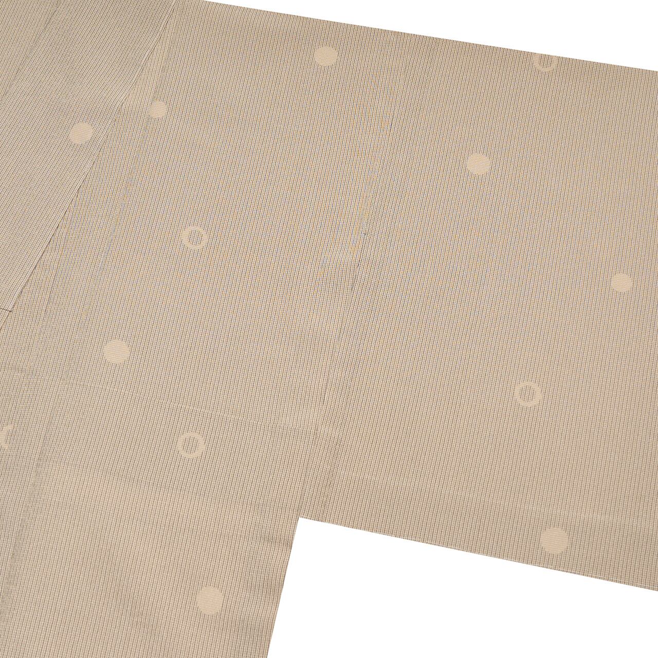 全体に細い子持ち縞のような模様が織り出され、ところどころに水玉のような模様と、ドーナツの輪のような模様が染め抜かれ、リズム感のある楽しいデザインとなった、塩沢お召の単衣のお着物です。