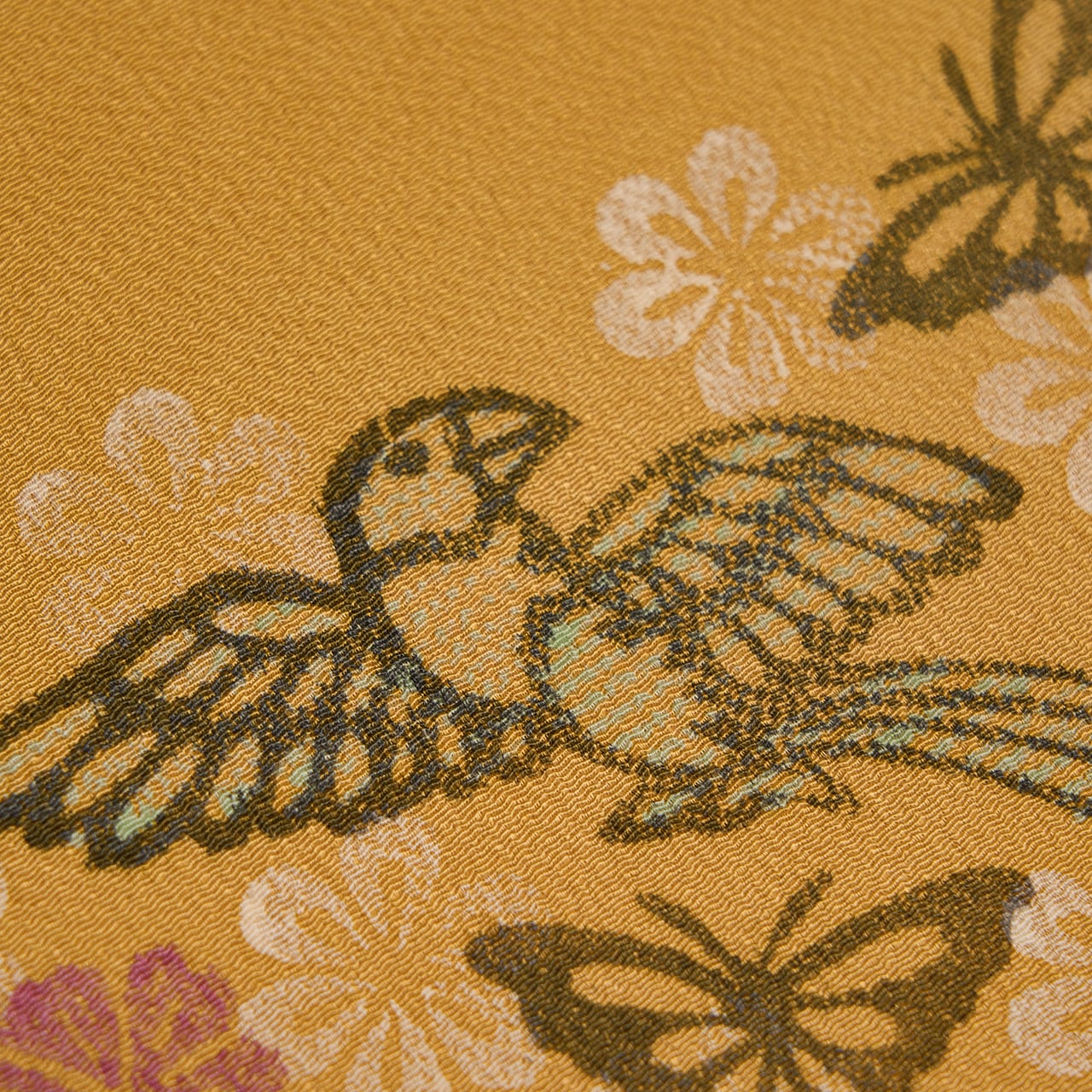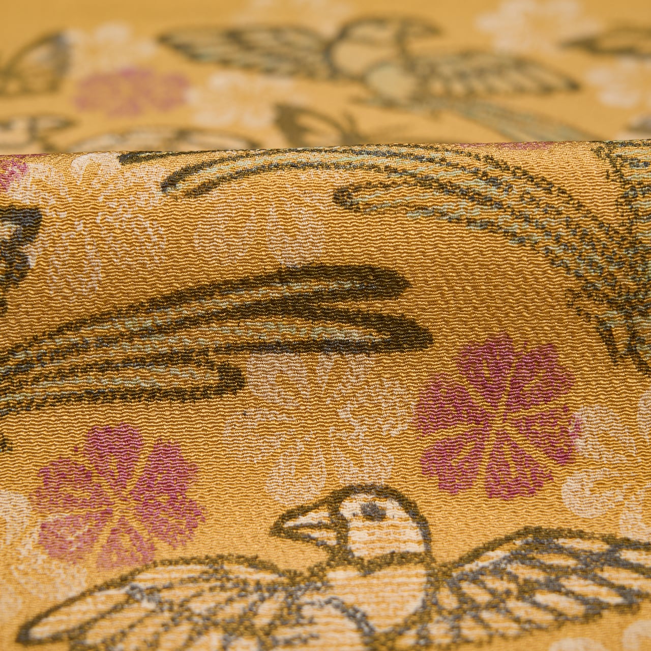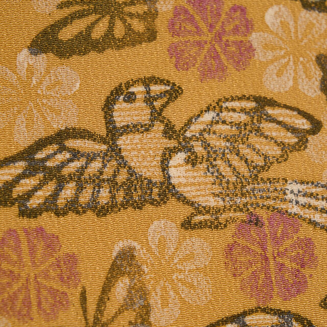 少しシボのあるちりめん地が山吹茶色に染められ、尾の長い鳥が飛び交う様子と、蝶やお花が描かれた九寸名古屋帯です。