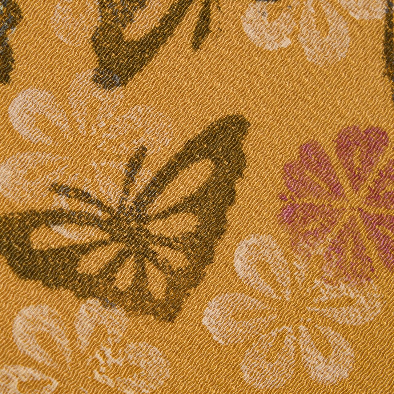 蝶やお花なども同じく木版で染められていると思われますが、独特の雰囲気と味わいに面白さがあり、楽しい印象の素敵な帯となっています。
