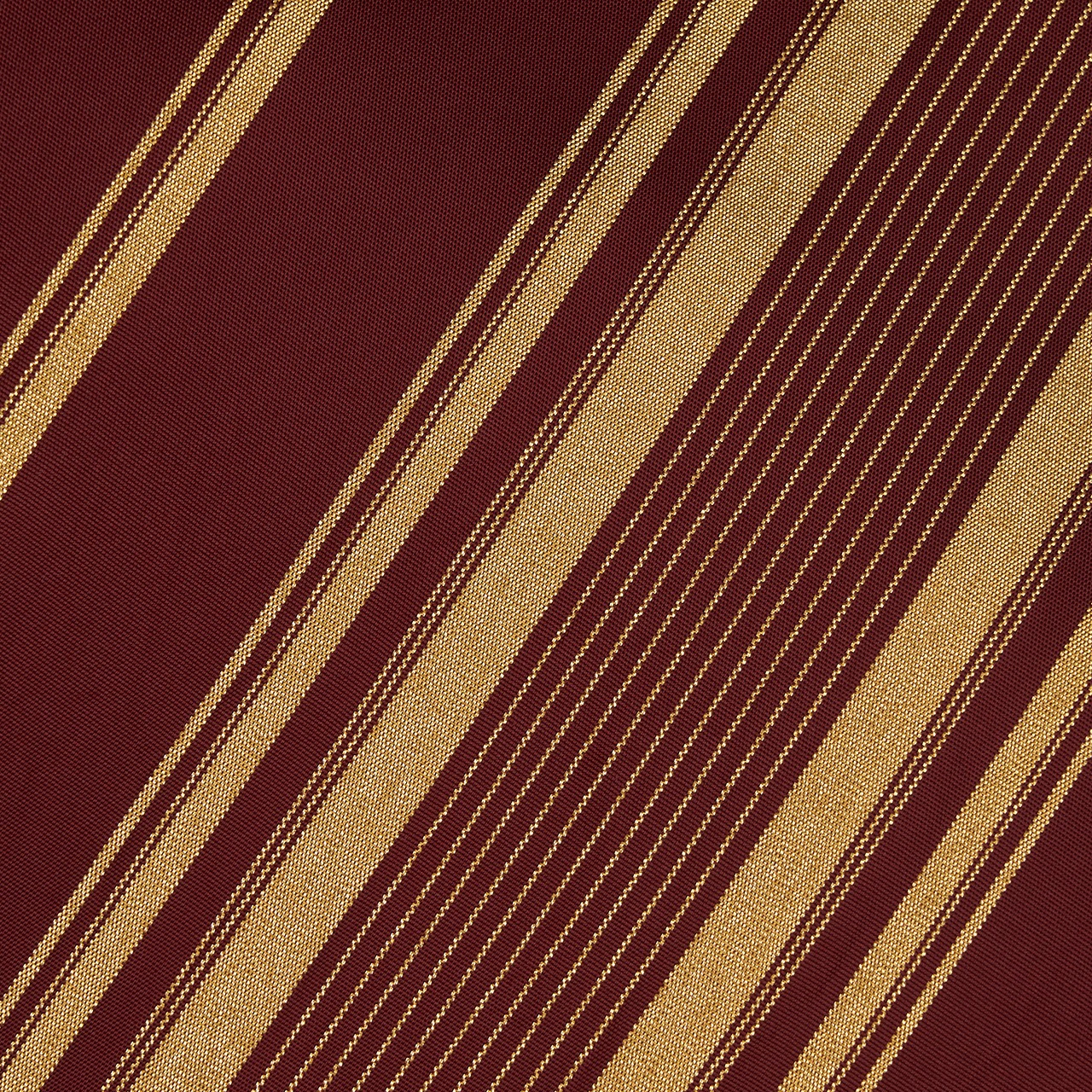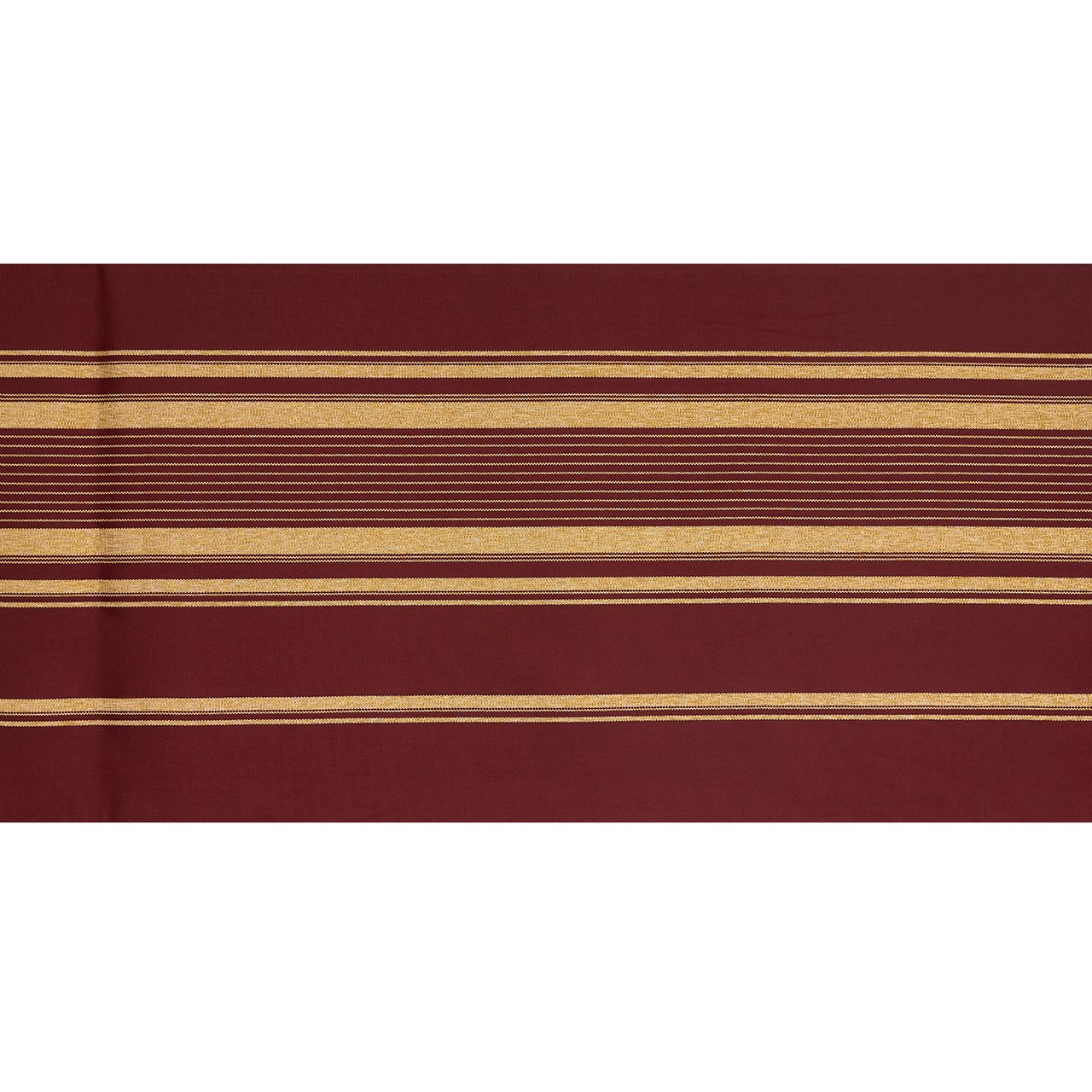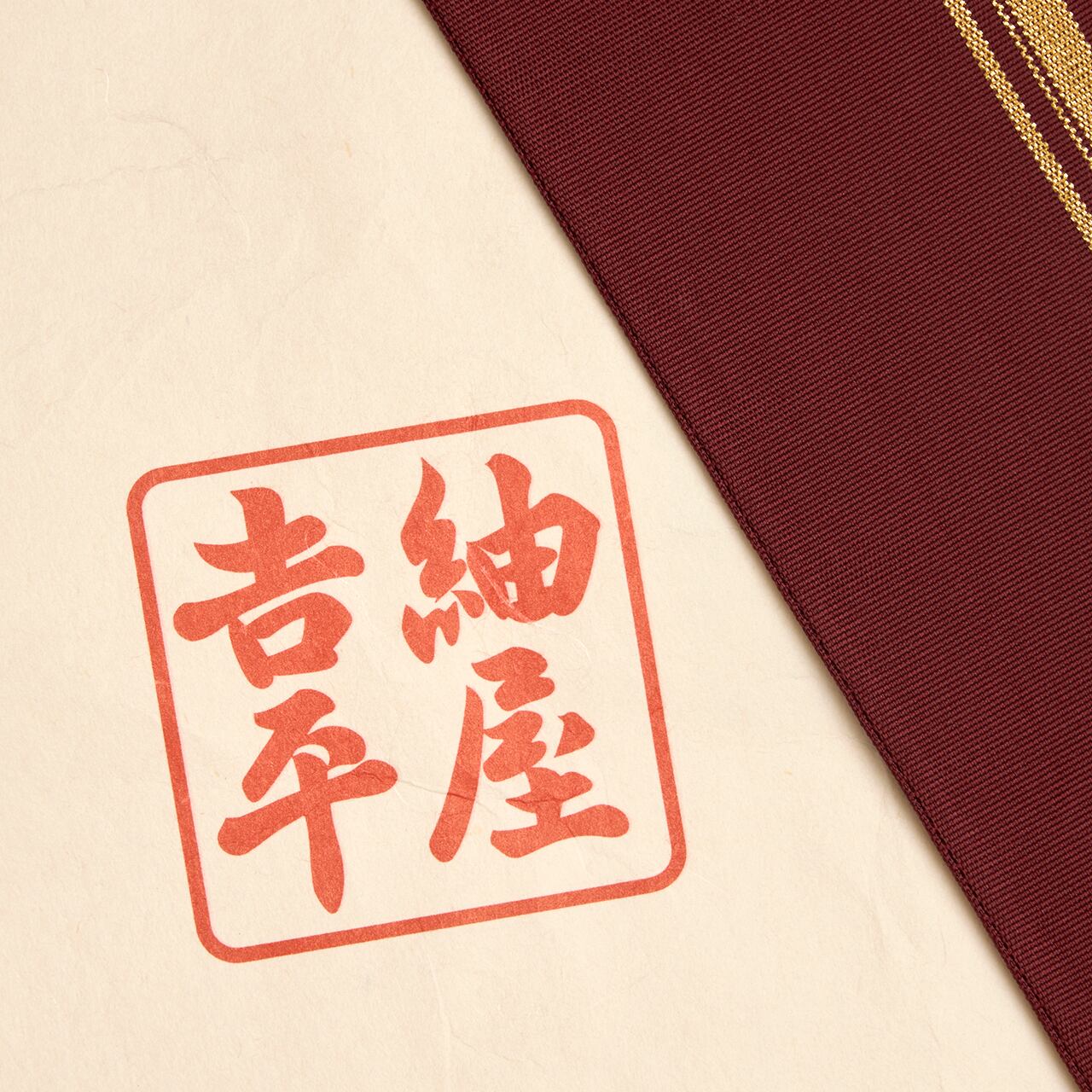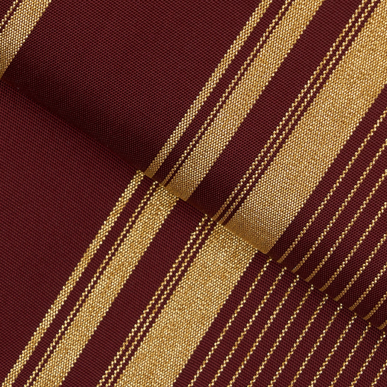 とても深い小豆色・葡萄色の綴れ糸で織られたような、シャリっとした打ち込みの良い張りのある地に、金糸の縞が太く細くランダムに全面に走るデザインは、なかなか思いつかない素晴らしいセンスだと思います。