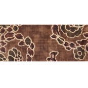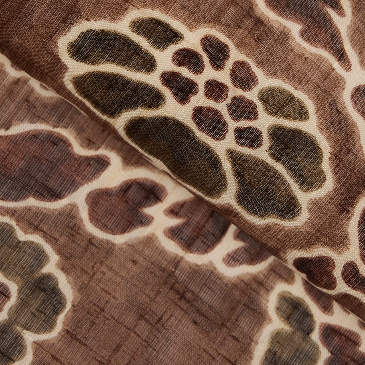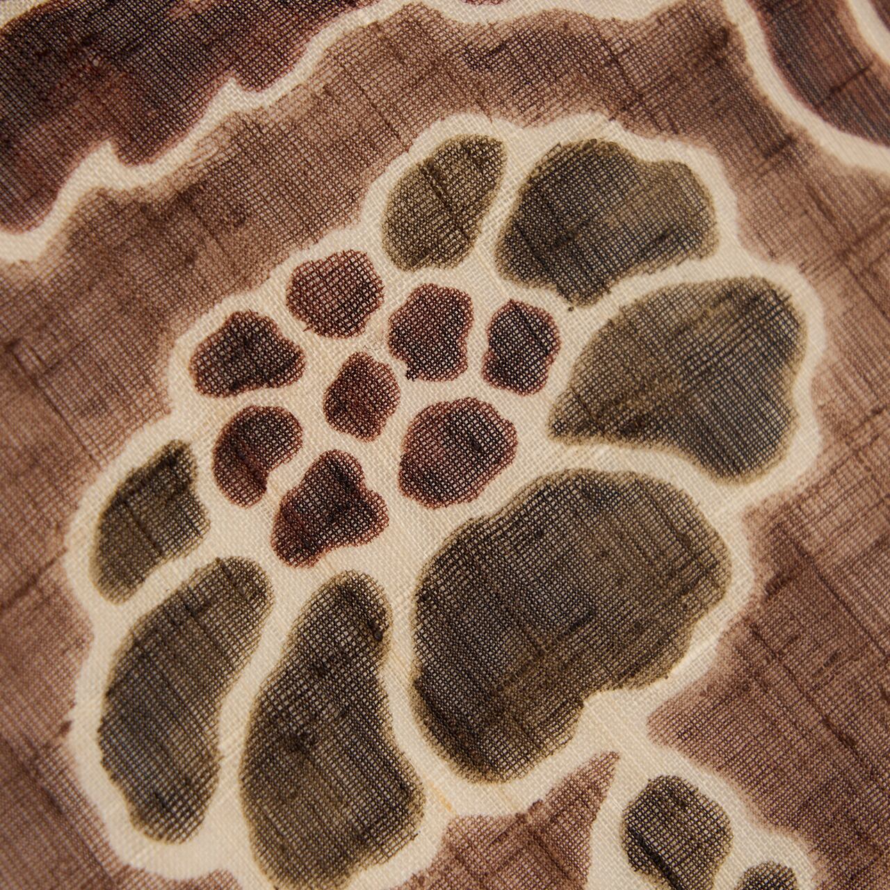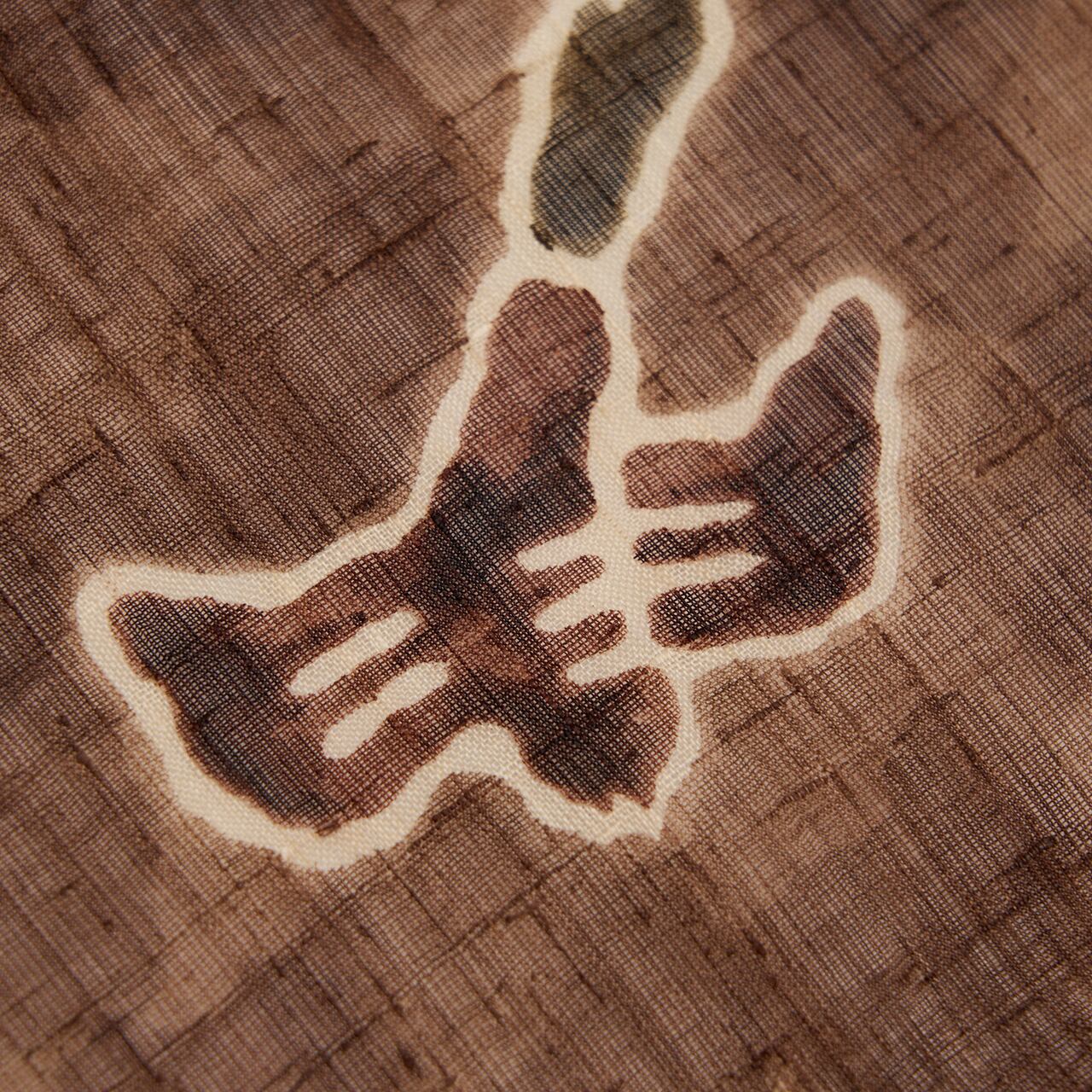 経緯に節のある少し薄手の生紬の生地が、赤味のある明るい焦げ茶・黒鳶色に地染めされ、全体に手描きの蝋纈染めで正倉院の夾纈染の模様が描かれ、部分的に藍媚茶色のモスグリーンや葡萄色の濃いワイン色で彩色された、とても格調高さのあるお洒落な九寸名古屋帯です。