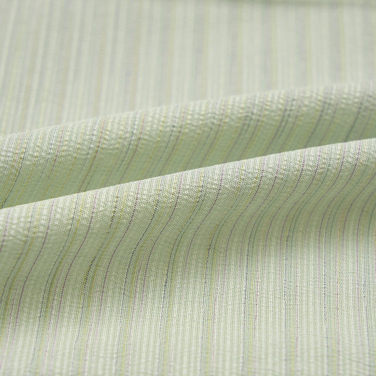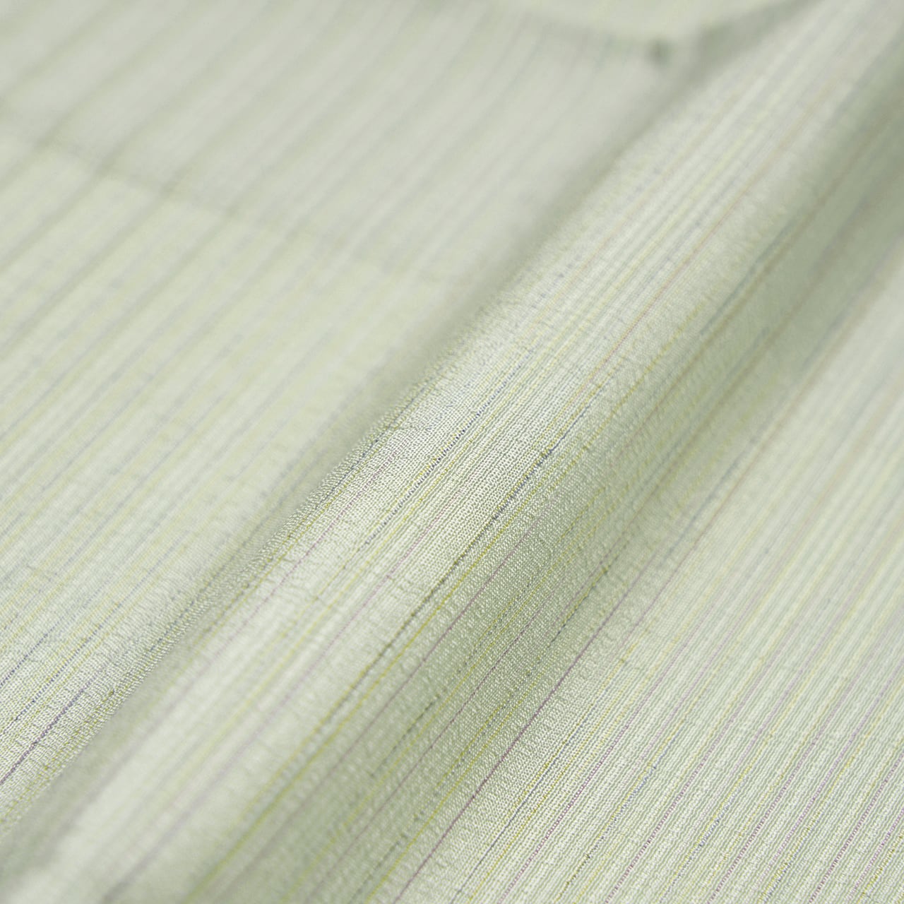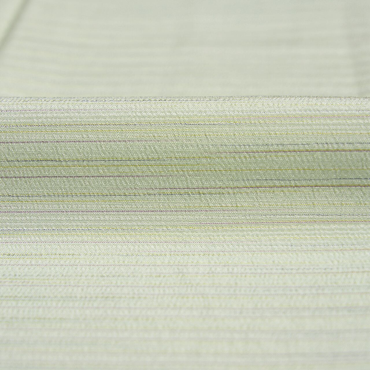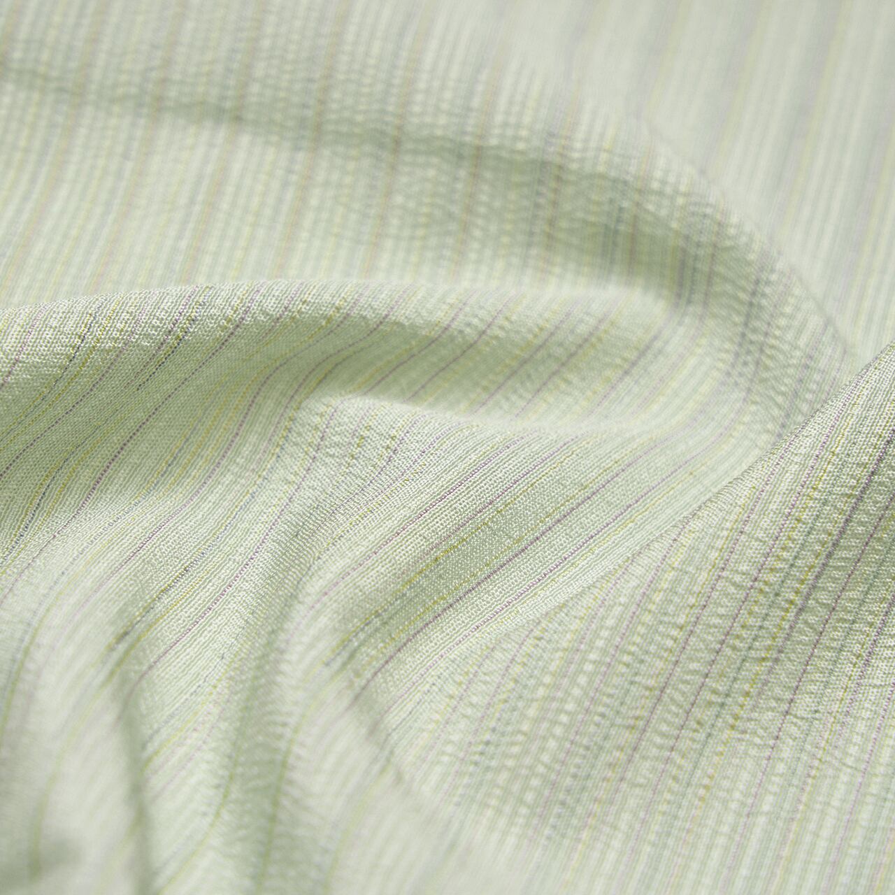 透明感のある淡い緑味のある水色・白緑色の地に、御召納戸色、紫鼠色、芥子色、象牙色といった、いろいろな色の糸が一本ずつ横段に織り込まれた、本場塩沢お召の袷のお着物です。