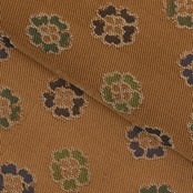 正倉院文様を復元されたものと思われますが、明るめの茶・丁字染色の地に、小さなお花が紅消鼠色の濃い紫と、濃い渋めの緑・老竹色、少し明るい緑・木賊色の糸を使って錦織で表されています。
