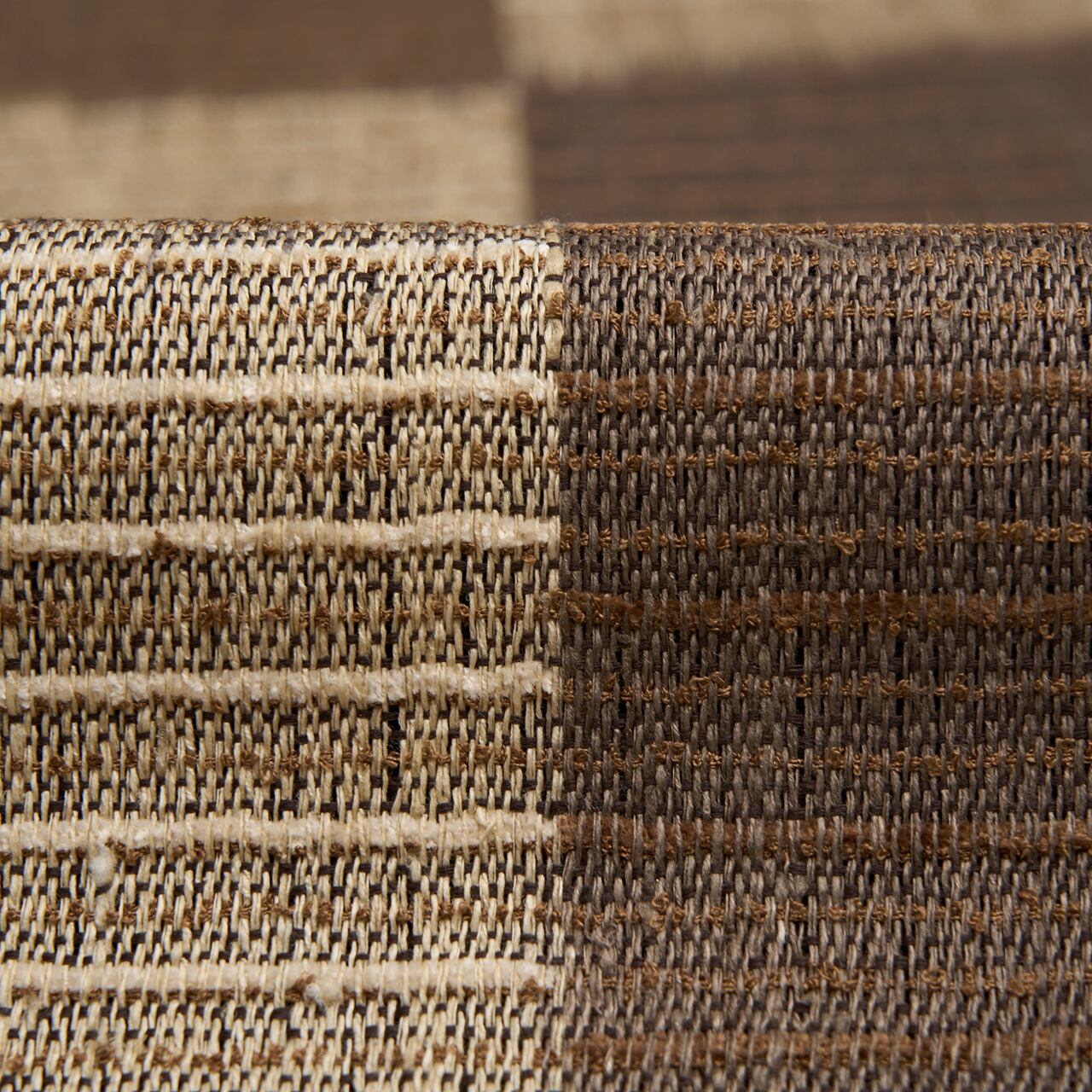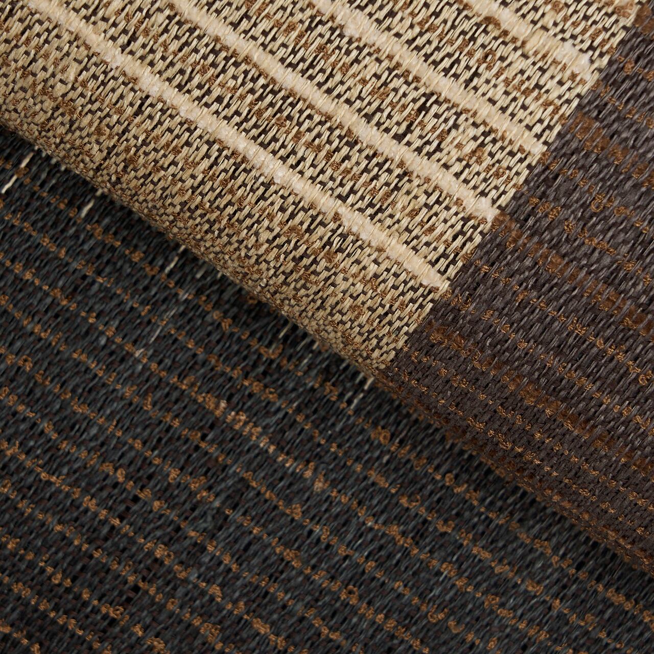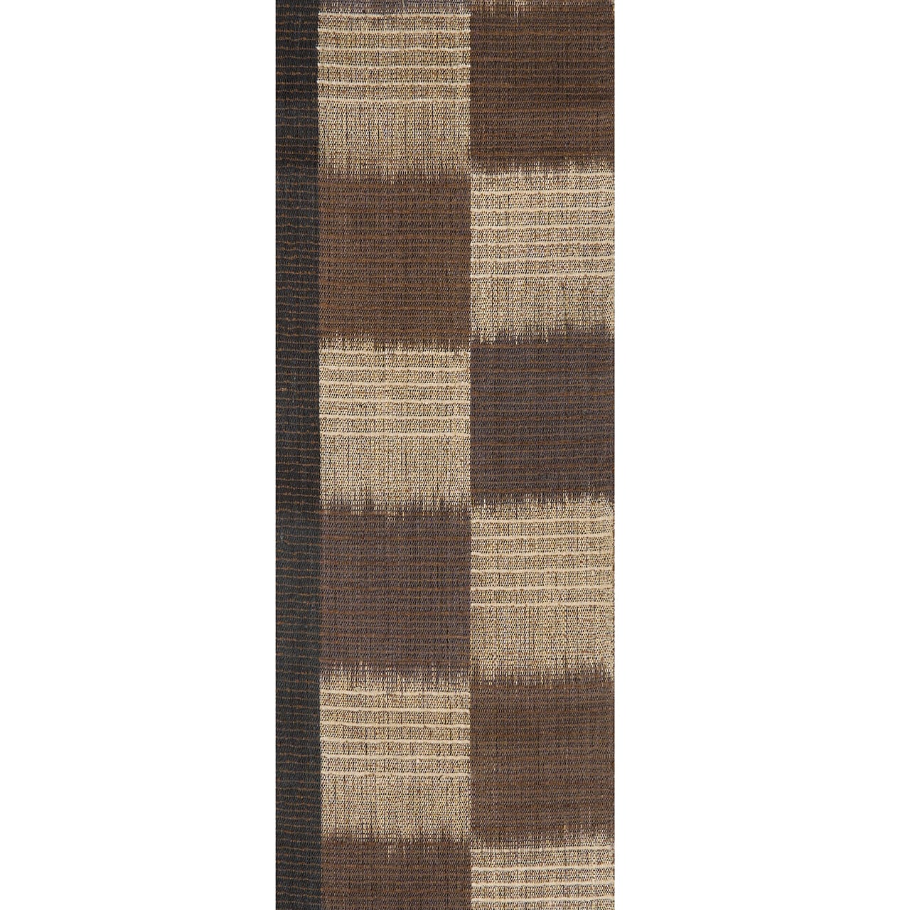 左端に約5cmの幅の黒い帯のような部分が置かれ、右には大きな市松の模様が、涅色の焦げ茶と砂色のベージュで縦絣のような技法で織り出されていますが、ところどころに真綿の太い糸が織り込まれて、少し凹凸感のあるような面白い風合いとなった、素敵な帯です。