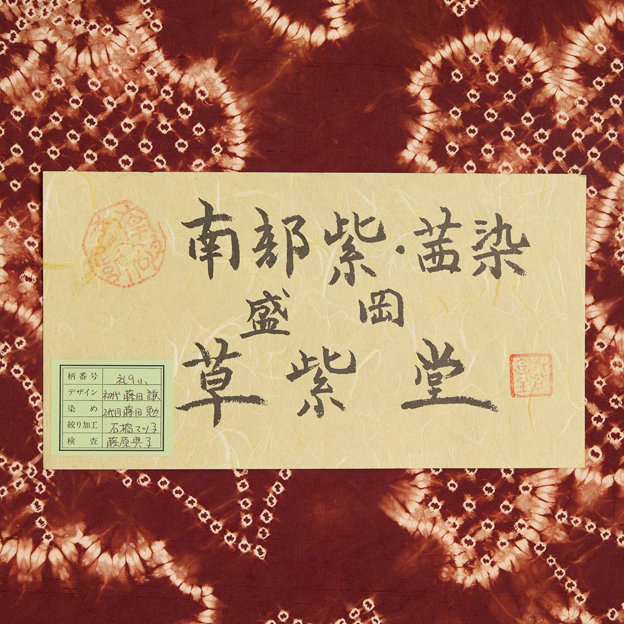 白山系の上質な絹の紬地に染められていて、しっとりとした抑えた光沢が茜染めの深い色と馴染んで、とても素敵な佇まいとなっています。