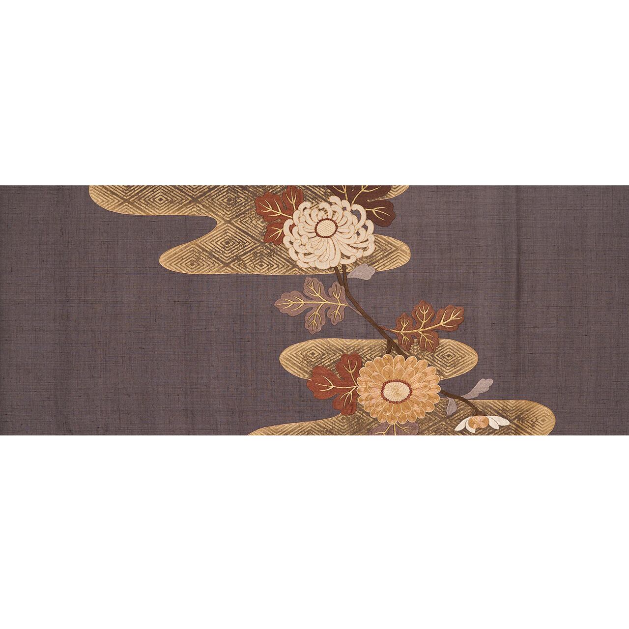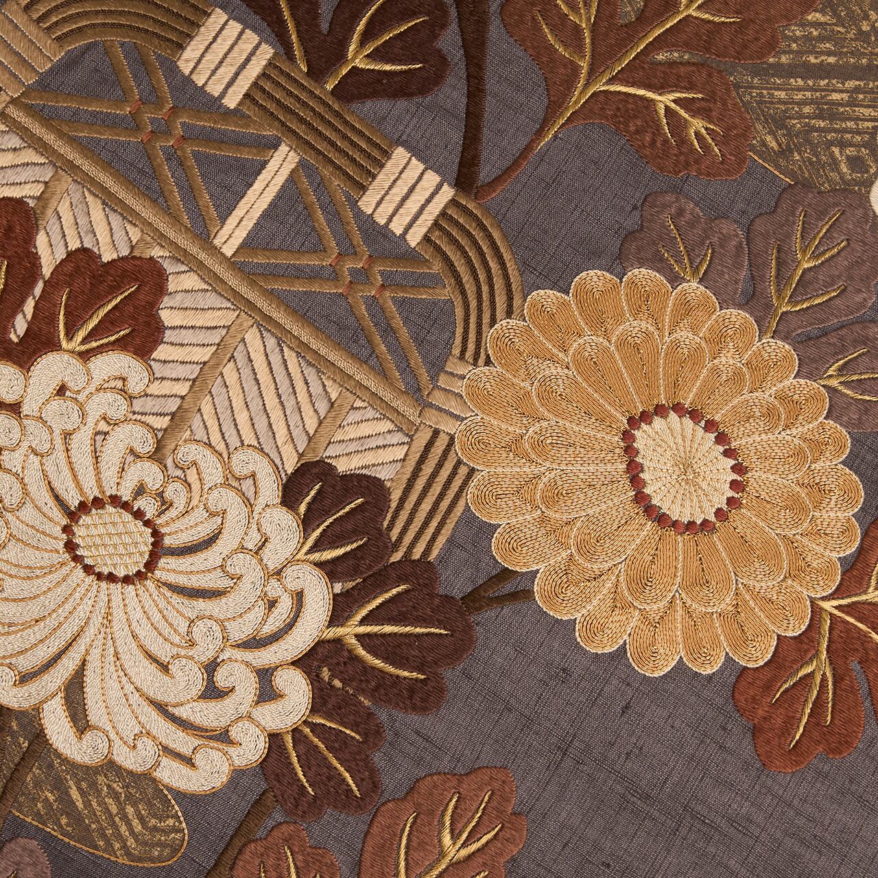 経緯に小さい節のある、結城機の軽くしなやかなで光沢のある紬の生地が、少しだけ紫味のある濃いグレー・涅色に染められ、霞取りの形に入子菱の模様が金の摺り箔で背景に描かれ、そこに満開に咲く菊のお花がたっぷりとした手刺繍で表された、とても豪華な雰囲気の袋帯です。