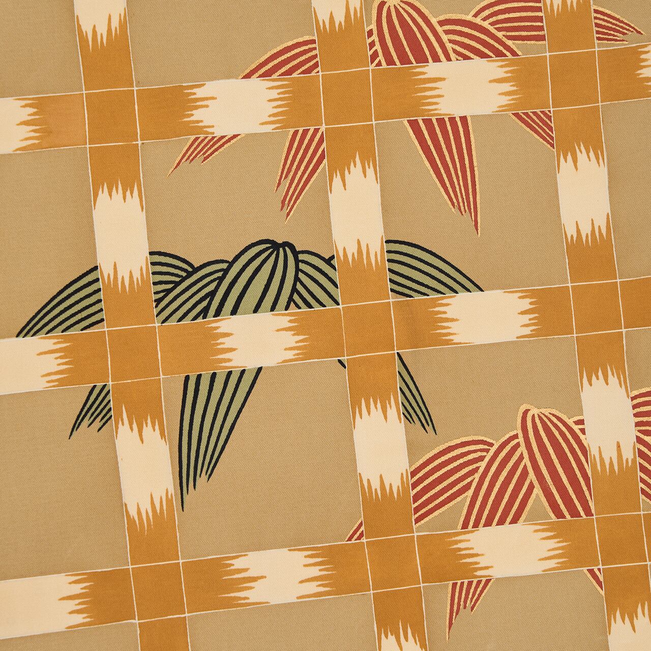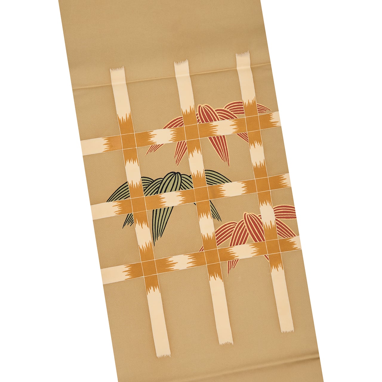 こっくりとした深いベージュ・白橡色のしっかりとした塩瀬の生地に、お太鼓には象牙色と黄唐茶色の垣根が描かれ、その向こうに繁る竹の葉は蘇芳色に金の縁取りと、柳染色に濃い鉄色の縁取りがされて、瑞々しく描かれています。
