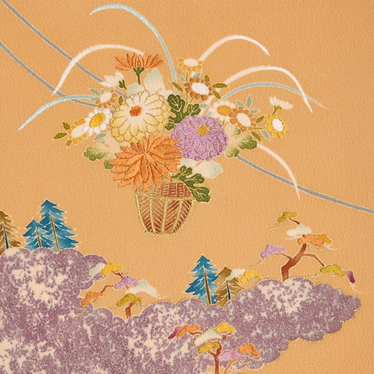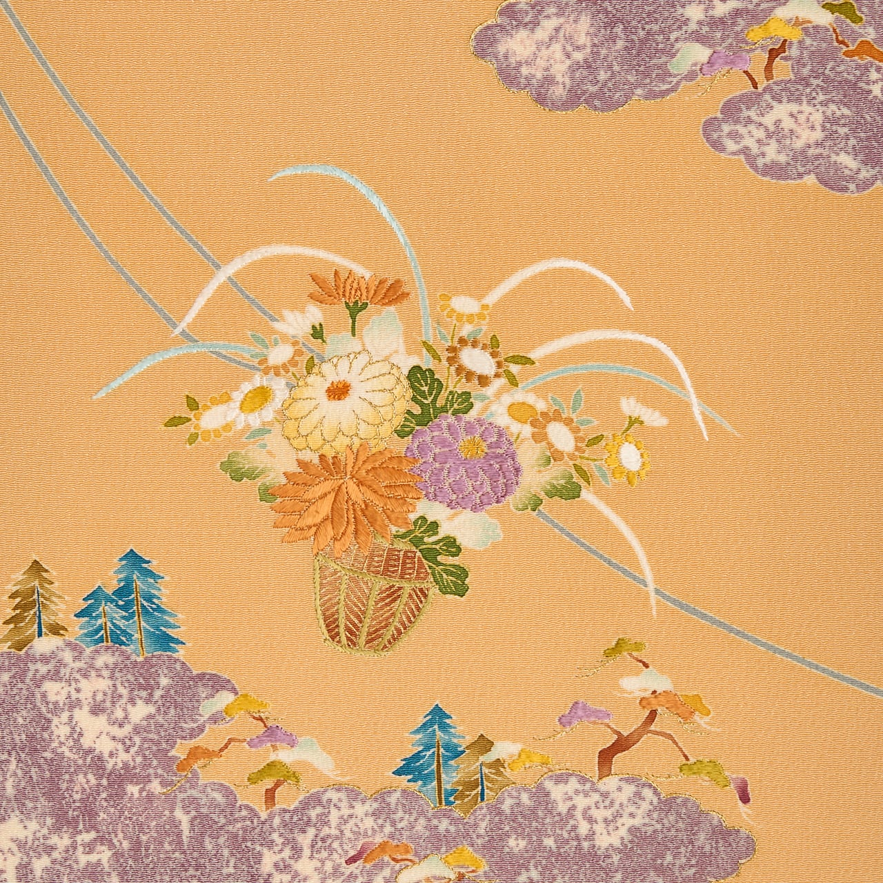 オレンジ味のある黄色・萱草色に染められた、少しシボのあるちりめん地のお太鼓の上下に、一珍染のように鳩羽色に染められたモクモクとした雲取りの模様が置かれ、そこに杉や松の木などが生えている風景を背景に、可愛らしい小さな籠に菊のお花が生けられている様子が手描きの友禅と手刺繍で表された、とても素敵な大彦さんの九寸名古屋帯です。