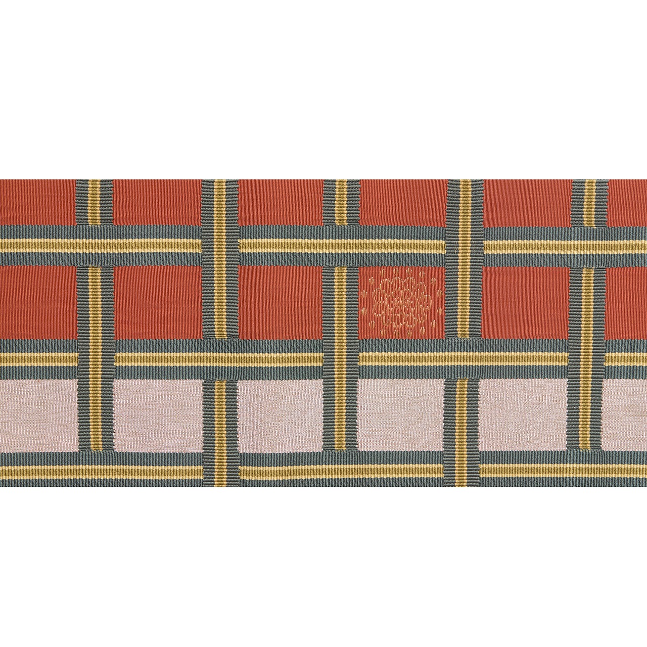 マットな質感の紅鳶色の綴れ織の地に、太く力強い調子の真田紐のような縞が経緯に交差した、きっぱりとした印象の格調高い格子の模様が織り出されています。