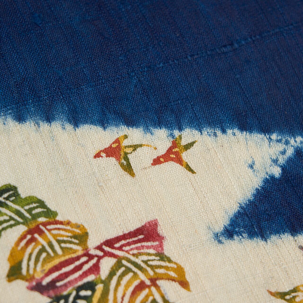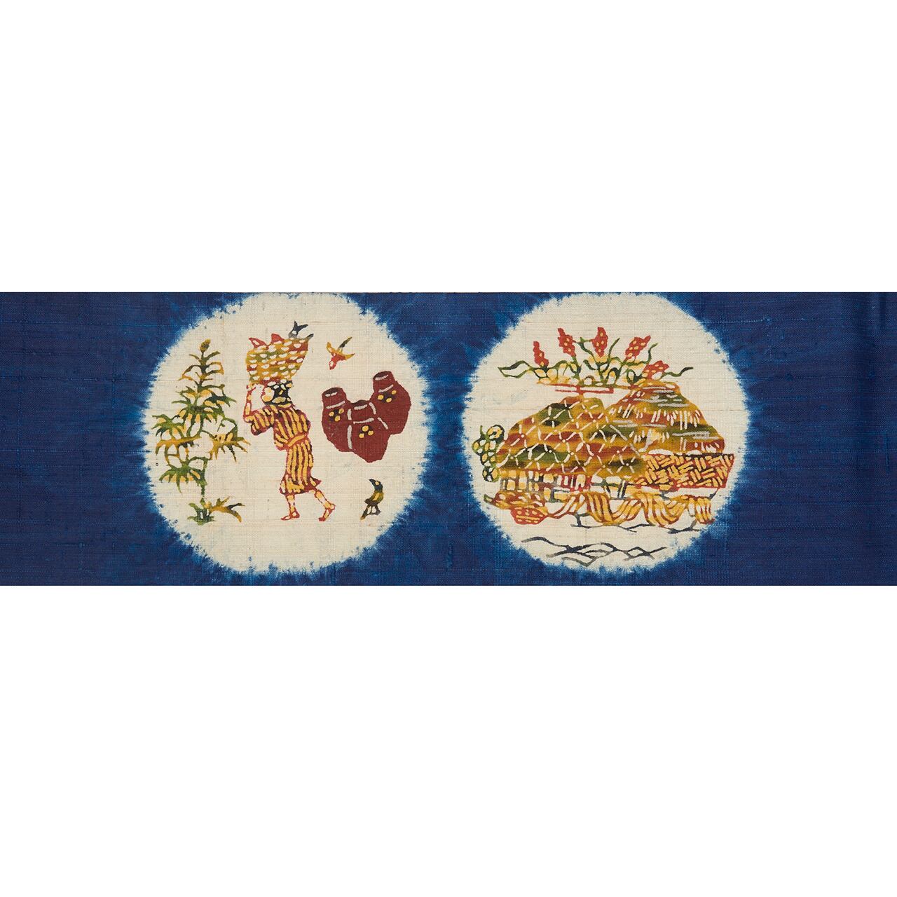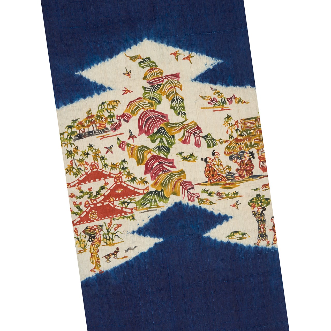 工芸的な型絵染の良さが全面に溢れていて、藍染めと白のコントラストも美しく、細やかな模様にも幸せそうな時間の流れを感じられる、大変おすすめの逸品です。