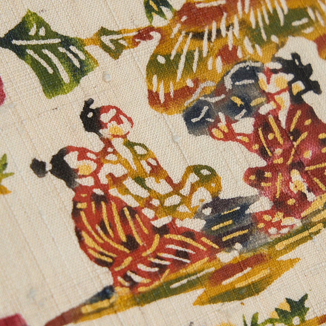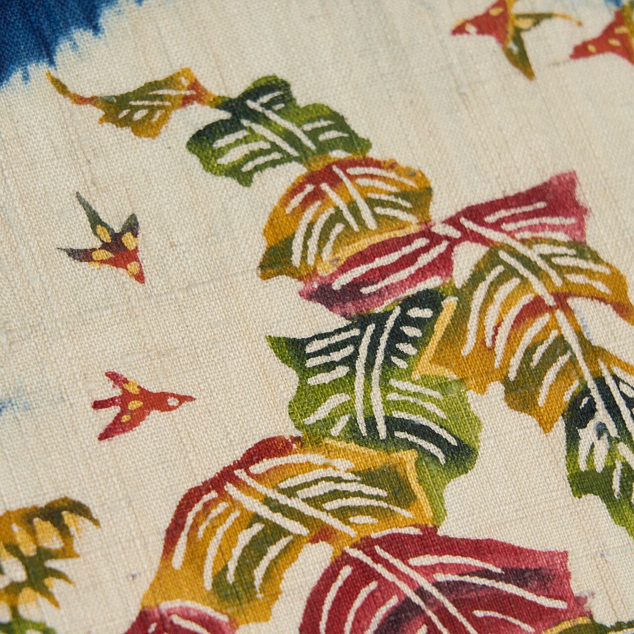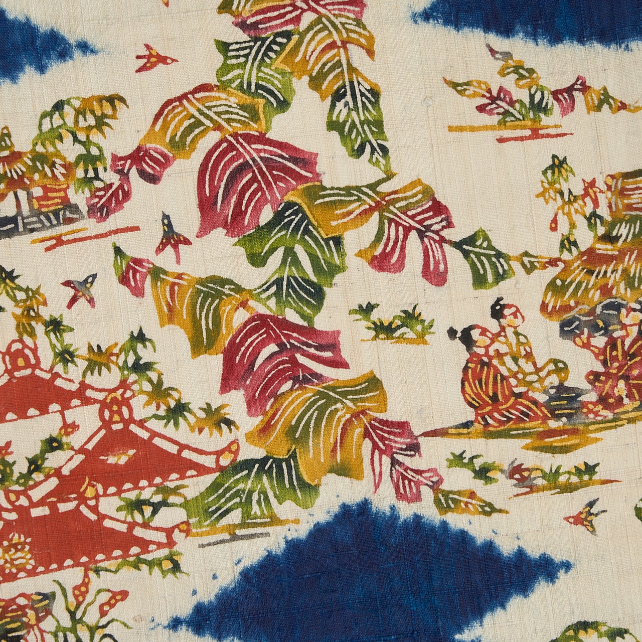 工芸的な型絵染の良さが全面に溢れていて、藍染めと白のコントラストも美しく、細やかな模様にも幸せそうな時間の流れを感じられる、大変おすすめの逸品です。